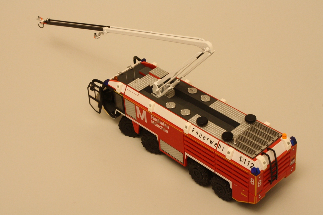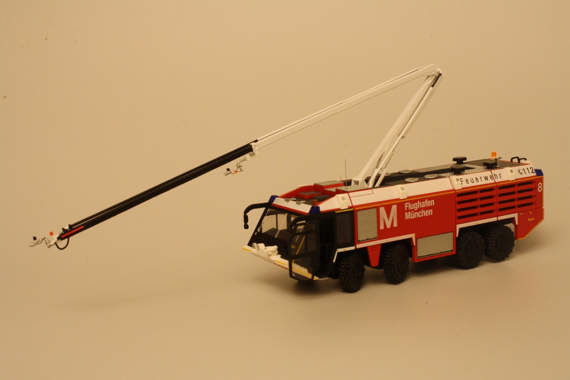 nach dem Umbau des Z8 des Nürnberger Airports musste nun der Cursor/Herpa Z8 in der Ausführung des Flughafgens München "dran glauben". Wer das Modell und das Original kennt, weiß, dass die Dachpartie des Münchner Fahrzeuges über der Frontscheibe deutlich abgeschrägt ist. Da die Formen für das Cursor/Herpa Modell jedoch für möglichst viele Versionen passen sollte, hatte man auf dieses Datail bewusst verzichtet. Dem vorbildorientierten Bastler ist bestimmt auch aufgefallen, dass der Snozzle-Löscharm zu weit hinten sitzt und bezüglich der Dimensionen und vor allem der Detaillierung noch zu wünschen übrig lässt. Der bei meinem Modell verwendete Löscharm ist der Prototyp eines künftig bei REINHARD MERLAU MODELLBAU erhältlichen Bausatzes. Die beiden Strahlrohr-Köpfe (am Teleskoparm und am Hauptarm) werden dabei direkt als Rapid-Prototyping-Teile beiliegen. Ansonsten wurde am Modell das Dach deutlich überarbeitet: Aussparung für Löscharm nach hinten verlängert; Befestigung des Löscharms nach vorne verlegt; ursprüngliche Aussparung verschlossen; größere Lukendeckel angebracht; Riffelblech angebracht; Dachpartie über Frontscheibe abgeändert; Fahrertüre offen dargestellt; Vorderachsen in Lenkposition; größere Lufthutzen angebracht.