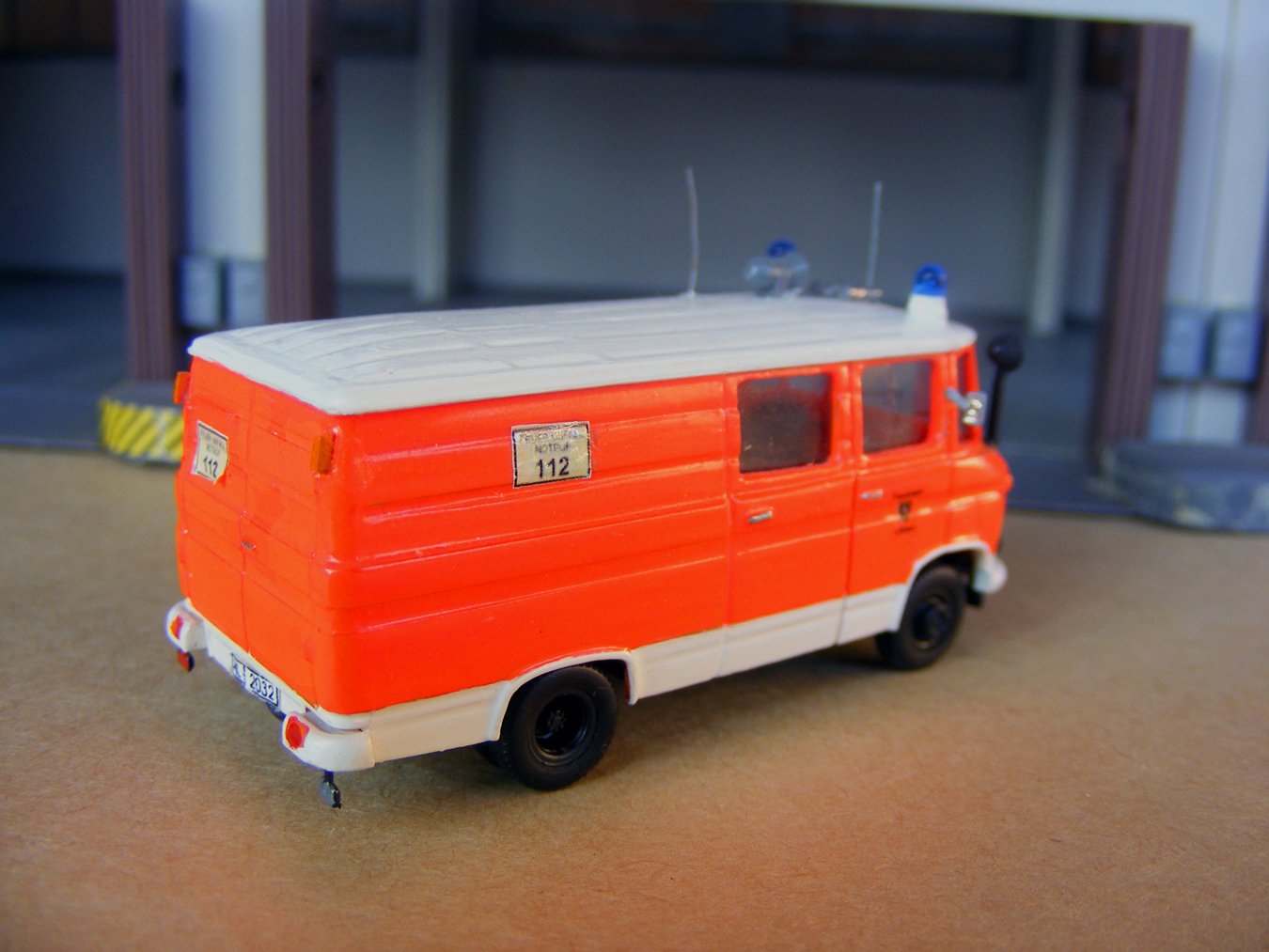 Zum Modell: Lieferant ist Wiking, Lackierung erfolgte in RAL 3026 und RAL 9010. Für Durchsagen war auf dem Dach ein Lautsprecher montiert. Die Notrufaufkleber wurden selber gedruckt