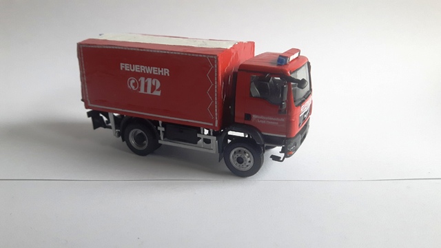 Das Modell enstand größenteils im Eigenbau, mit einem Führerhaus von Herpa. Der komplette Aufbau mit Ladebordwand und das Fahrgestell entstanden im Eigenbau. Die ganzen Kleinigkeiten wie z.B. die Halterung der Kraftstoffkanister und der Unterfahrschutz enstanden ebenfalls im Eigenbau aus Profilen.