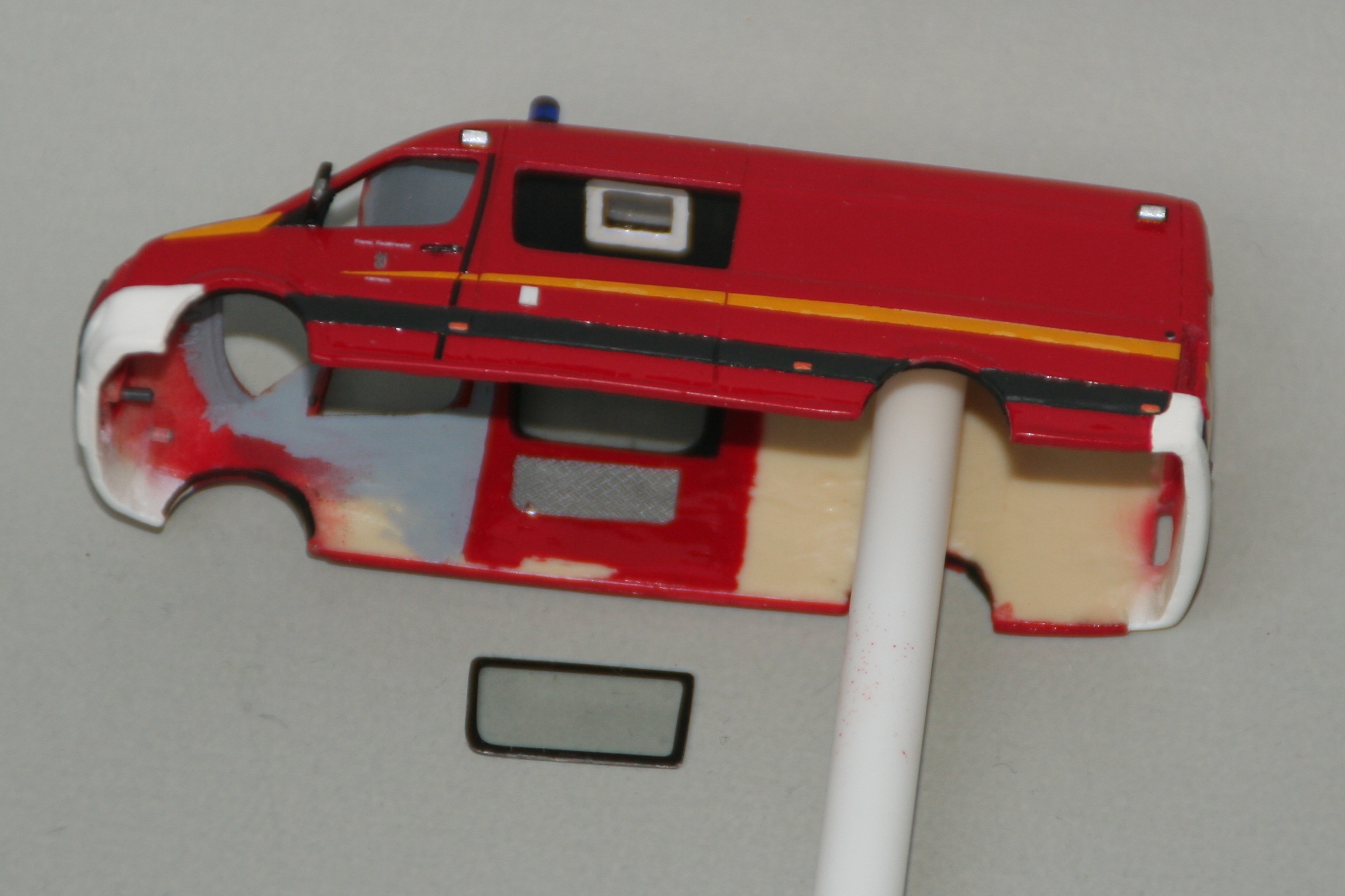 Die Decals sind größtenteils aufgebracht. Schwierig waren die gebogenen Seitenstreifen, die den natürlichen Karosserielinen des Crafter folgen. Ich habe sie mithilfe eines Kurvenlineals aus 3mm breiten Streifen von TL-Decals ausgeschnitten, obwohl aber nirgendwo eine größere Breite als 1,5mm benötigt wird. Die Seitenfenster habe ich einzeln aus einem Glaseinsatz von Herpa ausgesägt und zurecht gefeilt. So können sie originalkonform flächenbündig mit der Karosserie eingeklebt werden.