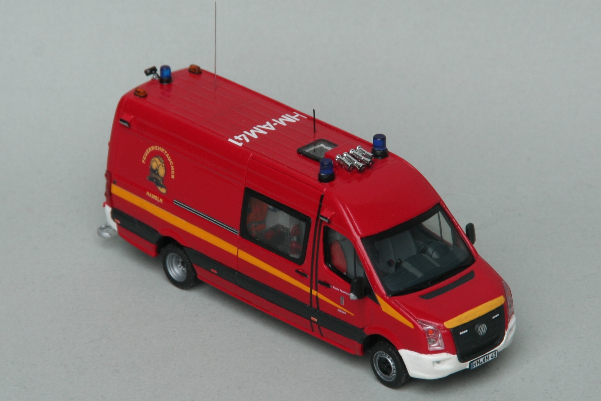 Irgendwann wollte ich dann nicht mehr weitere Farbe auf das Modell aufbringen, um Details nicht zu ertränken. An den meisten verbliebenen Problemstellen müssen noch Decals aufgebracht werden, so dass diese Stellen gut zu kaschieren sind. Für die Stoßstangen erinnerte ich mit an den Wahlspruch unserer Nichtlackierer: "Die beste Lackierung ist keine Lackierung." Deshalb habe ich in der Bucht noch das Herpa-Crafter-MZF der FF Wendelstein erstanden, um die in weißem Kunststoff gespritzten Teile zu verwenden. Glücklicherweise hatte ich nicht schon vorher die Stoßstangen am Resinmodell abgetrennt, denn die Herpa Originalteile erwiesen sich um gut einen Millimeter zu schmal und das wäre doch zu sehr aufgefallen. Nun soll es also mit dem Aufbringen der Decals weiter gehen.