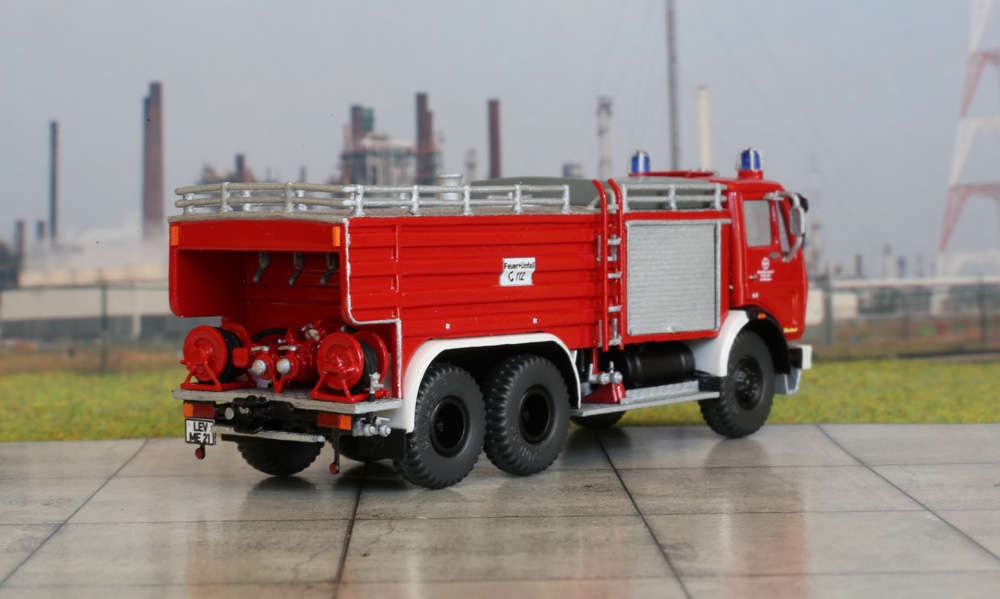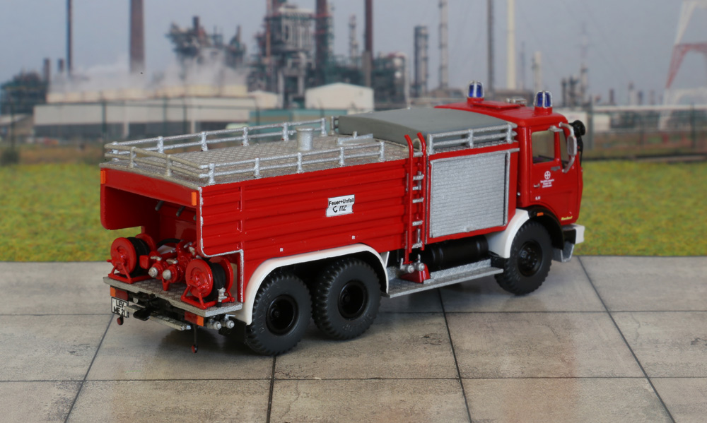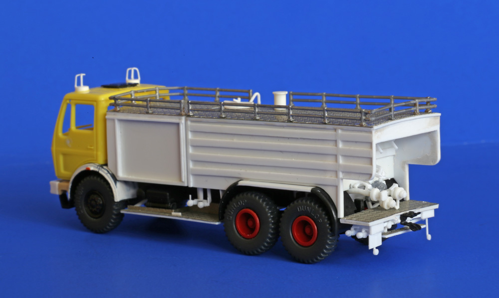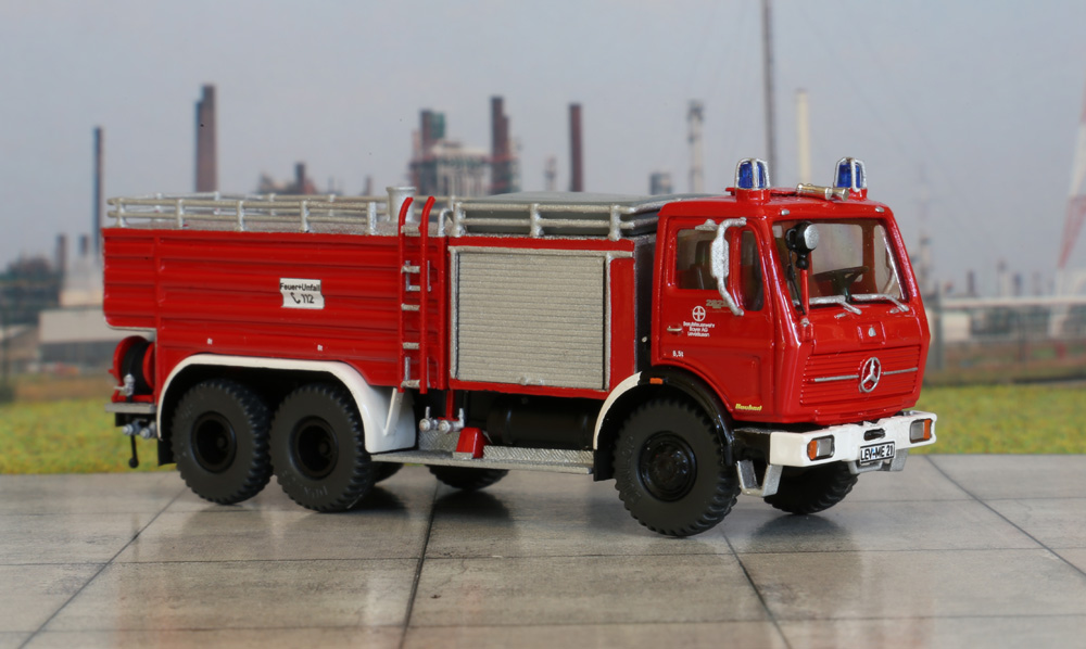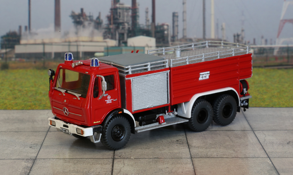 Auch hier dient wieder ein Herpa-Modell als Basis. Die großen Sandreifen sind von Preiser, ebenso die Auftritte und Stoßstange. Die Blaulichtbügel sind aus 0,3 mm Rundprofilen gebogen. Dazu habe ich eines unten nicht angeklebt um das Blaulicht nach dem lackieren noch darunter setzen zu können, was bei einem auch geklappt hat. Das andere ist leider abgebrochen und musste daher komplett wieder angeklebt werden. Aufbau ist wieder aus den bewährten Platten+Profilen mit FKS Blech darauf. Das Geländer ist stammt vom Roco-Leiterzurüstsatz (geht mir langsam aus, suche eine Alternative!!!). Der meiste Aufwand waren die Pumpe und Schnellangriffe, die fast so lange gedauert haben wie der Rest des Aufbaus. Die Pumpe habe ich hinten auf ein 1x mm-Profil geklebt, das nach dem lackieren in eine vorhandene Öffnung im Fahrgestellrahmen eingesetzt wurde.