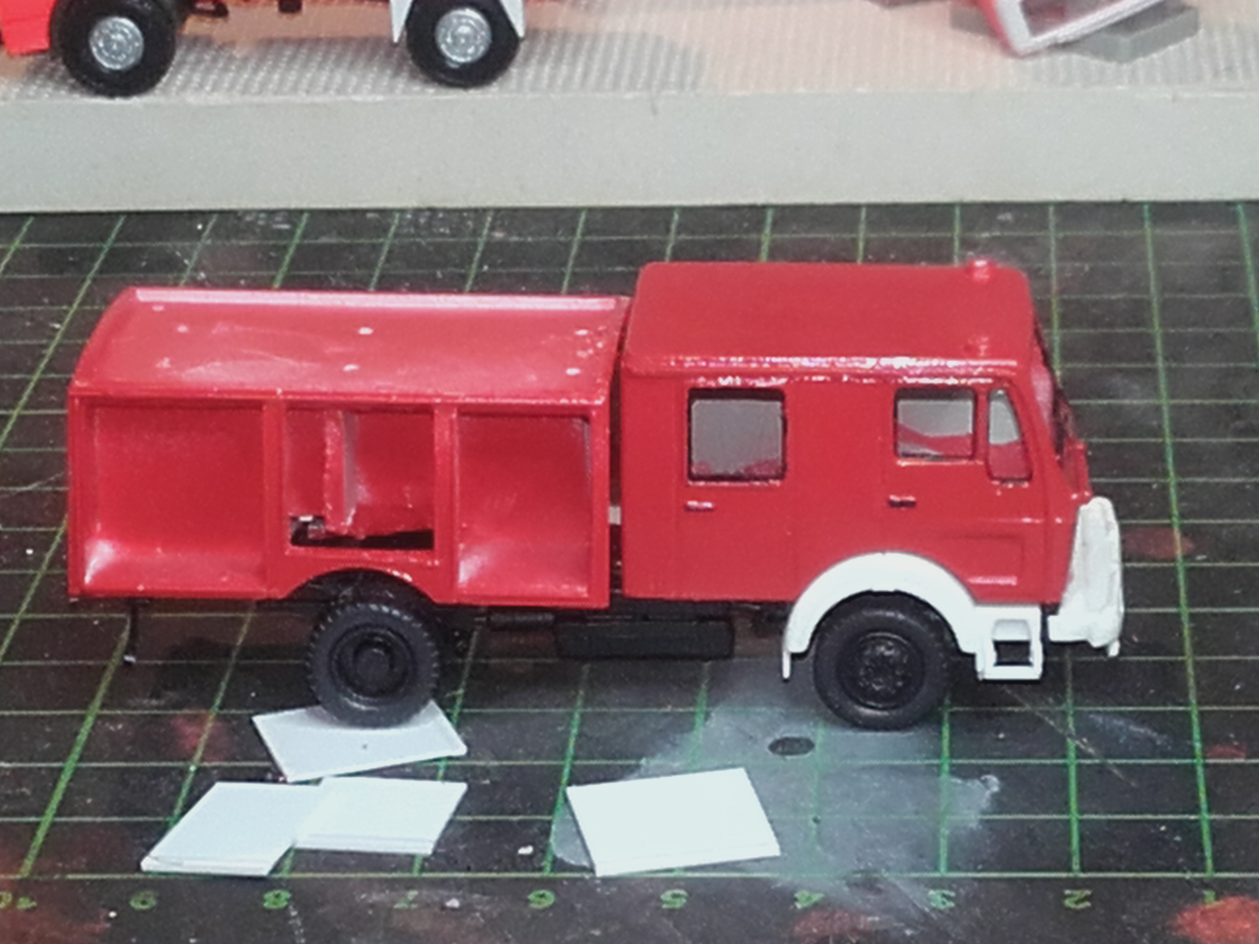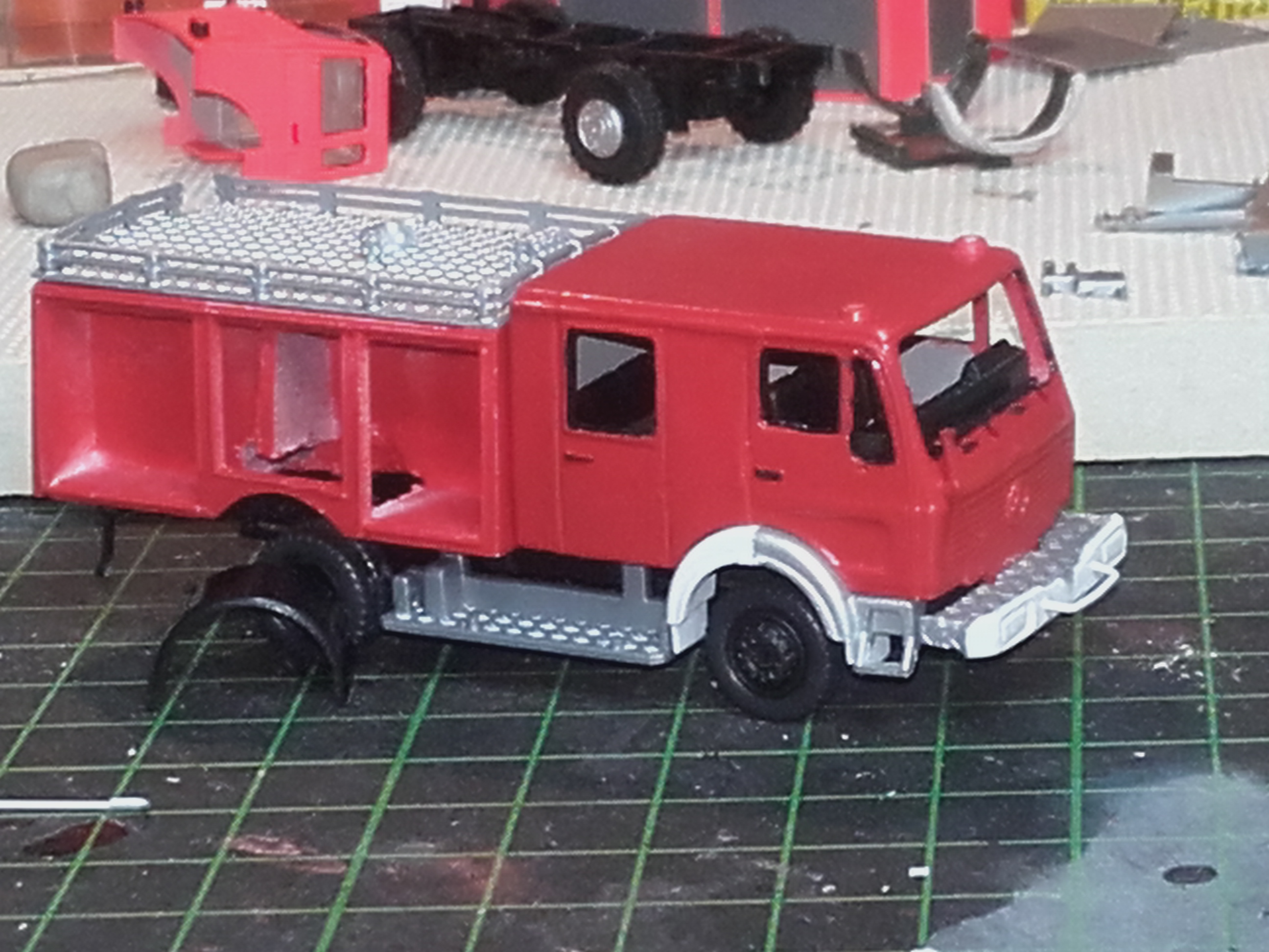 Die Stoßstange wurde nun mit 3d-Riffelblechdecals von Markus Hawerner belegt und anschliesend Lackiert. An den vorderen Kotflügel wurde die mittige Trennung verschlossen. Das Aufbaudach bekam eine Saugschlauchhalterung aus FKS-Riffelblech. Die Geräteraumverschlüsse wurden aus Evergreen-Platten nach "System Mischur" gebaut.