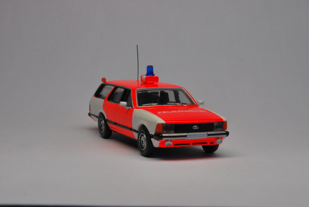 Das Grundmodell stammt von Brekina, wurde neu lackiert, erhielt neben einer Antenne (Tierhaarborste), Zusatzblinkern (Saugschlauch von Preiser in Scheiben geschnitten) und Nebelscheinwerfern (Ätzteile von MBSK) eine zeitgenössische Rundumtonkombination Hella RTK-3 von Roco.