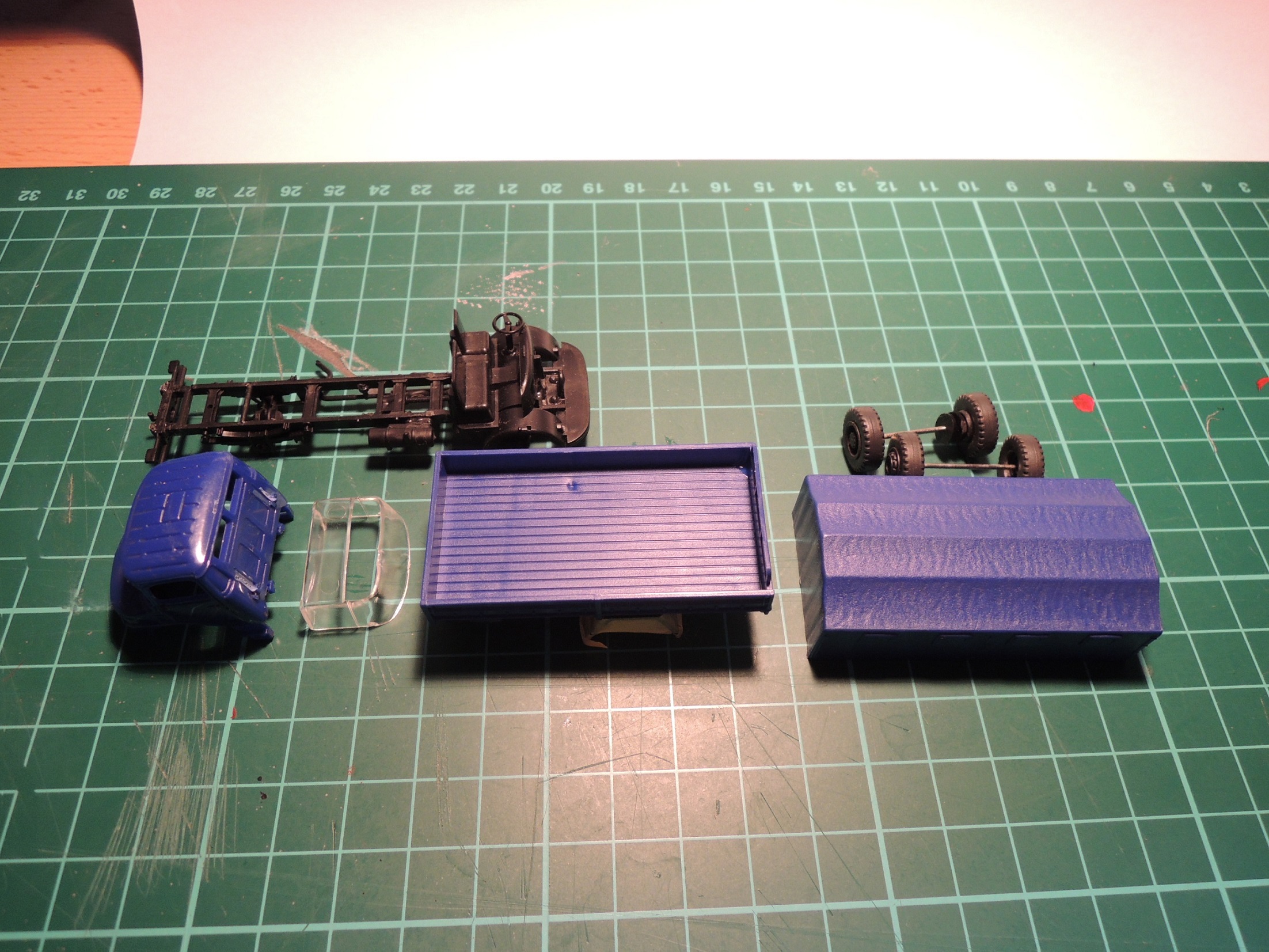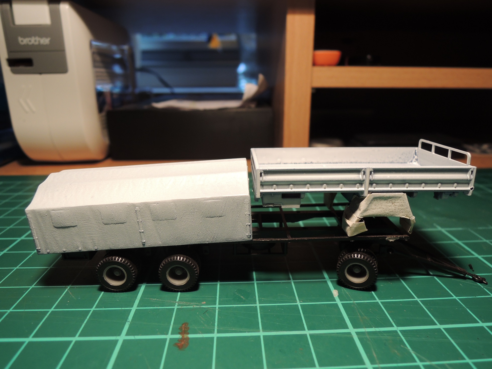 Wie bei jedem Bausatz erfolgt der grobe Zusammenbau. Die Plane des Pritschenaufbaus hat beim Modell angedeutete Fenster, die jedoch beim Original nicht vorhanden sind. So habe ich diese abgeschliffen und das Ergebnis sieht so aus