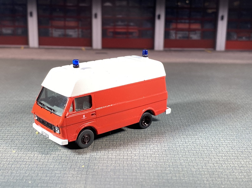 Das Fahrzeug entstand aus zwei Herpa-Modellen einfachster Art, die im Bereich der Seitentür (hinten und vorn) auseinandergesägt wurden. So bekommt man die ungefähre Länge des Fahrzeuge in der L-Version. Anschließend wurden die Teile zusammengeklebt und nach dem Trockenvorgang gespachtelt (Revell-Plasto). Nach ausgiebiger Trocknung plan geschliffen. Lackierung mit weiß matt und feuerrot von Revell Aqua. Das Dach ebenfalls verlängert (Hochdächer gab es mal vor knapp dreißig Jahren als Zubehör), Blaulichsockel (flach !!) aufgeklebt und mit weiß seidenmatt lackiert. Das Ganze nach dem Durchtrocknen und dem Anbringen der Decals aus eigener Herstellung mit zwei Schichten Klarlack versiegelt.