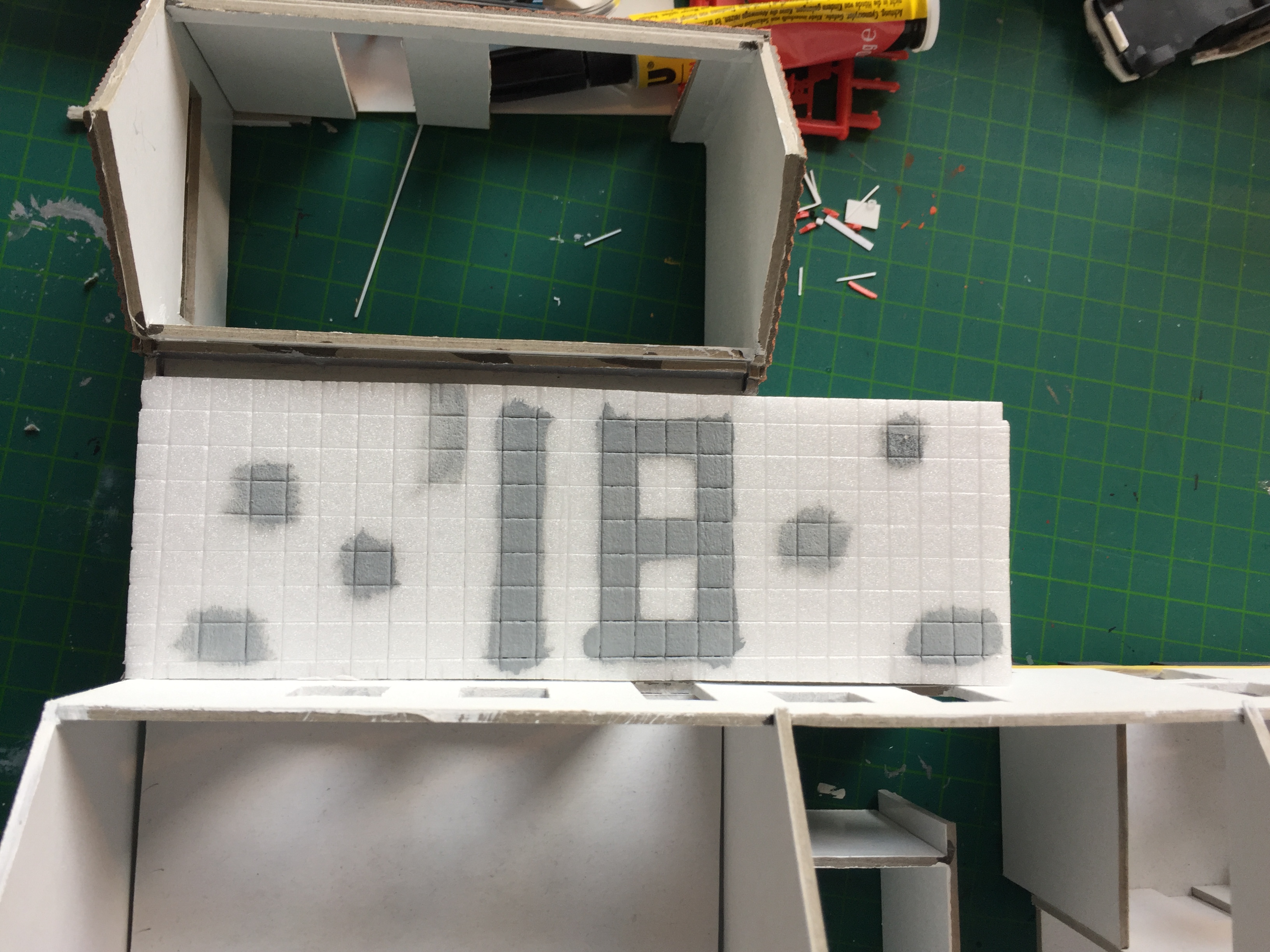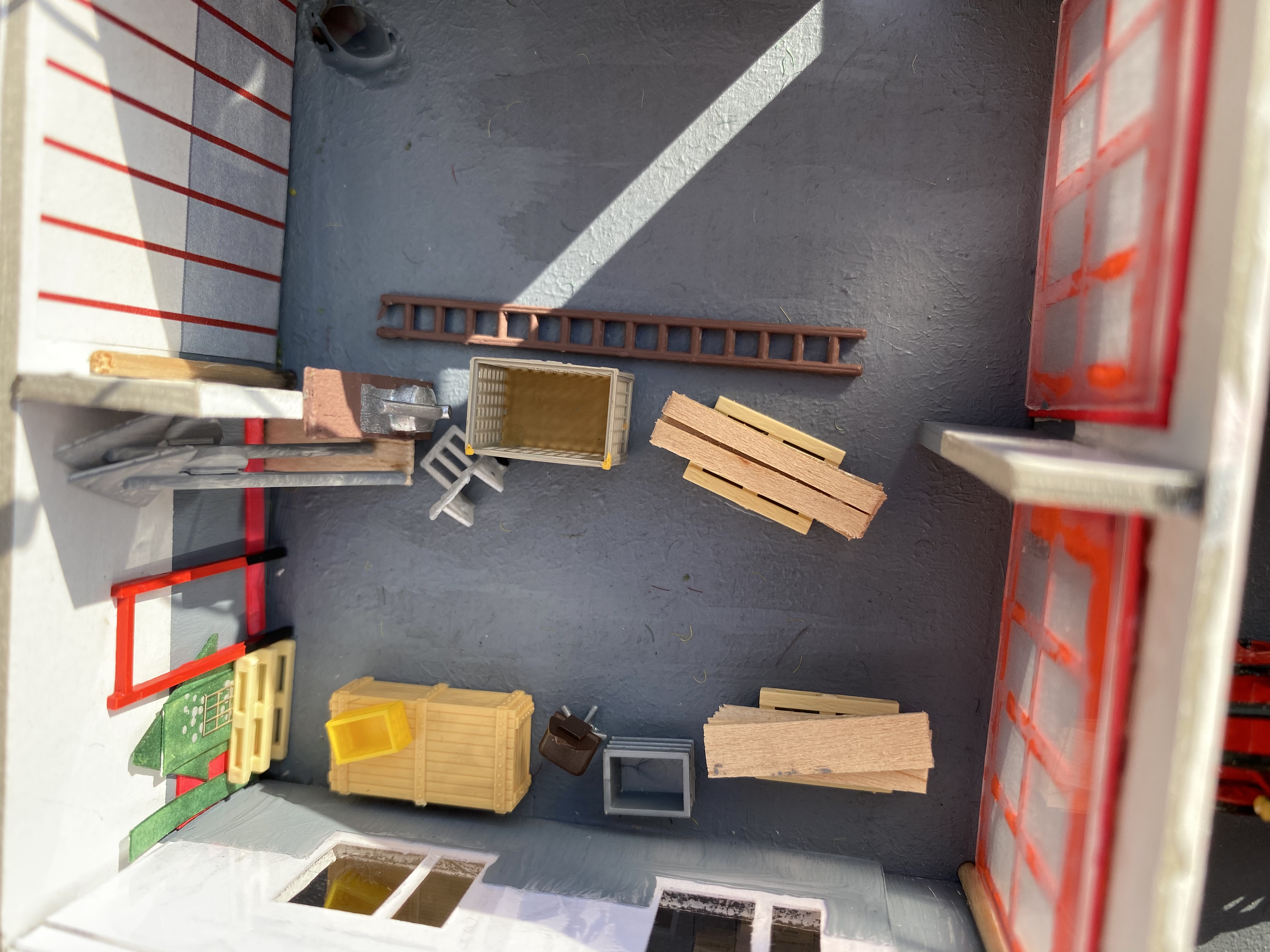 Die Maße wurden auf dicke Architekturpappe übertragen und mit Hilfe von Luftaufnahmen und diversen Plänen daraus dann die Gebäudeteile erstellt. Weitere Bauteile stammen aus dem Modellbaufachhandel und wurden schlussendlich bemalt, lackiert, verwittert und mit diversen und vor allem unzähligen (und auch winzigsten) Bauteilen ausgestaltet.