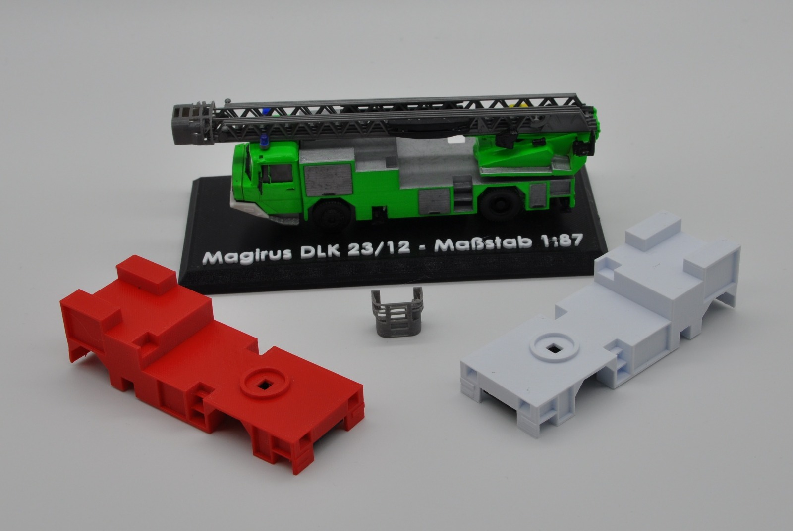 Heute wird es erst mal grün. Ich habe eine DLK 23/12 n.B. gebaut. Die Inspiration kam aus der Schweiz. Das Fahrerhaus und der Leitersatz stammen von Preisen. Der Rest ist aus dem 3 D Drucker. Lackiert wurde wieder mit der Spraydose.