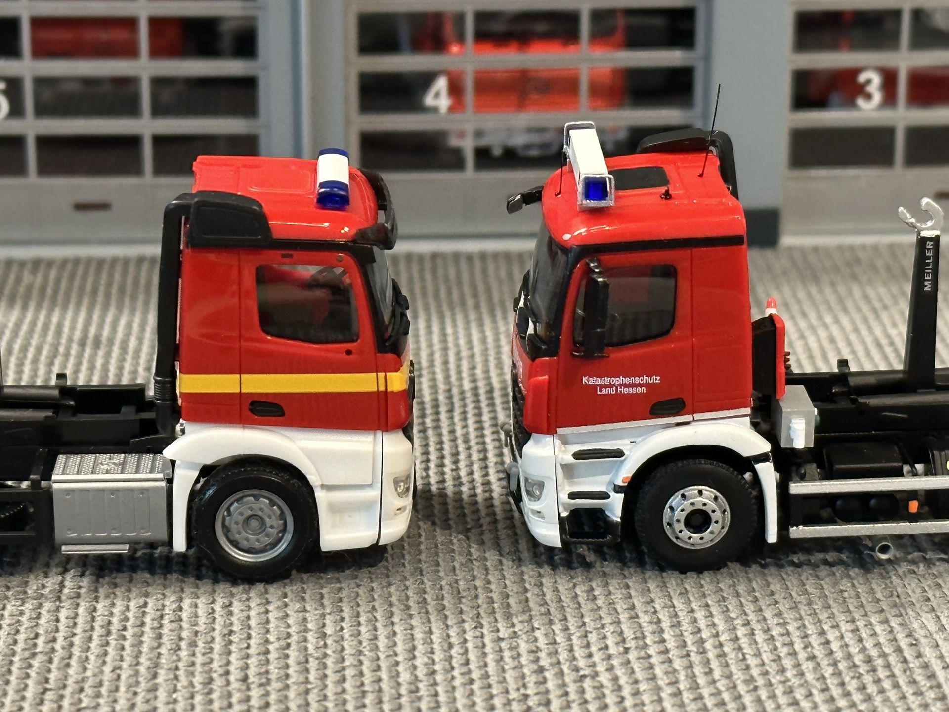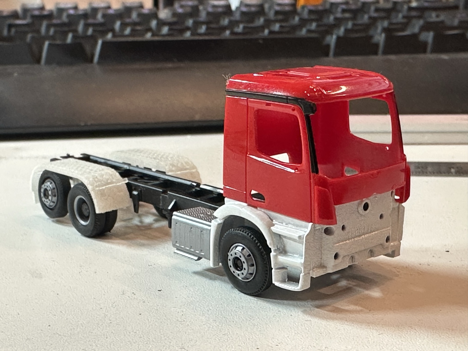 Die Kabine inkl. Kotflügel und Stoßstange stammen ebenfalls von Herpa und wurden aus verschiedenen Modellen zusammengestellt. Während der Kotflügel und die Kabine vom Arocs stammen, kommt die Stoßstange vom Antos. Die Kotflügel wurden umgebaut, da hier wie beim Original die oberste Trittstufe offen ist. Das Herpa Modell und auch der Wiking Antos/Arocs, haben an dieser Stelle leider die Variante mit der geschlossenen oberen Trittstufe.