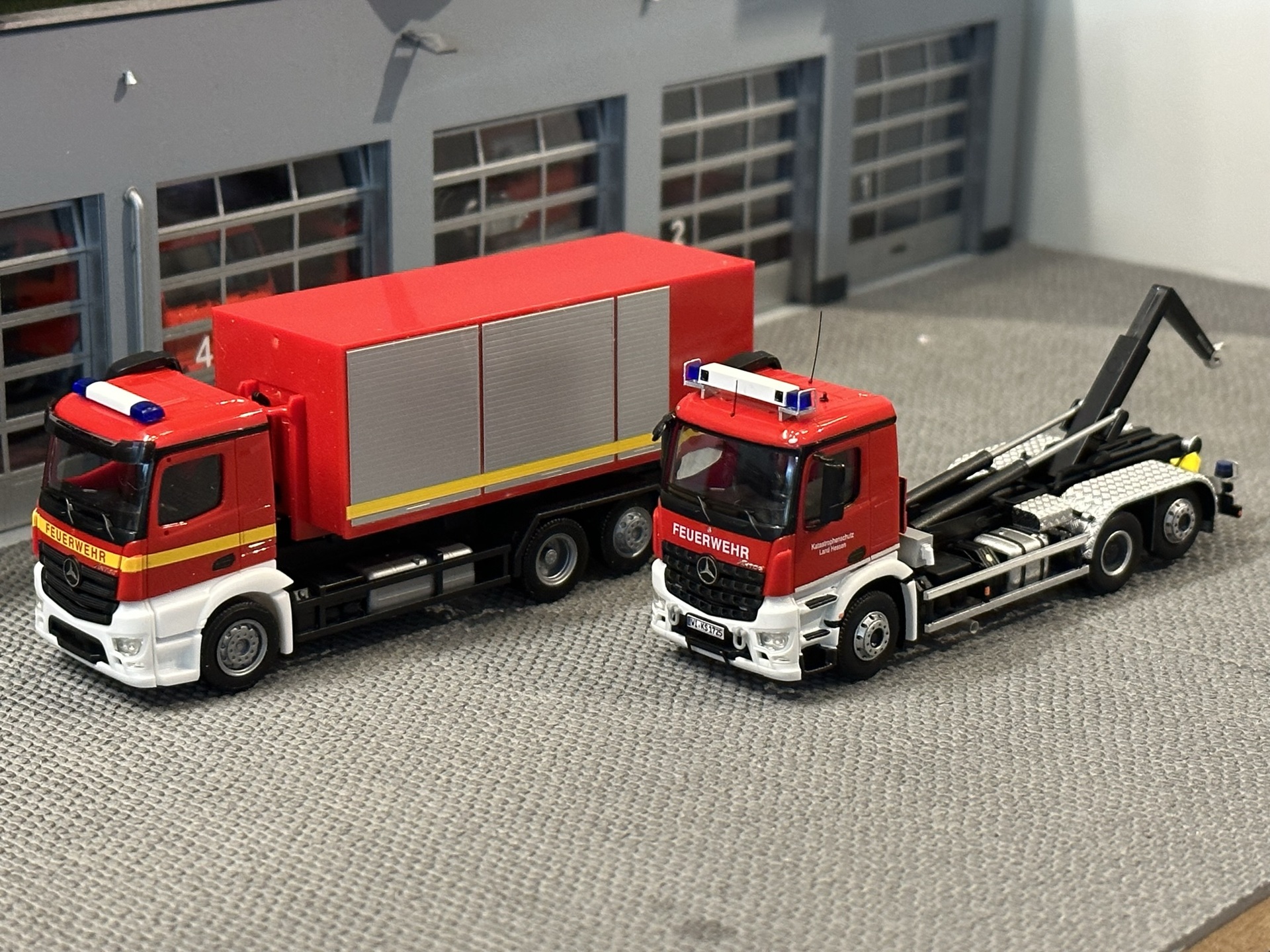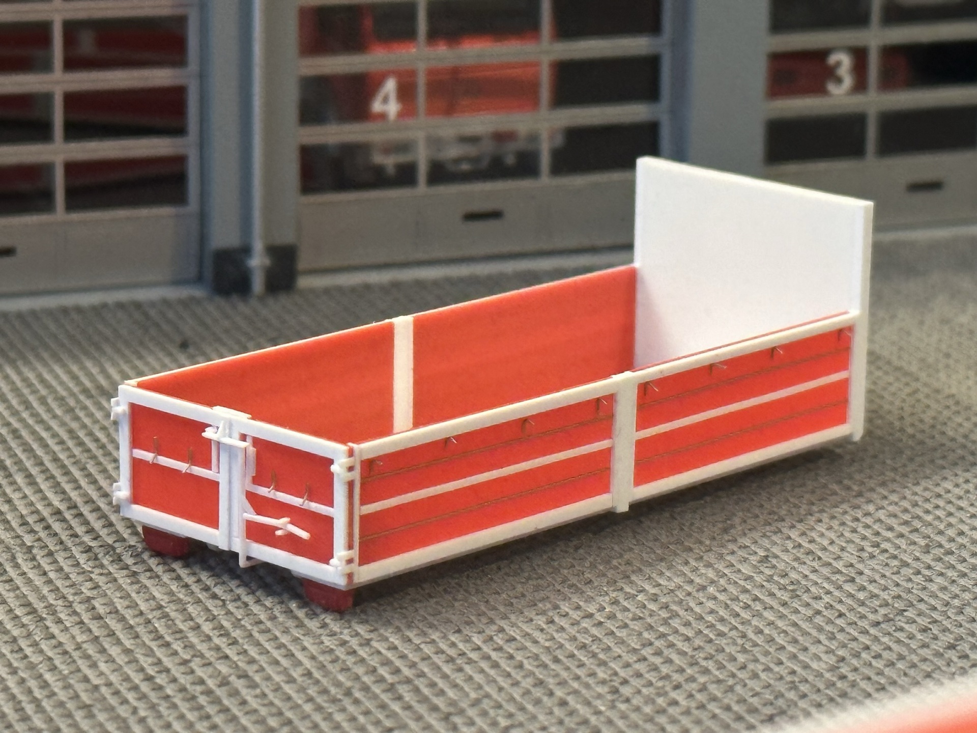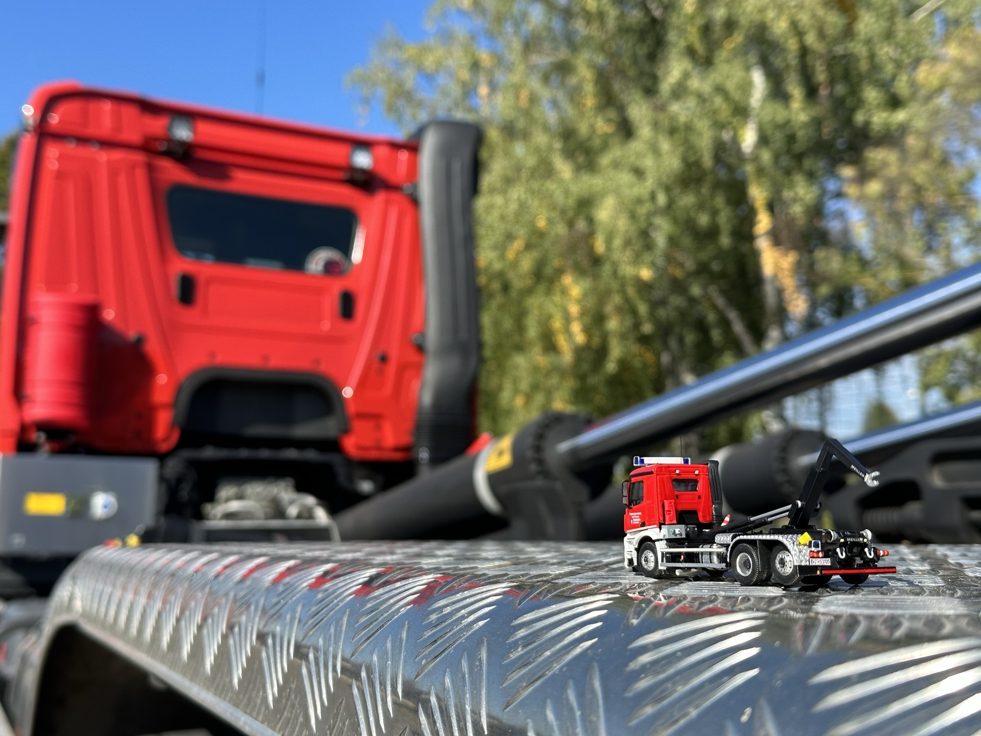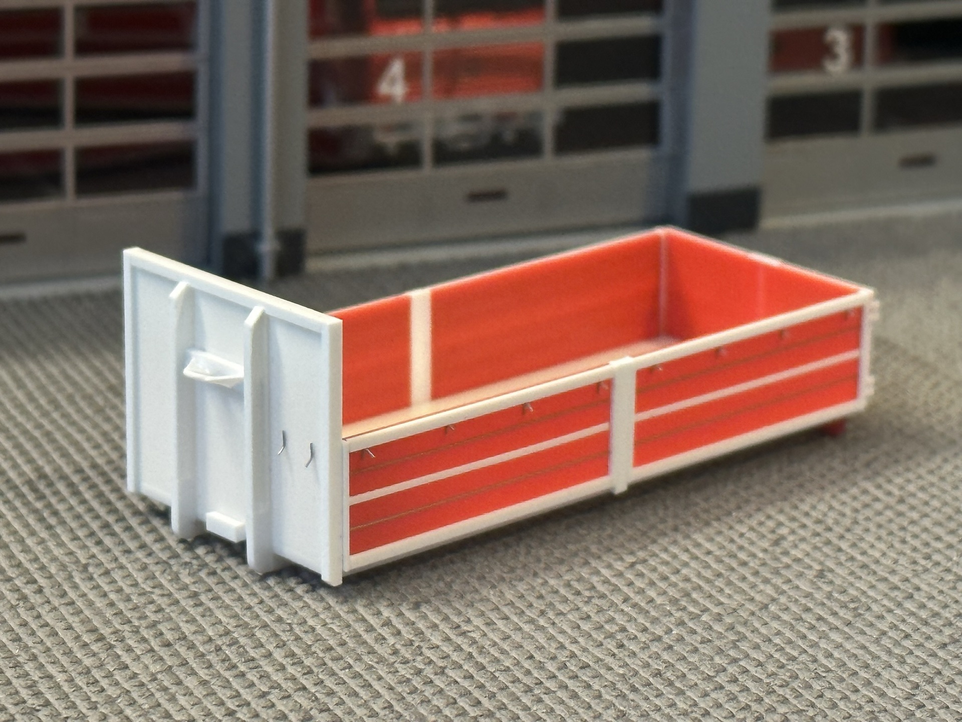Das Modell entstand aus dem WLF Fahrgestell von Herpa Miniaturmodelle. Dieses wurde gekürzt um den Radstand von 4.500mm (im Original) zu erreichen. Diverse Anbauteile stammen von DS-Design, Weinert und Preiser. Der Abrollbehälter hingegen entstand komplett in guter alter Scratch-Bauweise.