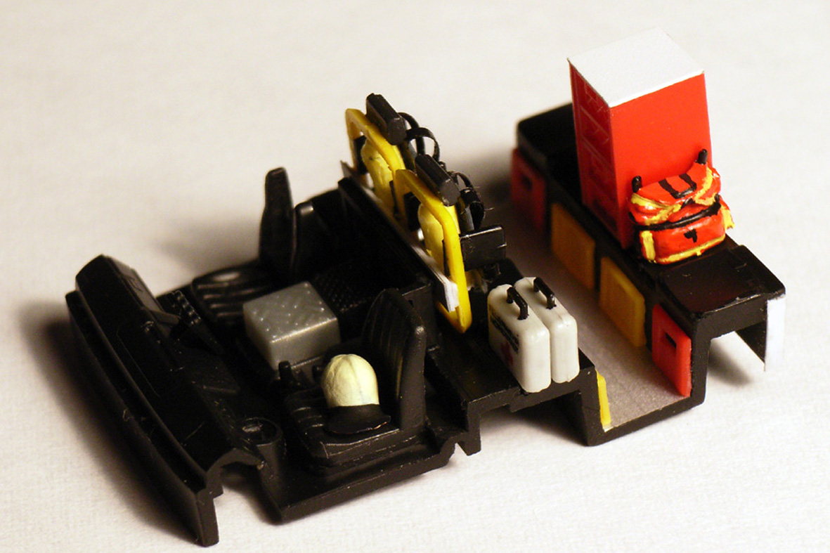 Weil der serienmäßige Heckaufstieg gegen eine filigranere Leiter von Preiser ausgetauscht wird, passen natürlich die Befestigungslöcher nicht mehr. Ein Stiefelschutz aus mattschwarzer Folie wirkt da Wunder. Die Fugen der Verkehrsleiteinrichtung habe ich farblich behandelt, dadurch wirkt sie noch plastischer! Die in Nordstadt üblichen Fahrdraht-Hochspannungs-Warnblitze und die Bedienungshinweise für die LEH waren dann auch die ersten Decals für's neue HLF.