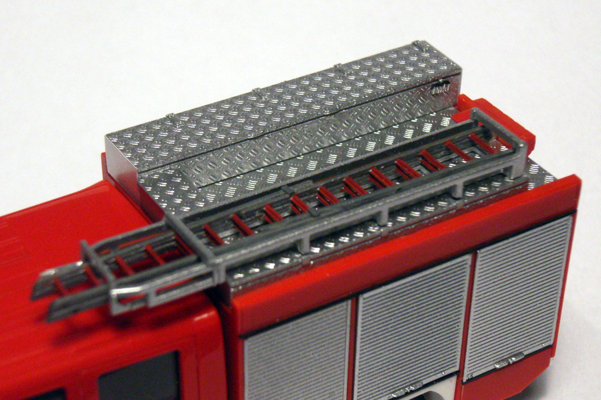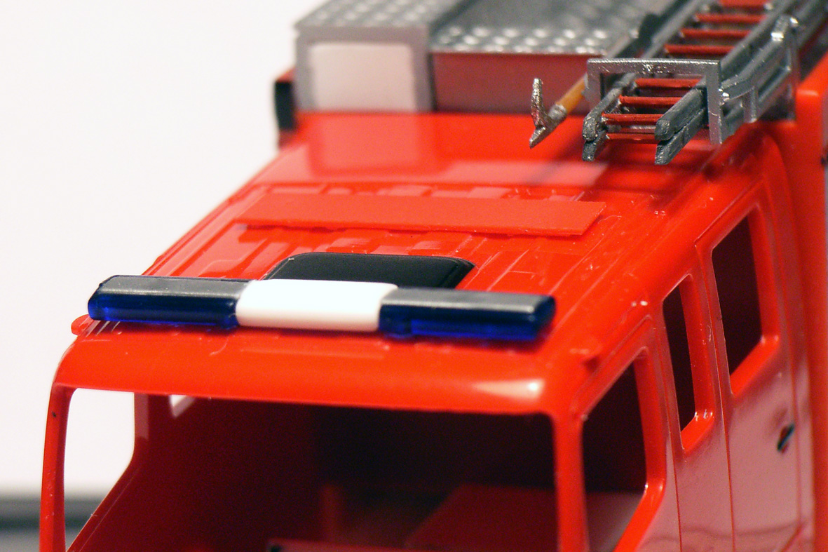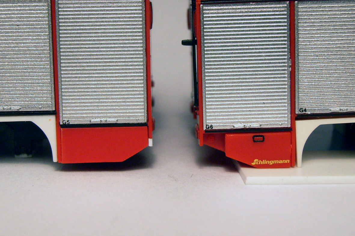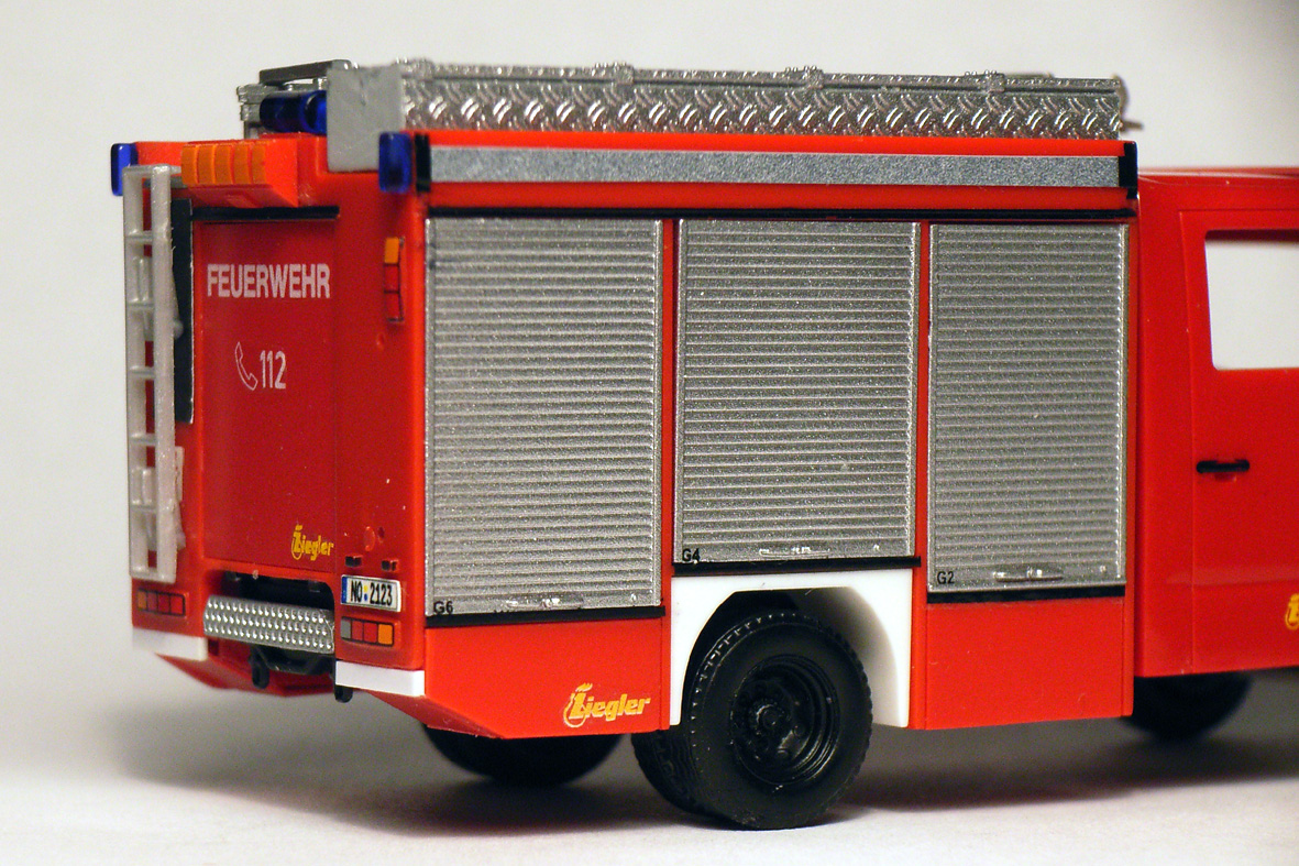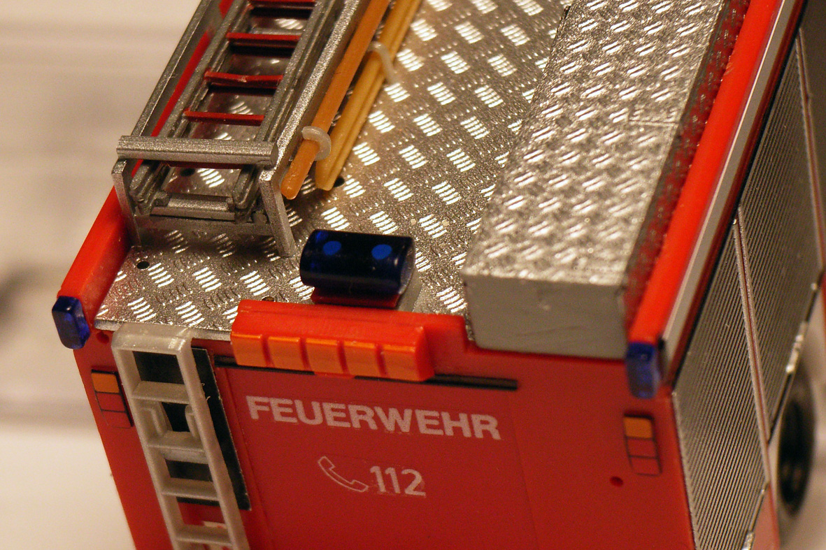 Das Heck ist fast fertig; es fehlen nur noch ein paar "Verkleidungen" am Dachgerätekasten und für die Löcher der ehemaligen LEH. Die Traversenkästen sind ebenfalls komplett, genau wie die neue Trittstufe am Pumpenstand und der neue Heckaufstieg! Fehlen eigentlich nur noch ein paar zusätzliche Farbtupfer - und evtl. ein kleiner Lichtmast (?), um die zwei Bohrungen im Heckblech zu verdecken! Unbedingt notwendig für die Verwandlung vom Schlingmann zum Ziegler ist aber die Dachblende mit der Umfeldbeleuchtung und ihren typischen T-förmigen Endstücken aus schwarzem Decal!