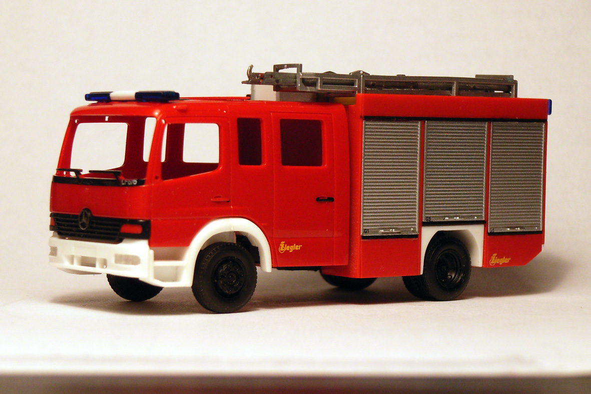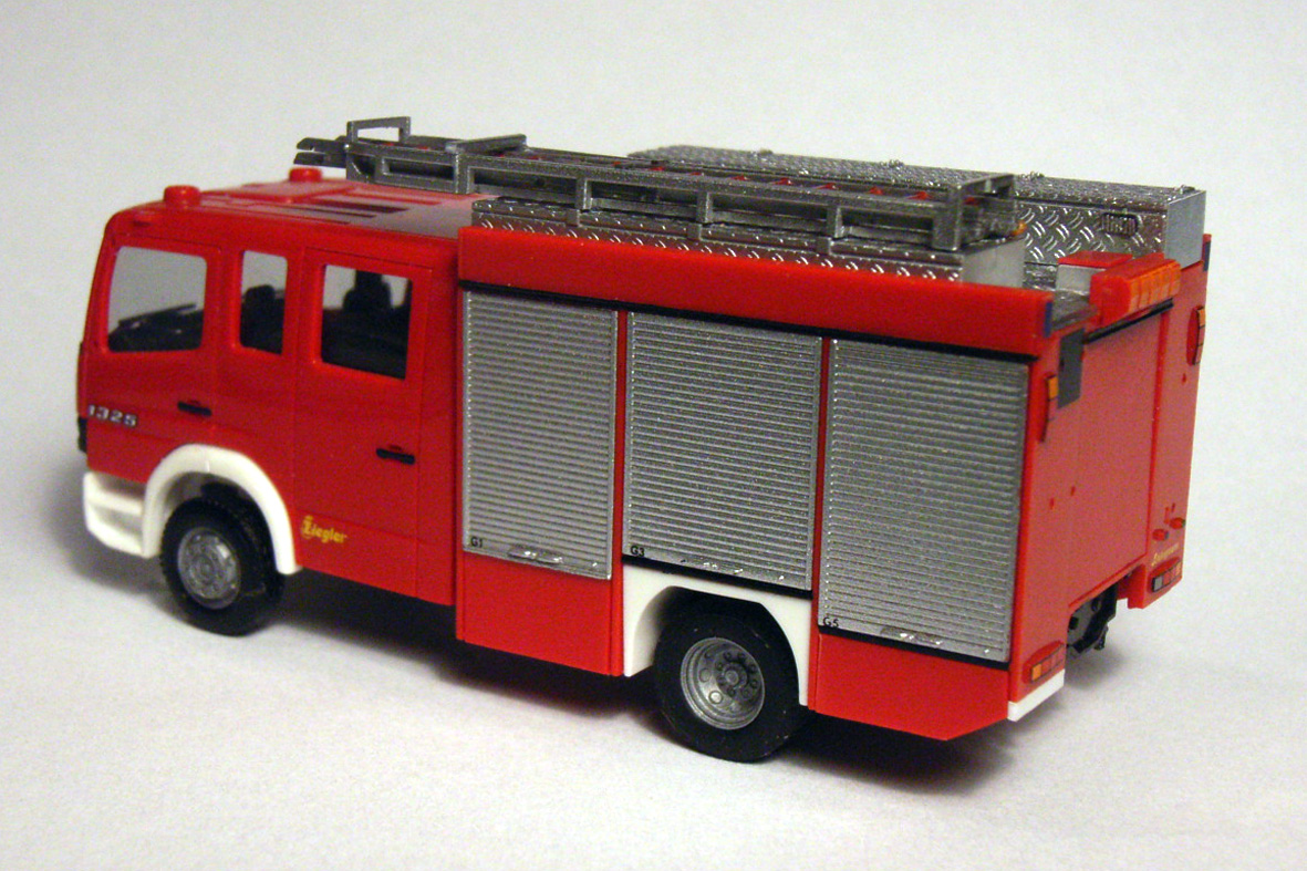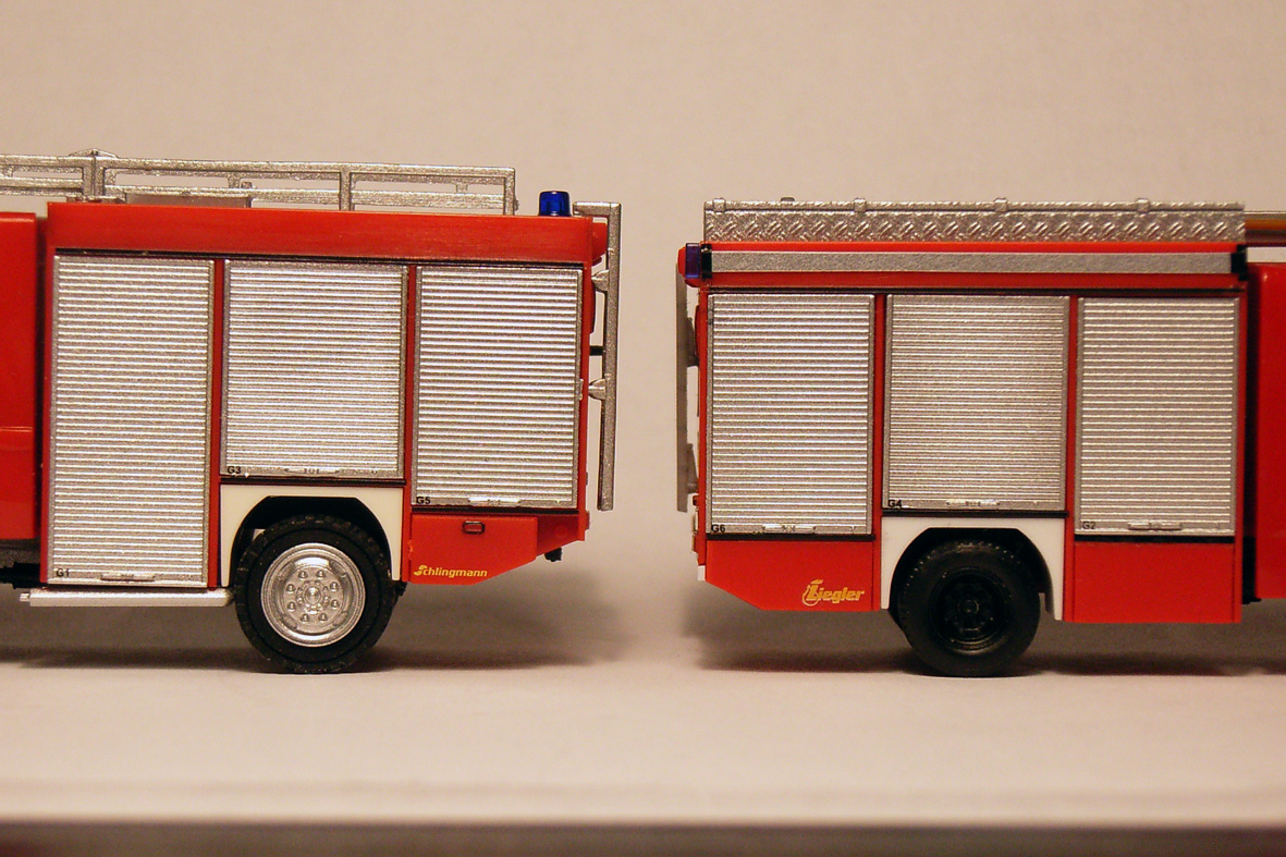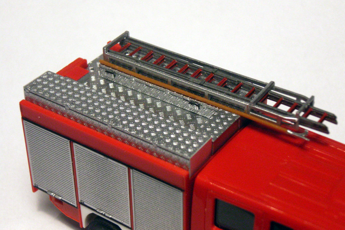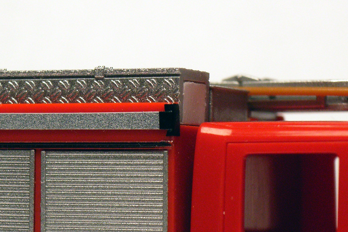 Das Heck ist fast fertig; es fehlen nur noch ein paar "Verkleidungen" am Dachgerätekasten und für die Löcher der ehemaligen LEH. Die Traversenkästen sind ebenfalls komplett, genau wie die neue Trittstufe am Pumpenstand und der neue Heckaufstieg! Fehlen eigentlich nur noch ein paar zusätzliche Farbtupfer - und evtl. ein kleiner Lichtmast (?), um die zwei Bohrungen im Heckblech zu verdecken! Unbedingt notwendig für die Verwandlung vom Schlingmann zum Ziegler ist aber die Dachblende mit der Umfeldbeleuchtung und ihren typischen T-förmigen Endstücken aus schwarzem Decal!