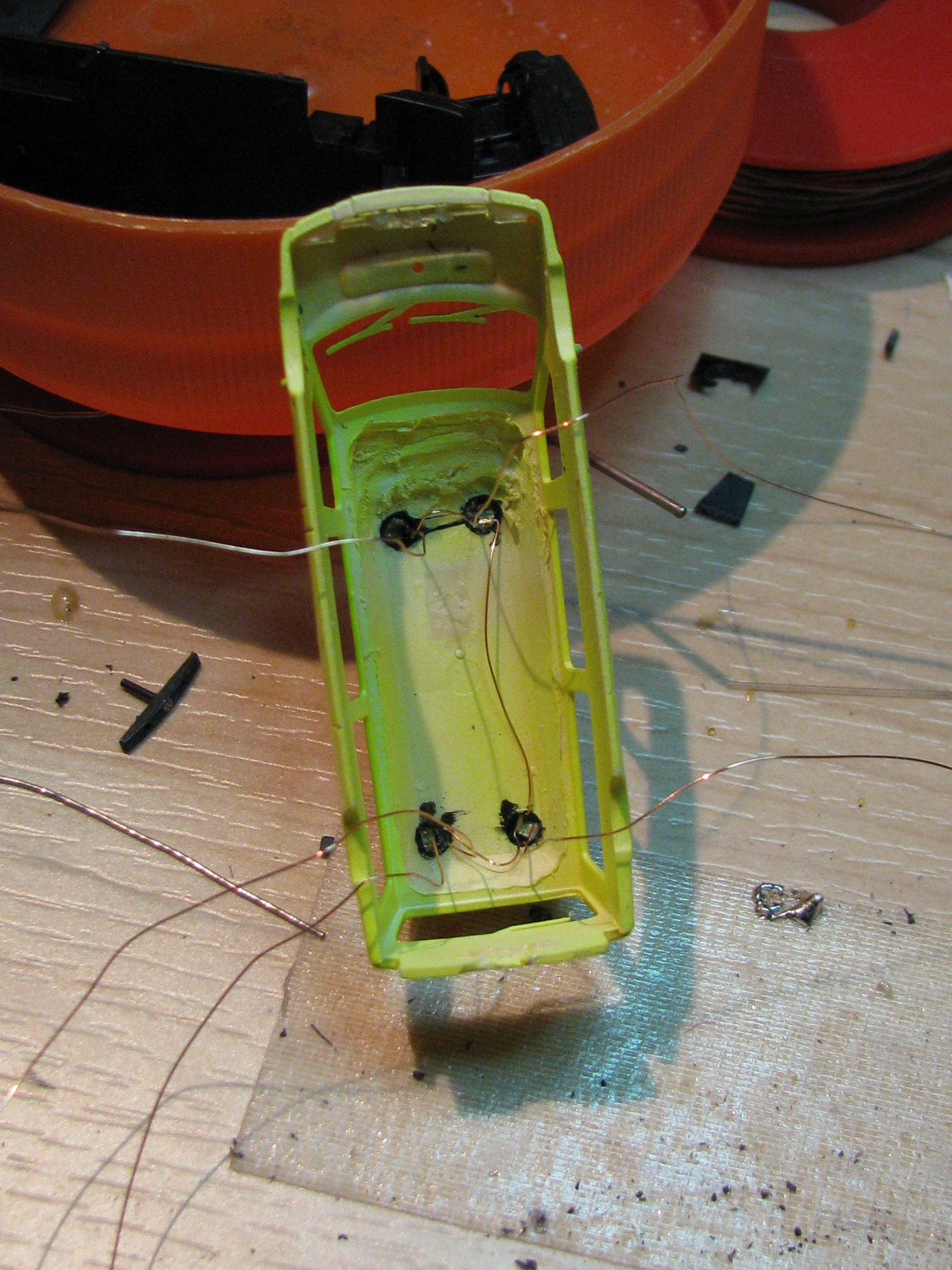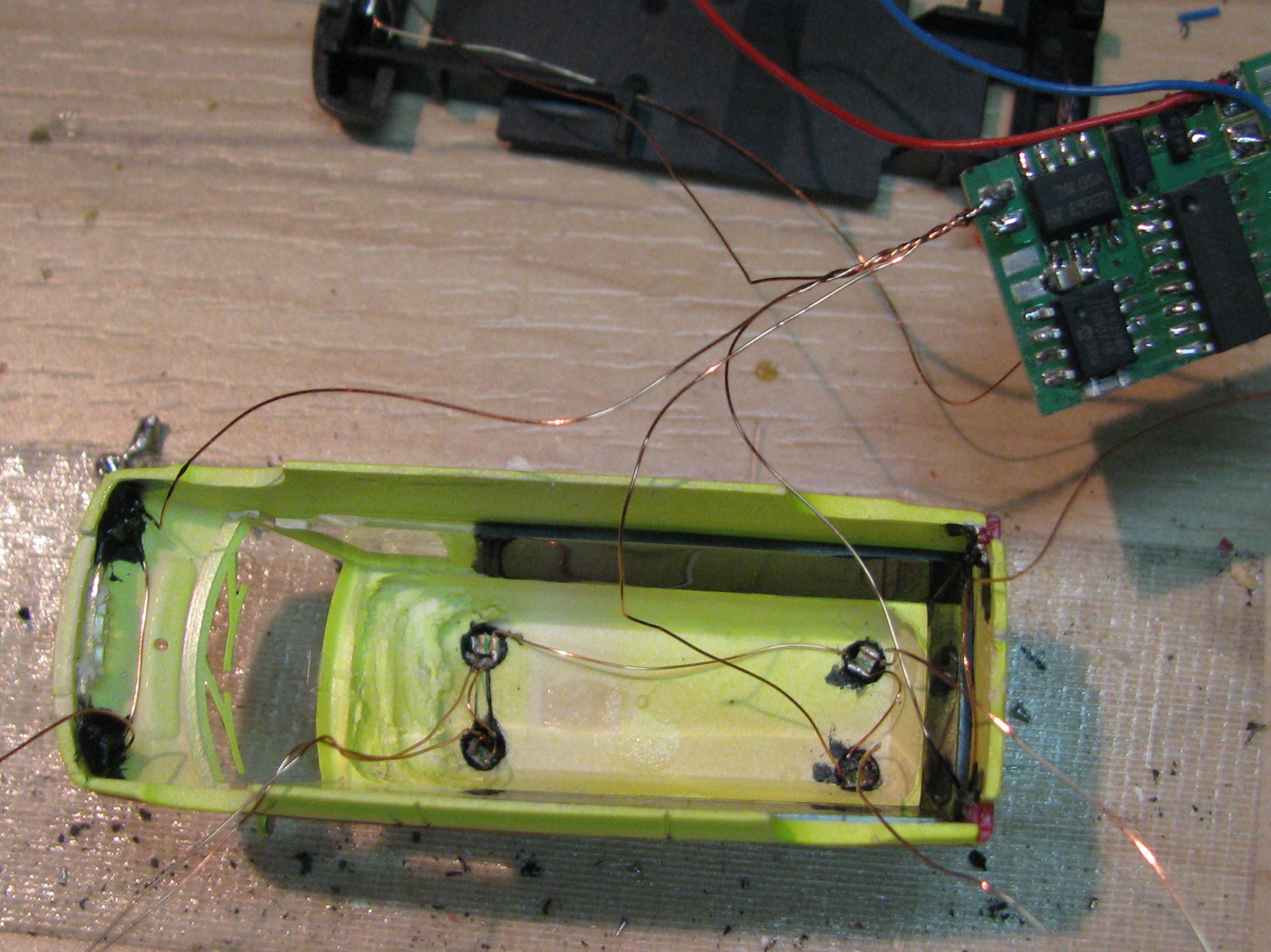 Um ein paar Kabel zu sparen hab ich die 4 Blaulichtleds vom Dach auf ein +Kabel gelötet, das spart 3 Kabel. Achtung: Polarität beachten! Des weiteren sind die 2 Frontblitzleds, 2 Frontscheinwerferleds und die 2 Rücklichtleds in Reihe geschalten, was nochmal 6 Kabel einspart.