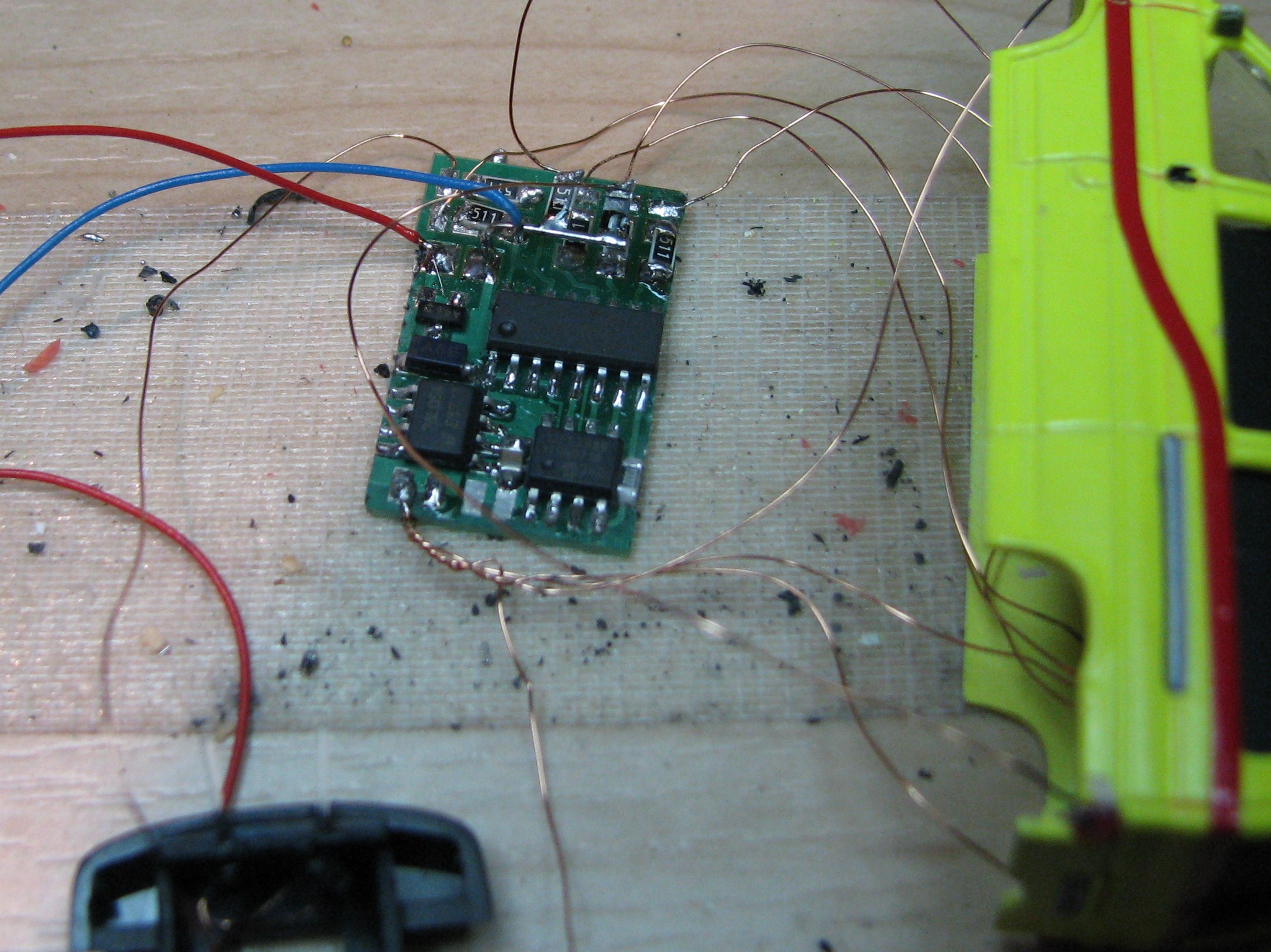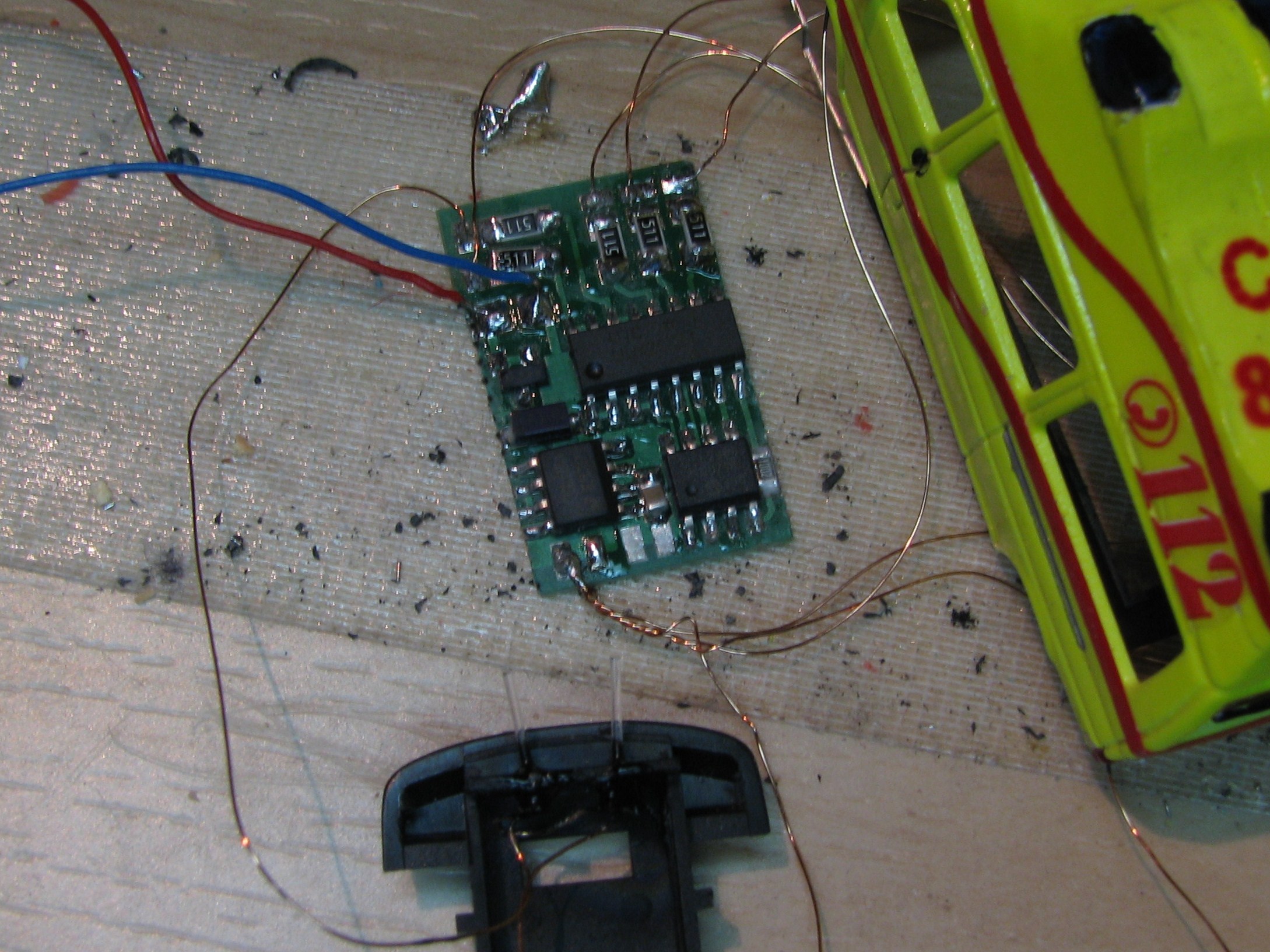 An der Stelle sollten dann die Blauchter alle blinken und es geht zzur normalen Fahrzeugbeleuchtung. auf Bild 2 sieht man das Stück draht was als Träger für die R der Fahrzeugbeleuchtung dient, welches mit dem -Pol der Platine verlötet ist.