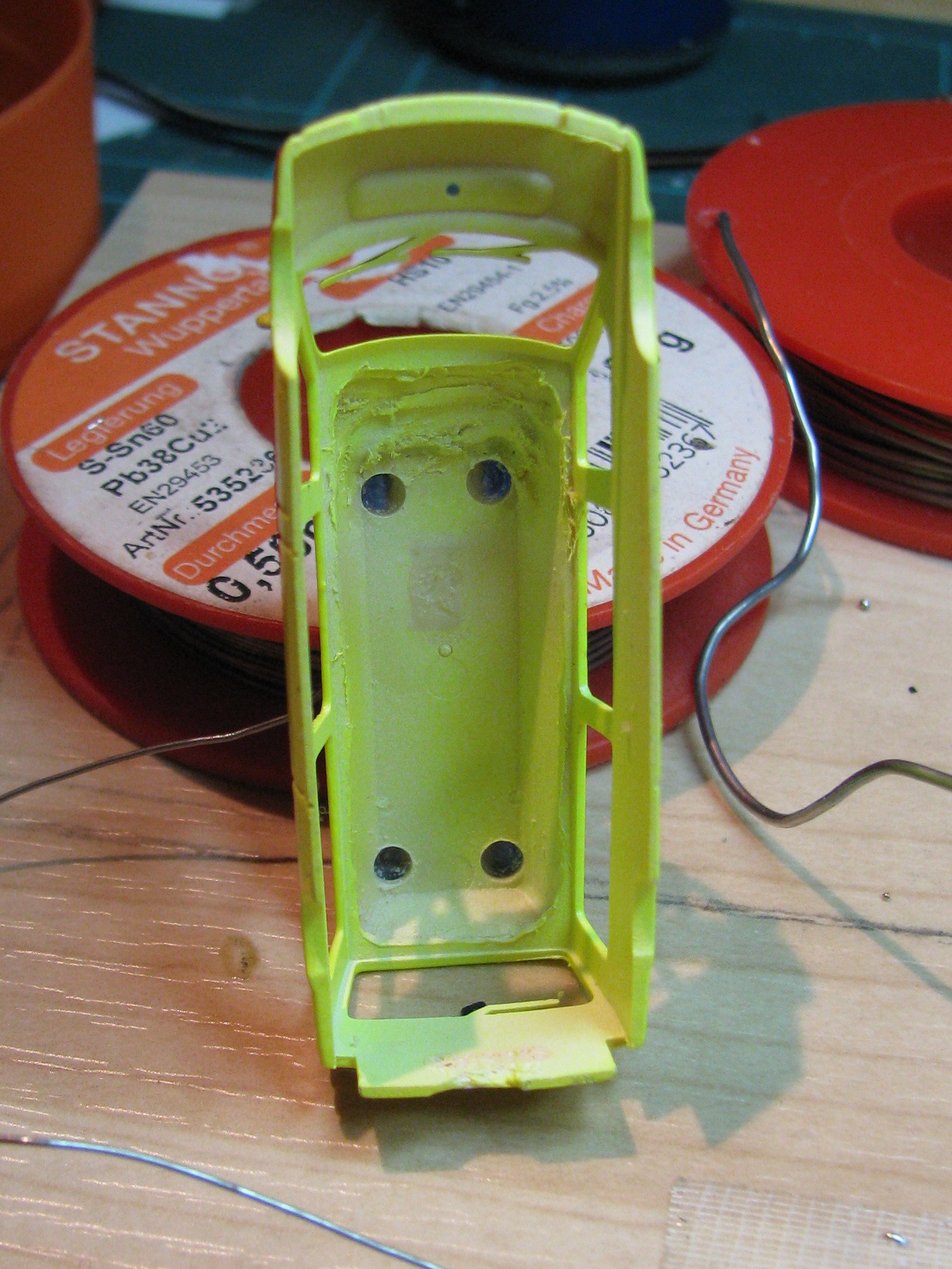 Als nächstes werden die 4 LEDs ins Dach eingeklebt und anschließend mit Klebeband und schwarzer Farbe nach innen hin abgedunkelt. Dannach kommen noch die 6 anderen LEDs an ihren Platz. Wobei die Frontblitzer hier wohl das schwerste sind. Ich nehme meist LWL(Lichtwellenleiter) um das blaue Licht aus dem Fahrzeuginneren in den Grill zu bekommen. Finde ich von der Sauberkeit am schönsten, aber es gehen auch 0402er LEDs.
