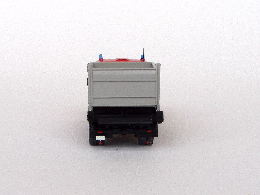 Der Radstand des Busch-Modells wurde verlängert (Original=2675 mm). Auf den Rahmen kam ein Hilfsrahmen aus je zwei zusammemgeklebten U-Profilen (1,6 x 0,8 mm).Die beiden Teile des Liftarmes entstanden aus U-Profilen (2,5 x 2,0 mm).Mittels Rundprofil von 1,5 mm,es wurde aufgebohrt und Messingdraht von 0,5 mm entstanden die Hydraulikteile.Der kleine Arm wurde mit Drahtstiften und kleinen Plastikplättchen beweglich gestaltet.Aufnahmehaken und seitliche Führungsteile sowie am Heck angedeutete Rollen zum absetzen runden den Bau ab.