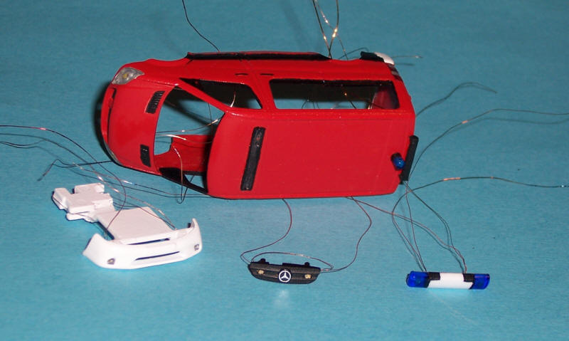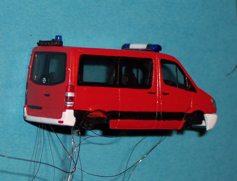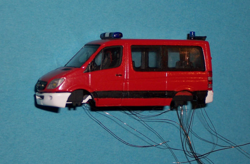 Kleiner Nachtrag für alle, die keine LEDs einbauen: Das blau-transparente Teil nach dem Abfeilen unten unter den Blaulichtkappen mit (etwas schwächer) blau-transparenter Farbe auffüllen und danach an den richtigen Stellen mit einem dünnen (Diamant-) Zylinder-Fräser aufbohren - das ergibt die schöne Strobo-Optik (hier beim zweiten Bild ansatzweise zu erkennen).
