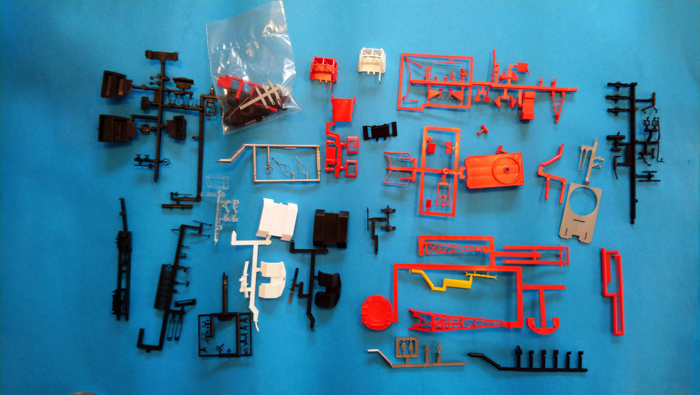 Es sind zum Fertigmodell u.a. die seitliche Heckabstützung zur Darstellung im Einsatz dabei, die Kotflügel in schwarz und weiß und kleiner und großer Kühlergrill, bereits bedruckt.