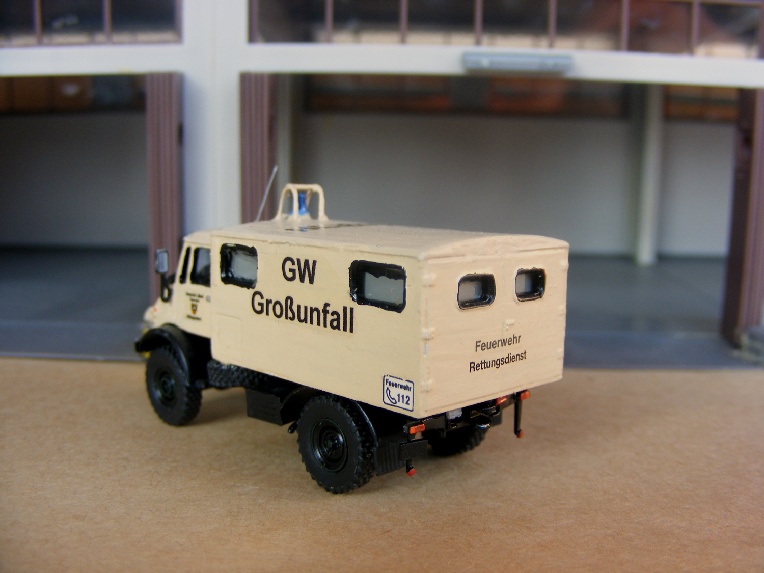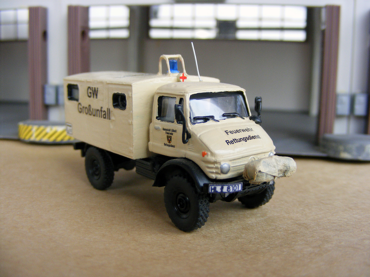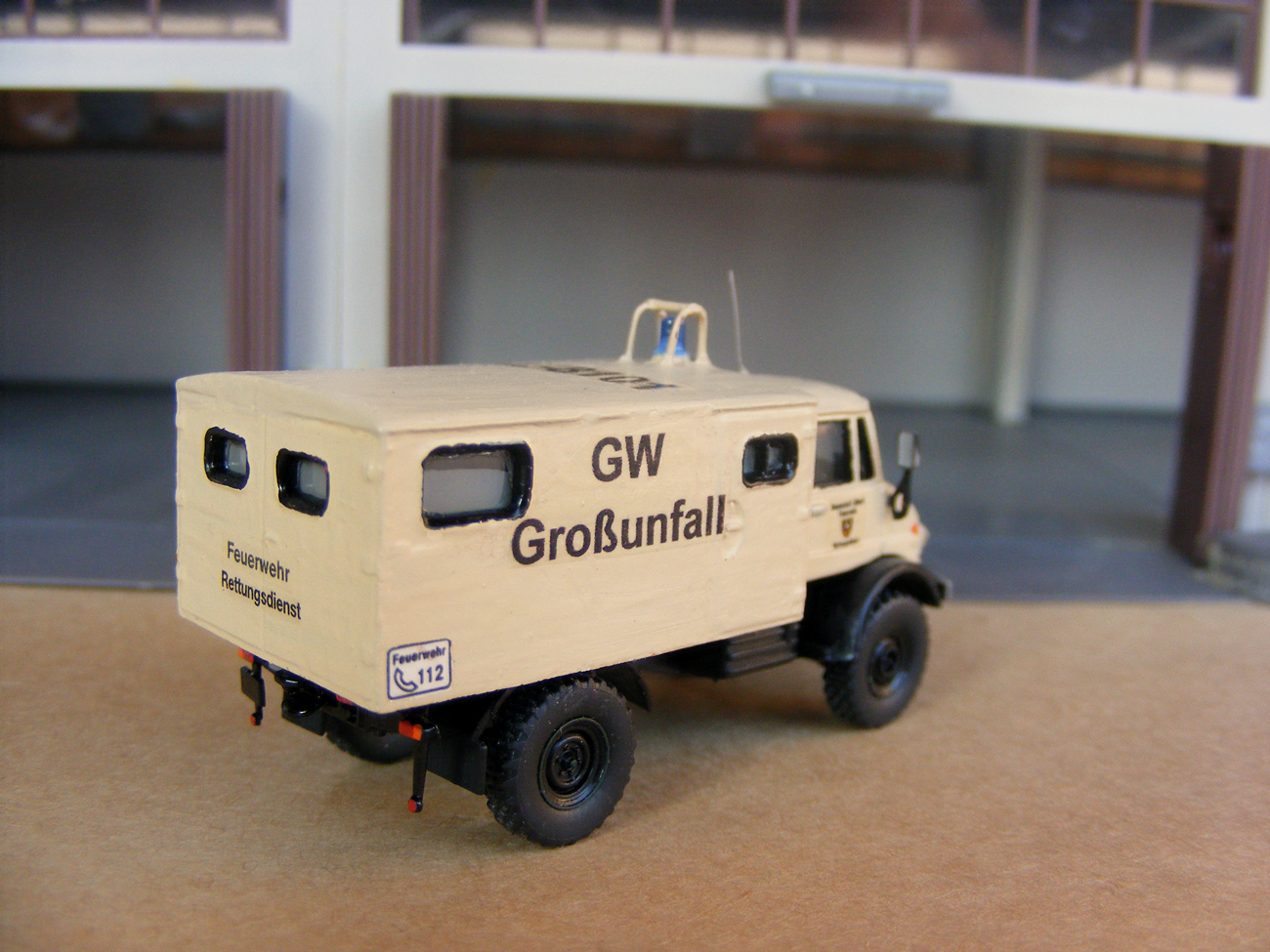 Zum Modell: Hier auch wieder ein Wiking Grundmodell. Die Lackierung wurde mit Revell Farben ausgeführt. Das Fenster fahrerseitig wurde verspachtelt. Decals stammen von Müller. Auch hier kamen die 3-d Decals für die Dachfenster zum Zuge und die Bereifung stammt von Herpa. Kleinteile machen den RTW vollständig.