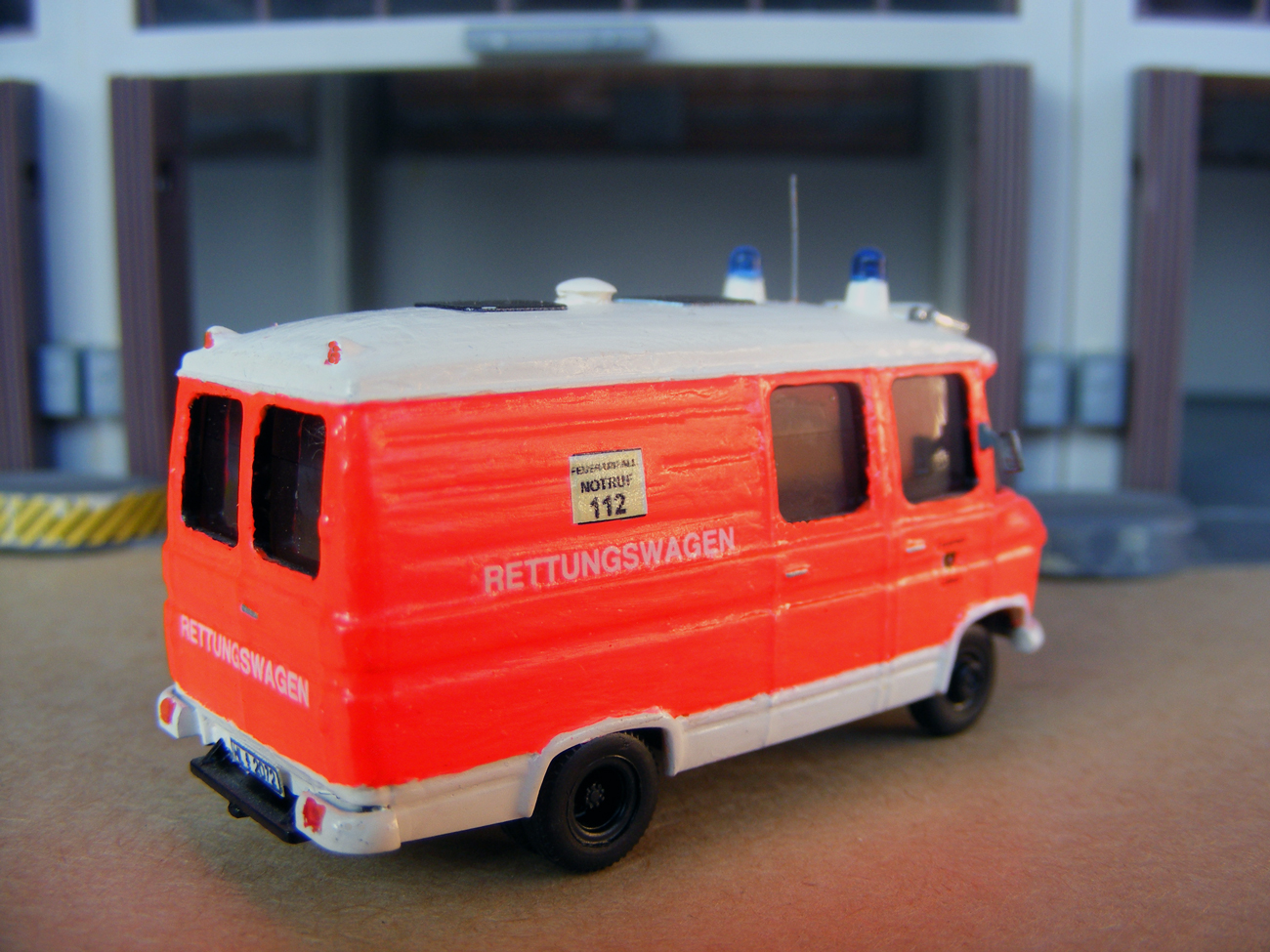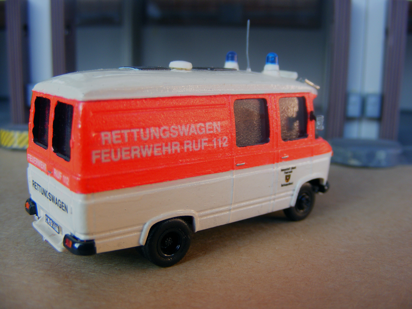 Zum Modell: Wieder kam das Wiking Modell zum Zuge. Dieses Modell war mein erstes, bei dem ich das fahrerseitige Fenster verspachtelt habe. Dementsprechend sieht es auch aus. Sein Nachfolger von Brekina wartet aber schon Schrank gebaut zu werden. Die Lackierung wurde wieder mit Revell Farben ausgeführt. Die Rückleuchten wurden auch aufgemalt. Bei diesem Modell wurde die Dachpartie nicht verändert, weil dieser RTW nur ein Dachfenster hatte. Decals stammen wieder von Müller und die Bereifung wieder von Herpa.