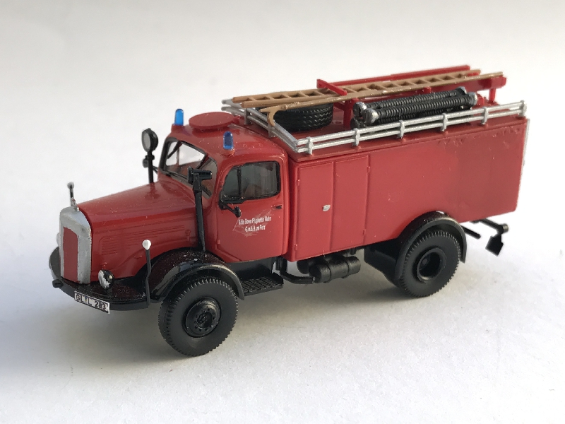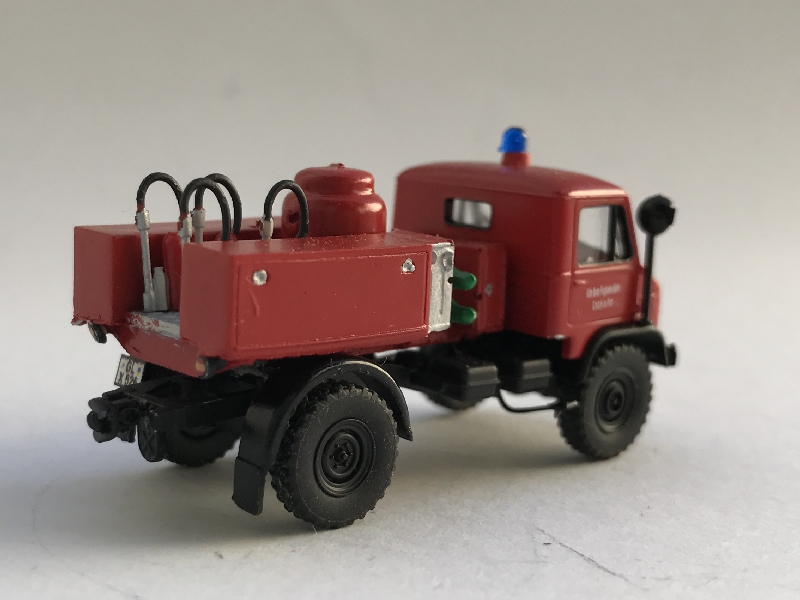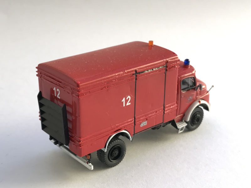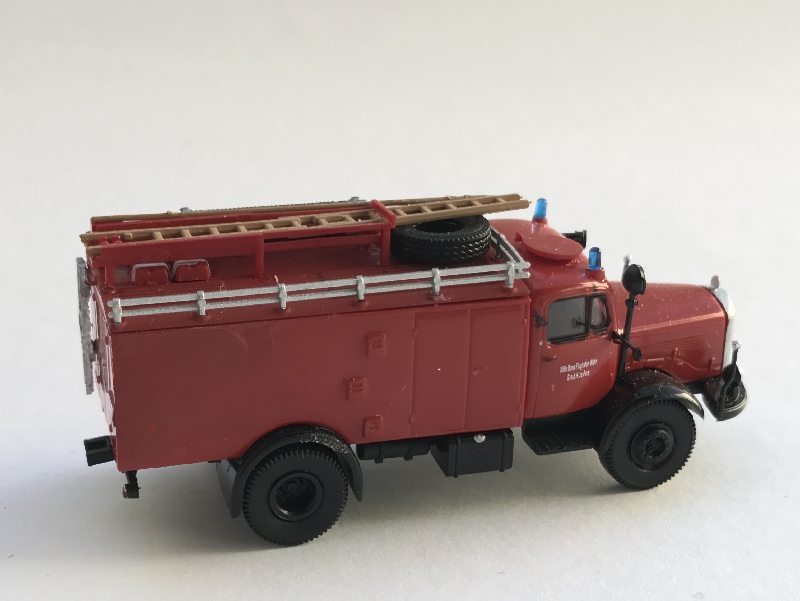 Das Fahrgestell stammt von Brekina und mußte etwas gekürzt werden. Den Aufbau steuerte ein Preiser Kurzhauber-TLF16/25 bei.