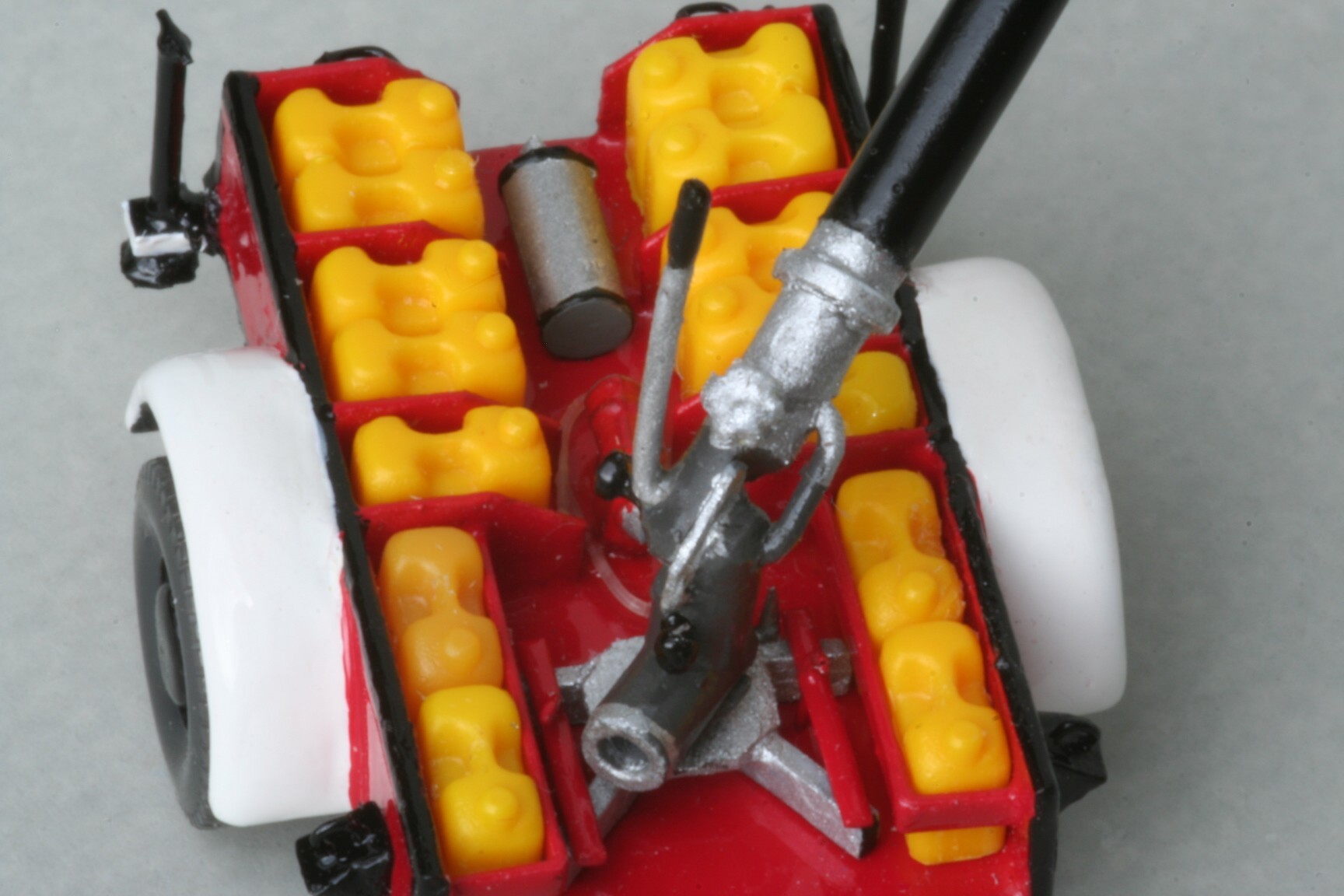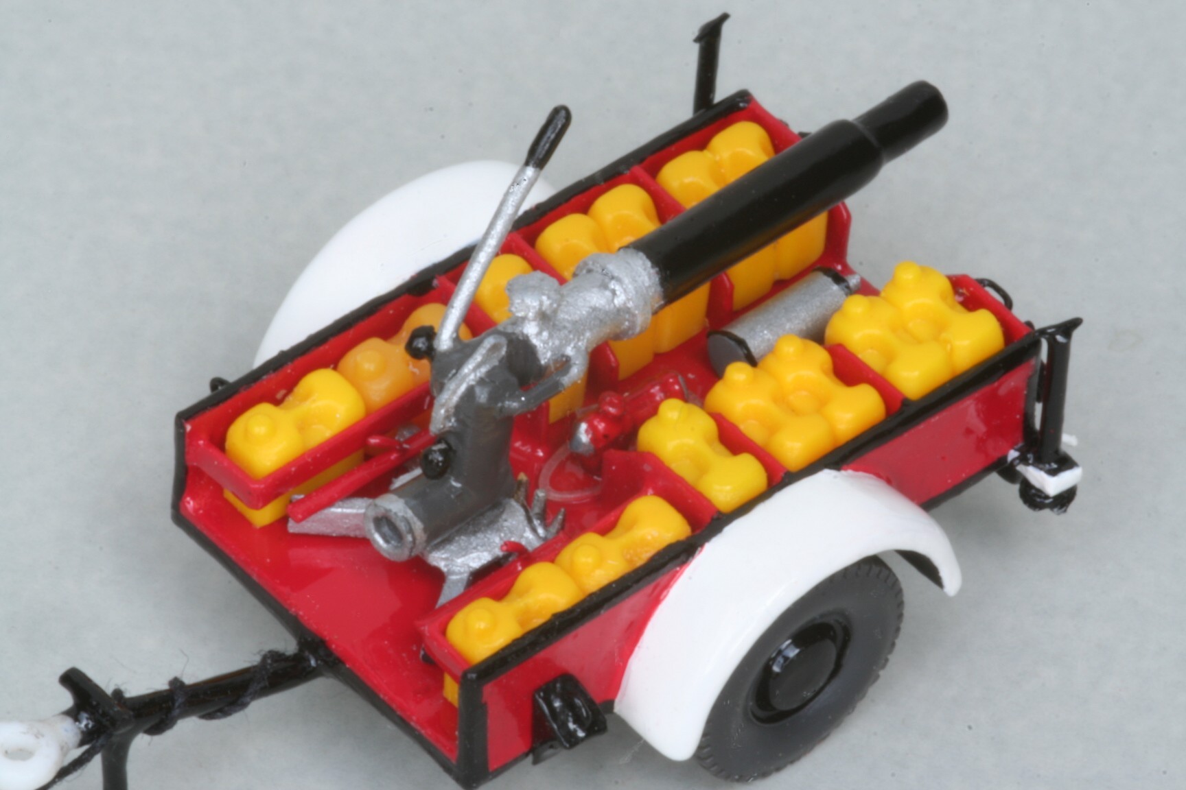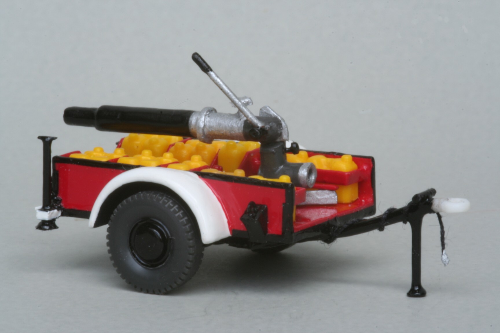 In dem Anhänger wurden dünne Trennwände eingebaut, zwischen die Preiser Schaummittelkanister kamen, die allerdings unten abgesägt wurden, weil sie maßstäblich zu hoch sind. Der Zumischer stammt ebenfalls von Preiser, bekam aber aus einem durchsichtigen Plastikfaden noch einen Ansaugschlauch für das Schaummittel beigelegt. Der Wasserwerfer ist eigentlich aus Abfällen entstanden, nämlich einem Gießast vom Wiking Feuerwehrzubehör. Trotzdem ist er höhenverstellbar und seitlich drehbar. Im Original konnte der Werfer vom Anhänger abgenommen werden. Dies ist bei meinem Modell nicht möglich, aber das auf dem Anhänger zusammengeklappte Stützgestell sowie die Halterungen sind entsprechend nachgebildet. Weitere Kleinteile wie z. B. die Abstützungen des Anhängers entstanden aus kleinen Nägeln.