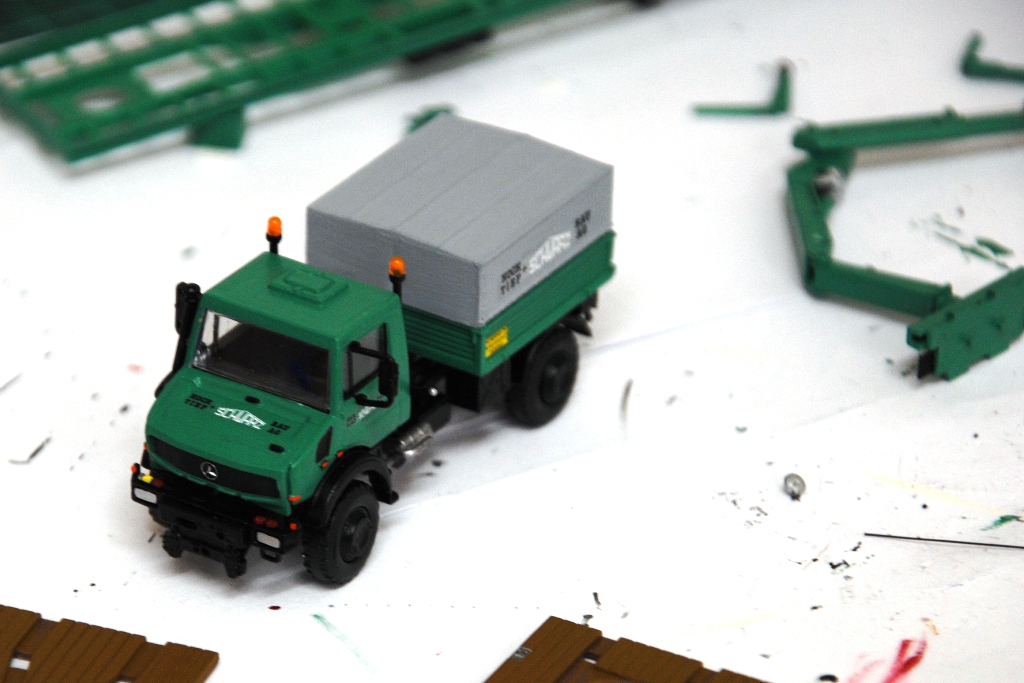 Hier mal ein gesuperter Lanz Straßen-Bulldog von Saller (Fertigmodell), welcher farblich verbessert und dezent verschmutzt wurde. Hinten dran ein noch älteres Anhängsel von Preiser. Ebenfalls fertig und gesupert. Als Ladung habe ich ein paar Balken für die örtliche Zimmerei drauf gepackt. Das ganze habe ich auf einem Testdiorama (Verwendung neuer Materialien) fotografiert. Der Baum im Hintergrund ist ein kompletter Eigenbau. Stamm aus Draht gedreht und mit Modelliermasse als Rinde sowie Belaubung (Eiche Sommer) von Mininatur.