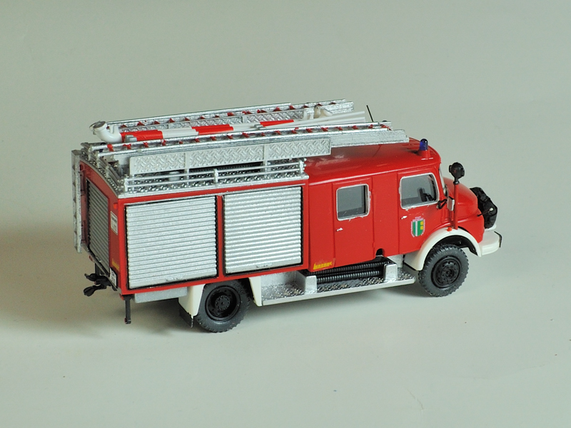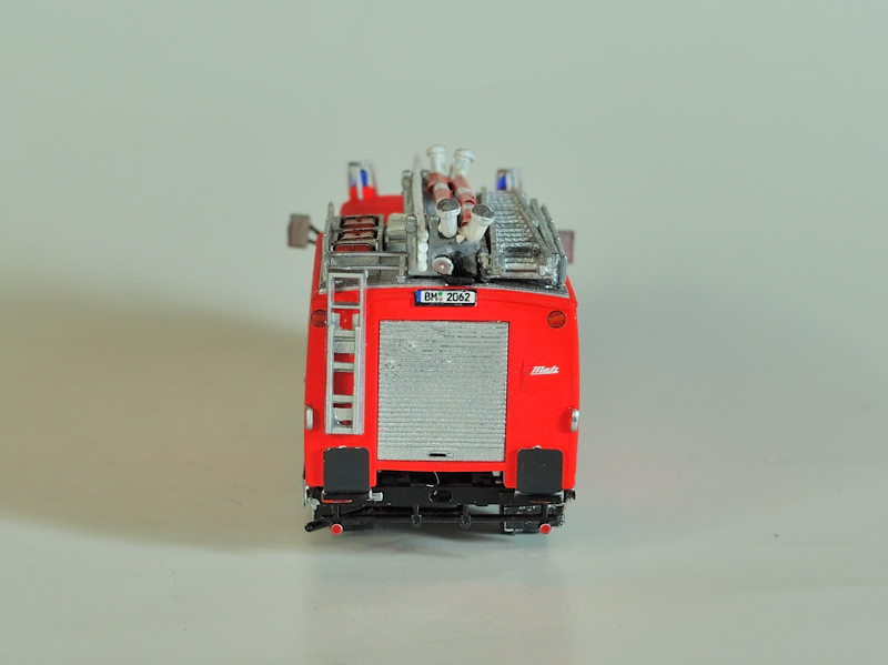 Das Modell entstand aus einem Preiser-Fahrgestell mit Kabine, einem umgebauten Metz-DLK-Aufbau von Shapeways und einer Herpa-Leiter (Drehstuhl und Leiterpark).