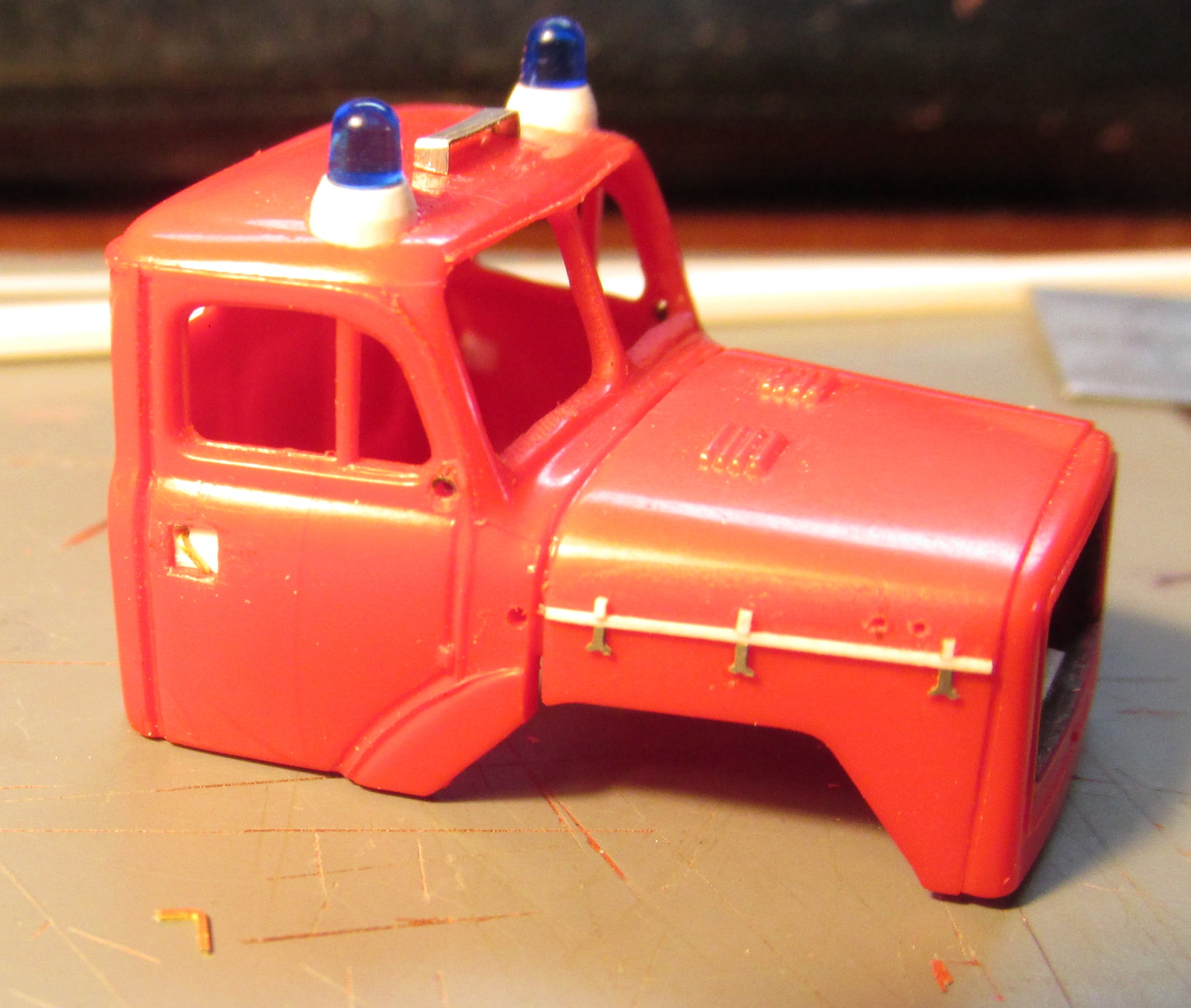 Aber das Fahrerhaus stammt doch wohl auch von Preiser. Weshalb hast du die Scheibenwischer heraus getrennt und an der Motorhaube die schon vorhandene Leiste sowie die Gummiverschlüsse nochmal nachgebildet?