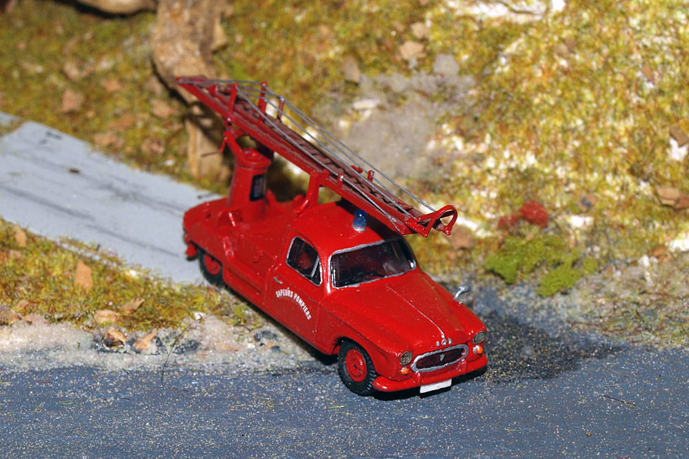 Im Original auf einem Peugeot 403 aufgebaut, hatte die Kleine hinten einen festen Turm, auf dem die Leiter drehbar montiert war.