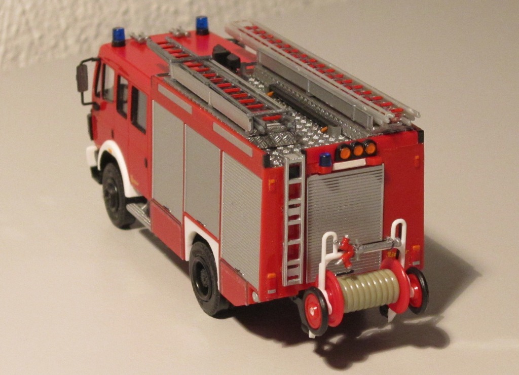 Das Fahrerhaus spendierte – wie schon erwähnt – Busch, und zwar das Hanauer LF 16/12 (dazu später noch eine Anmerkung). Fahrgestell und Aufbau mit 7 Geräteräumen kommen von herpa. Der herpa-Aufbau ist zwar im Vergleich mit dem Vorbild zu hoch; da ich aber keinen sklavischen Nachbau vorhatte und der Gesamteindruck stimmig ist, habe ich den Aufbau so übernommen. Lediglich das Heck habe ich dank der Hilfe der Zentralwerkstatt Aachen (nochmals vielen Dank!) vorbildgerecht umgebaut und die Rückwand gegen die eines LF mit 5 Geräteräumen ausgetauscht.