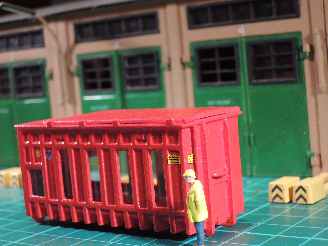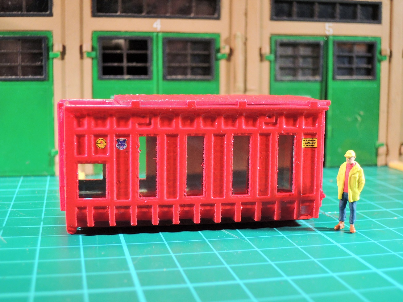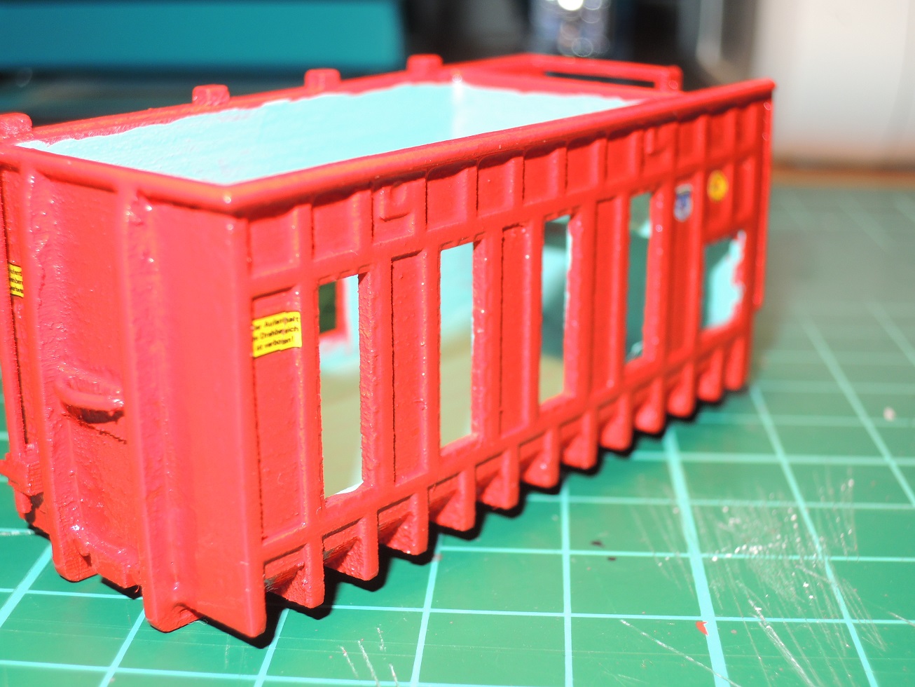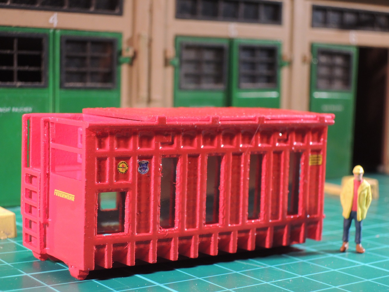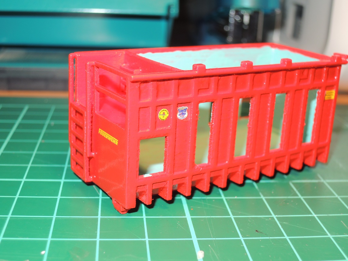Nach dem Versäubern habe ich den AB mit Revell Aqua-Grundierung zweimal lackiert. Nach entsprechender Abtrocknung, die hier relativ schnell erfolgt, kamen nacheinander drei Schichten RAL 3000 darüber. Die "Badewanne" habe ich in lindgrün mit dem Pinsel gestrichen. Am Wochenende habe ich dann aus dem Decal-Fundus das Hamburg Wappen und das der Feuerwehrakademie angebracht. Nach heutigem Suchaufruf hier im Forum bekam ich den Tipp, die gelben Warnschilder vom Preiser-Absetzkipper zu verwenden. Diese habe ich noch zurechtgeschnitten, so das diese zwischen die Holme passen. In zwei weiteren Schritten werde ich in den kommenden Tagen den AB noch mit glänzend Klarlack versehen, um die Decals zu fixieren und als letzten Schritt Klarsichfolie zurechtschneiden und innen mit Uhu-Hart verkleben.