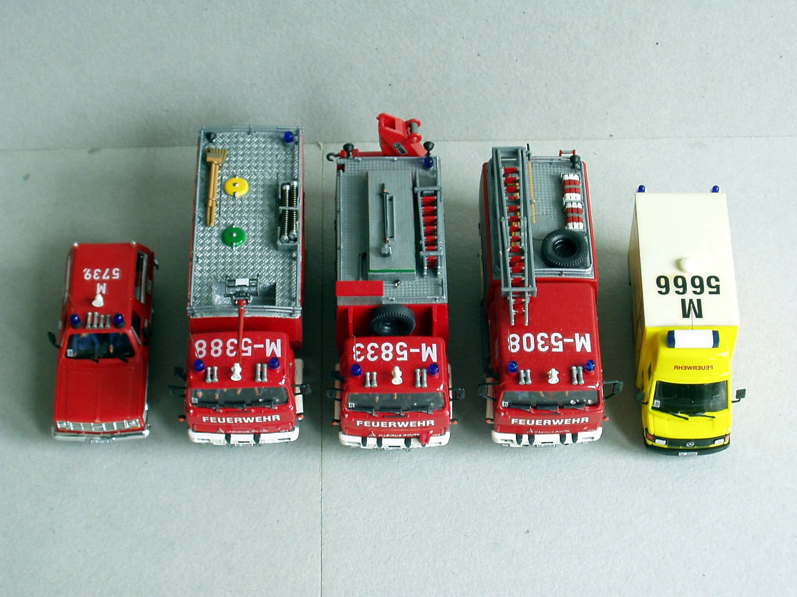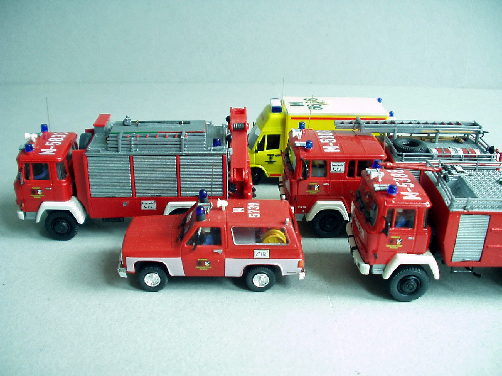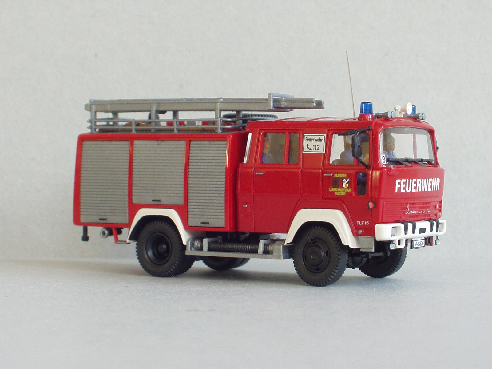 Zum Modell: Wenn ich mich richtig erinnere, stammt die Kabine von einem Roco-Baustellenkipper (Artikel-Nummer 1522), und ganz sicher erinnere ich mich daran, daß der TLF-24/50-Aufbau von Gollwitzer (damalige Artikel-Nummer 76) stammt. Das Weitere in Stichworten: Umrüstung zur Trupp-Kabine, Fahrgestell (vermutlich auch Roco) auf 44 Millimeter Radstand gebracht, Aufbau versäubert, gefeilt, angepaßt (und immer wieder gefeilt und angepaßt), Grundierung ebenso wie RAL-3000-Lackierung aus der Dupli-Color-Dose, Trupp-Besatzung von Preiser und die üblichen Kleinteile.