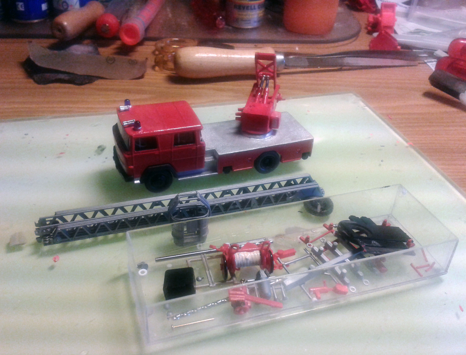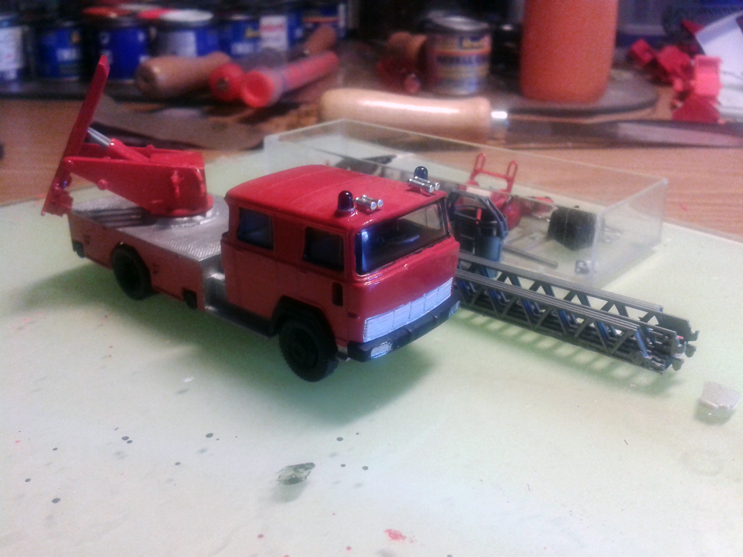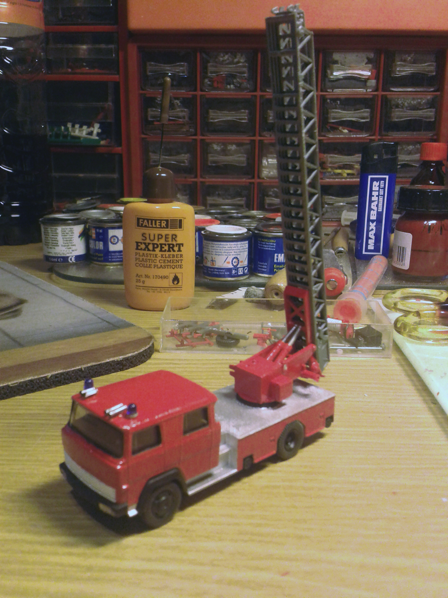 Die Grundlage bildete das Wiking Modell. Da der Leiterpark von Wiking alles andere als Original war, wurde dieser durch einen Leiterpark von Preiser ersetzt. Dazu wurde die Wiking Leiteraufnahme ausgeschnitten und das Loch mittels eines Bohrers vergrößert. Dann wurde die Preiser Leiteraufnahme von der Eckhauber DL eingepasst und anschiießend verspachtelt. Dabei musste vor dem verspachteln darauf geachtet werden, das die Leiter auch vernünftig auf der Kabine liegt.