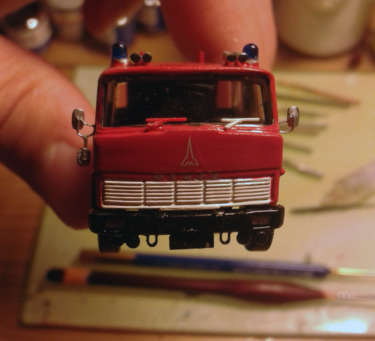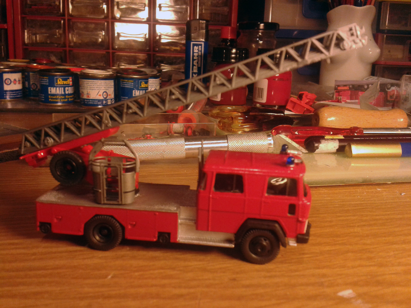 Es handelt sich hier um das Sondermodell von Wiking. Das Modell kam dem Original recht nahe. Ich habe dennoch einige Änderungen vorgenommen. Als erstes habe ich die Blaulichter entfernt und die Sockel abgeschliffen. Ich habe das Kabinendach dann mit Revell rot lackiert, da Humbrol etwas zu dunkel zum Wiking rot war. Dann wurden die neuen Halterungen für die Blaulichter links und rechts am Rand des Kabinendaches montiert. Darauf kamen die Blaulichtsockel und die Lautsprecher für das Elekrohorn. Es wurden dann noch neue Presslufthörner montiert.