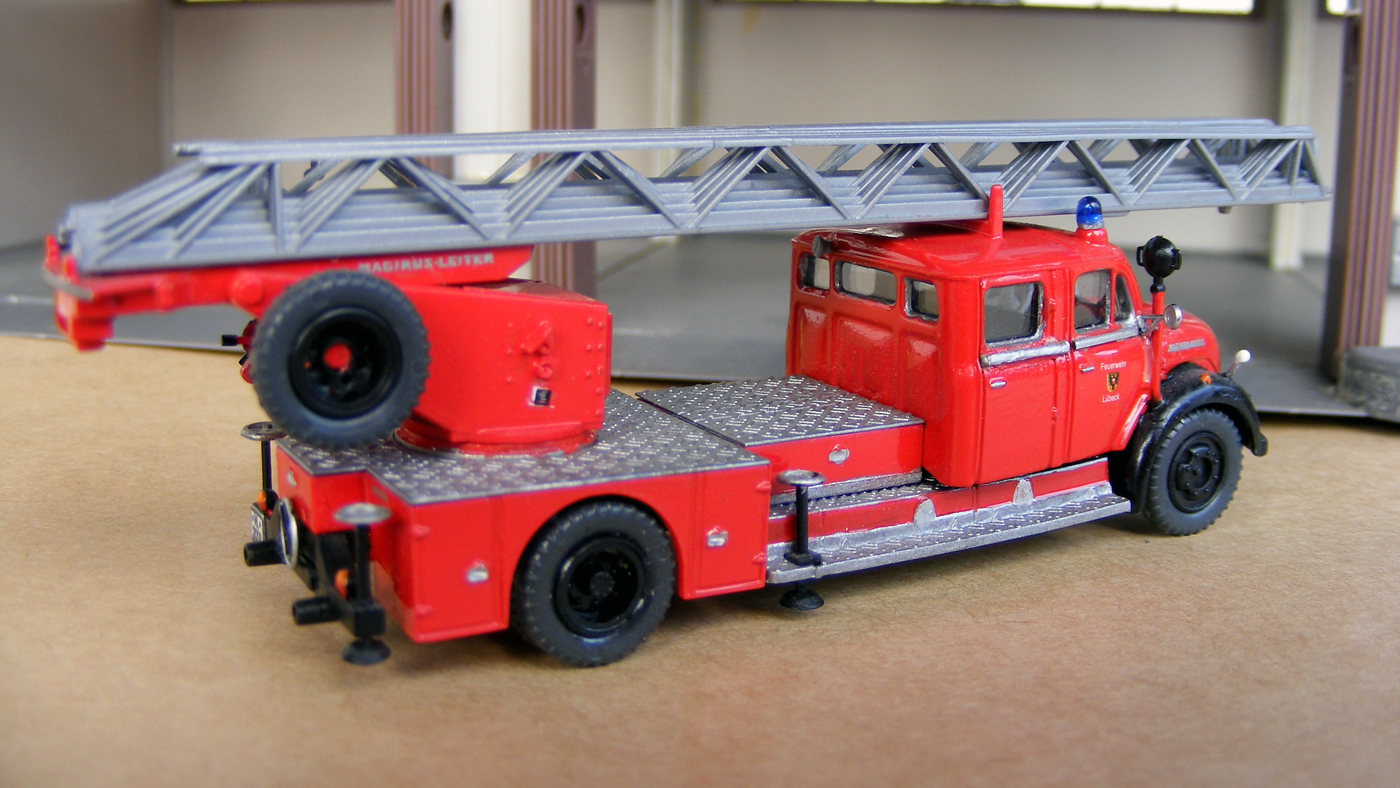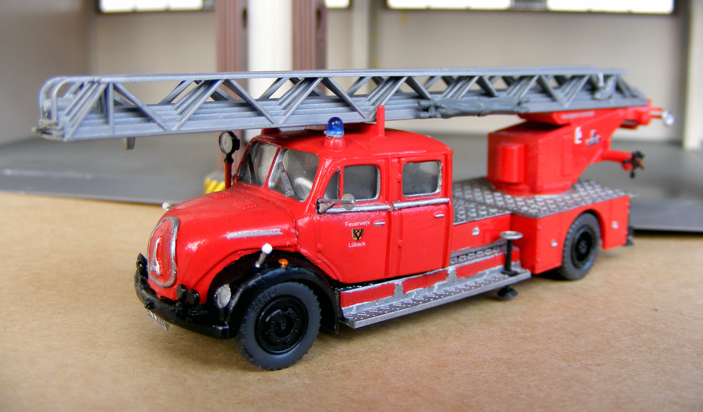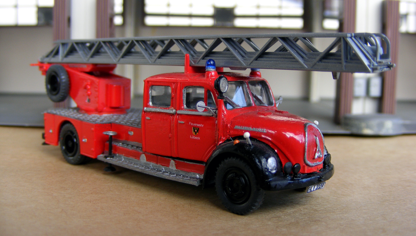 Die erste Drehleiter, die ich vorstellen möchte, hatte ich gerade zur Wiederaufbereitung auf dem Basteltisch. Es handelt sich um die allererste Frontlenker Drehleiter von Magirus, die 1968 an die Feuerwehr Lübeck ausgeliefert wurde.