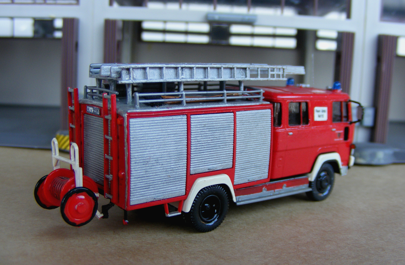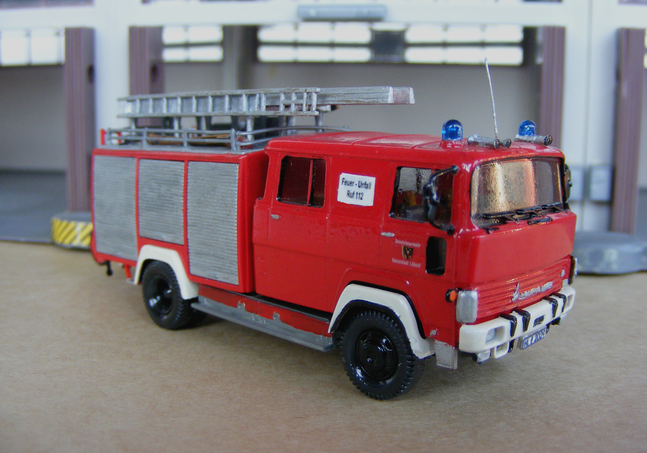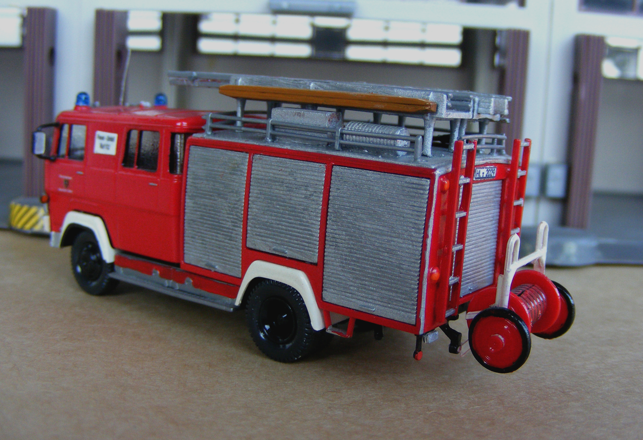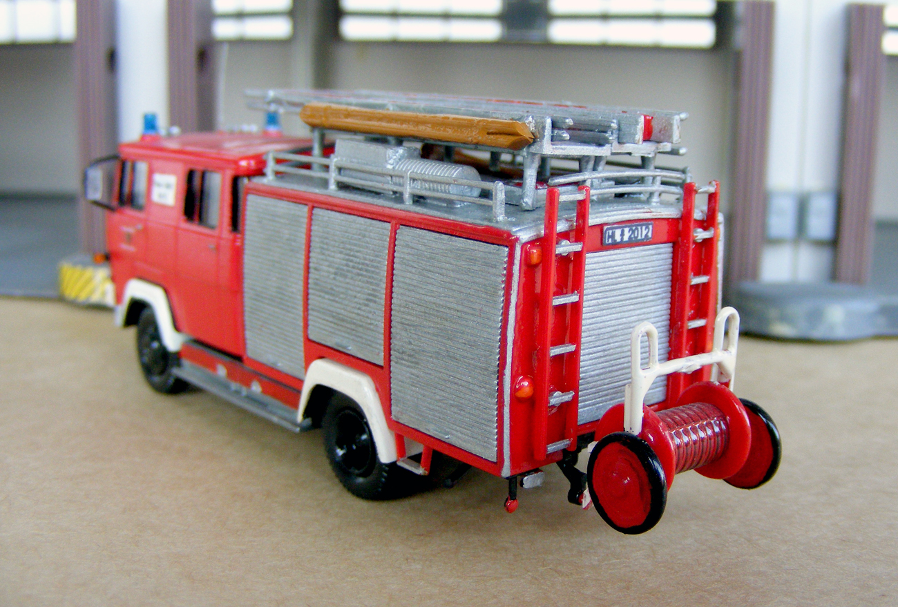 Das Grundmodell lieferte Brekina. Das Rubinrot habe ich mir selber angemischt. Kotflügel und Stoßstange wurden in schwarz abgesetzt. Ich habe die Versíon mit blauen Blinklampen gebaut. Auf dem Dach lagert neben Steck- und Schiebleiter noch zwei Rohre für ein Schaumgießgestänge.