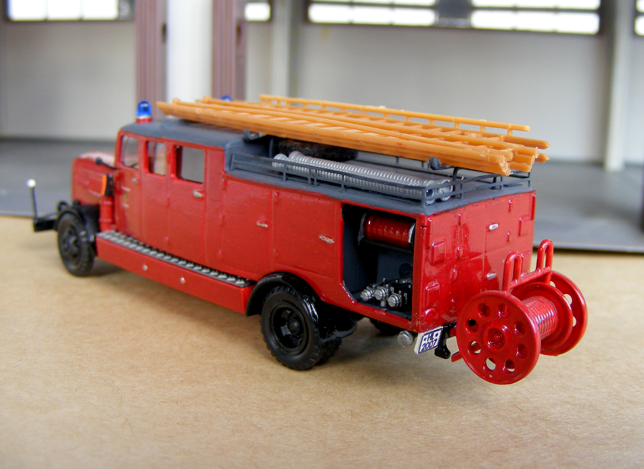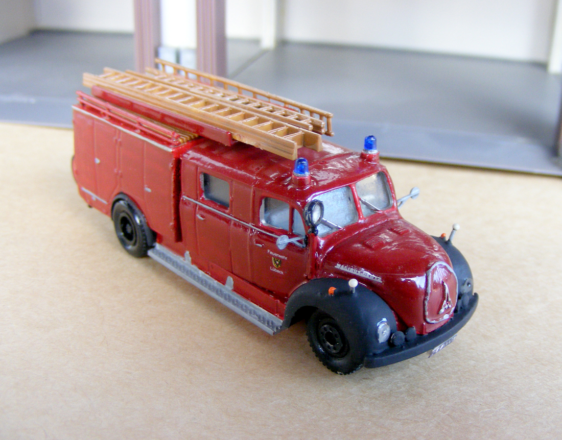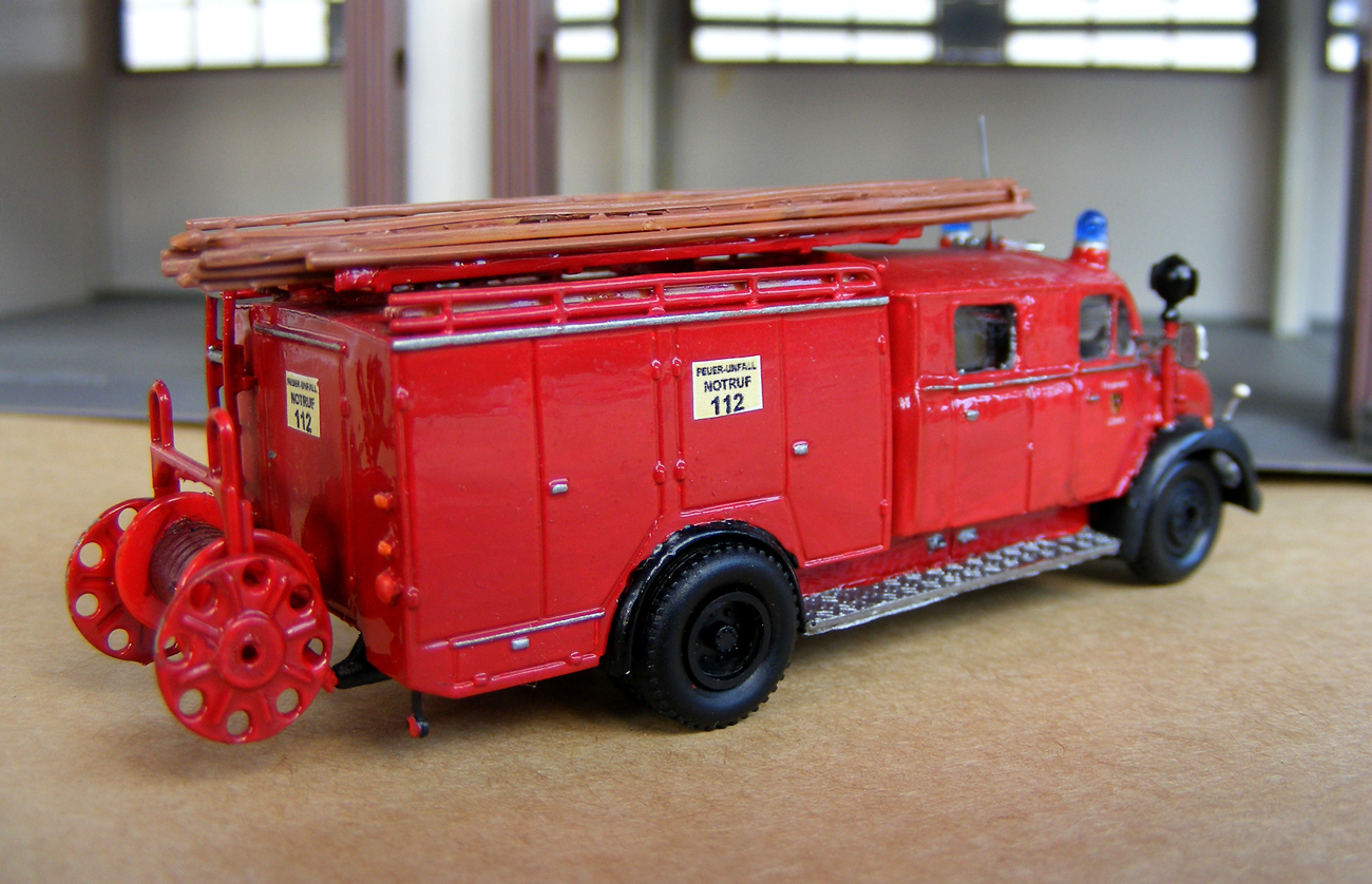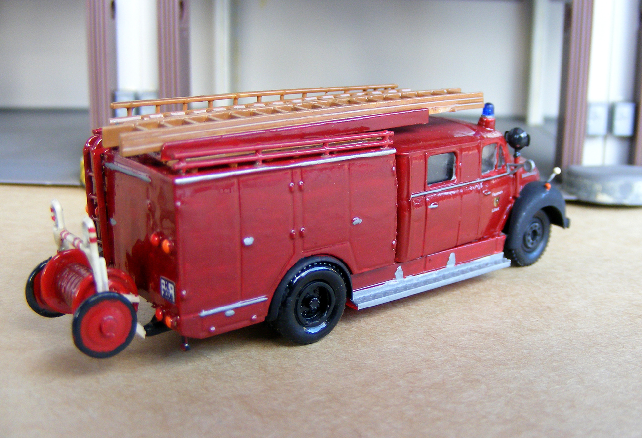 Das Grundmodell lieferte Brekina. Das Rubinrot habe ich mir selber angemischt. Kotflügel und Stoßstange wurden in schwarz abgesetzt. Ich habe die Versíon mit blauen Blinklampen gebaut. Auf dem Dach lagert neben Steck- und Schiebleiter noch zwei Rohre für ein Schaumgießgestänge.