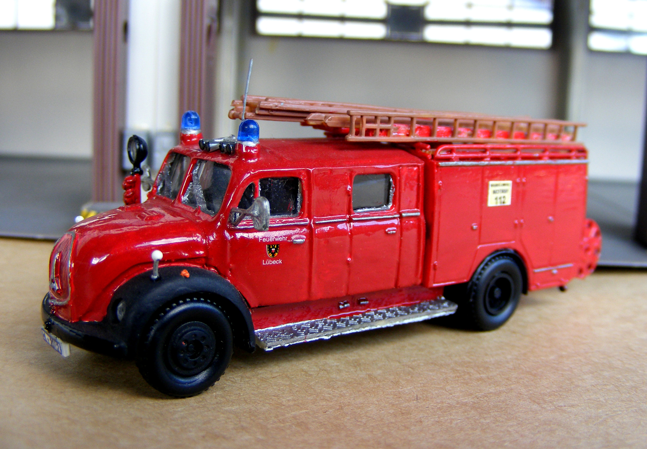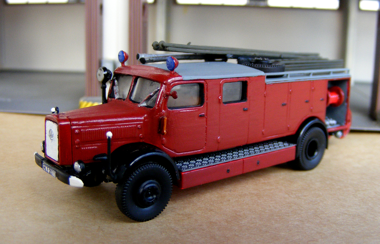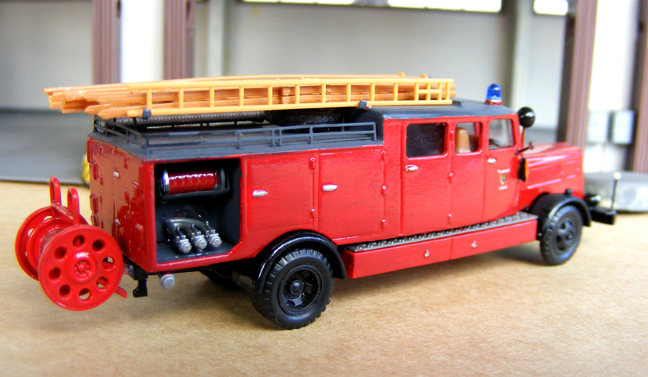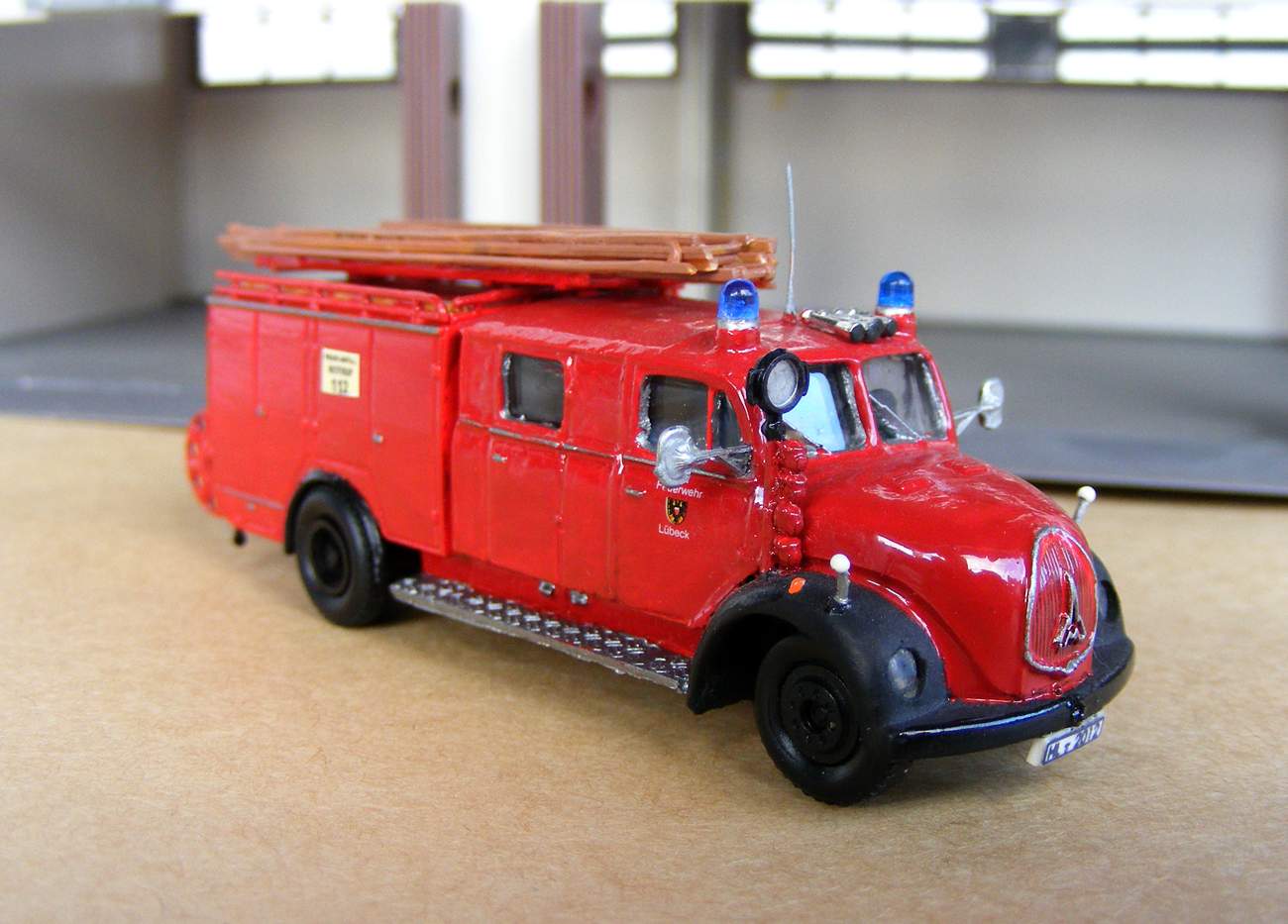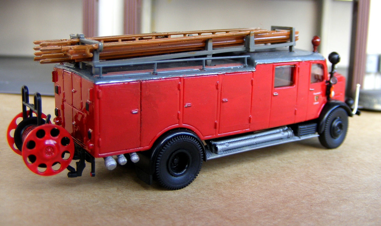 Das Grundmodell lieferte Brekina. Das Rubinrot habe ich mir selber angemischt. Kotflügel und Stoßstange wurden in schwarz abgesetzt. Ich habe die Versíon mit blauen Blinklampen gebaut. Auf dem Dach lagert neben Steck- und Schiebleiter noch zwei Rohre für ein Schaumgießgestänge.