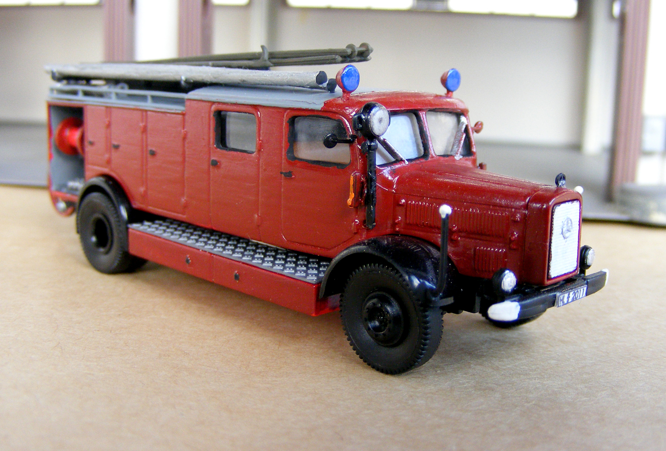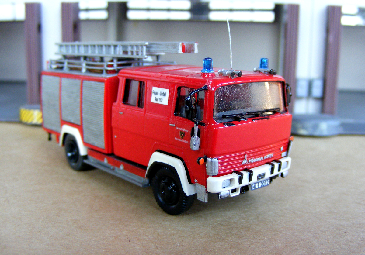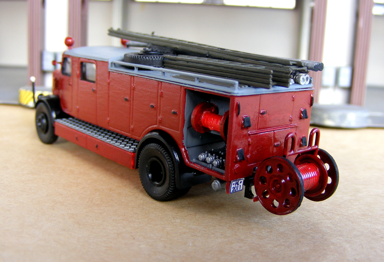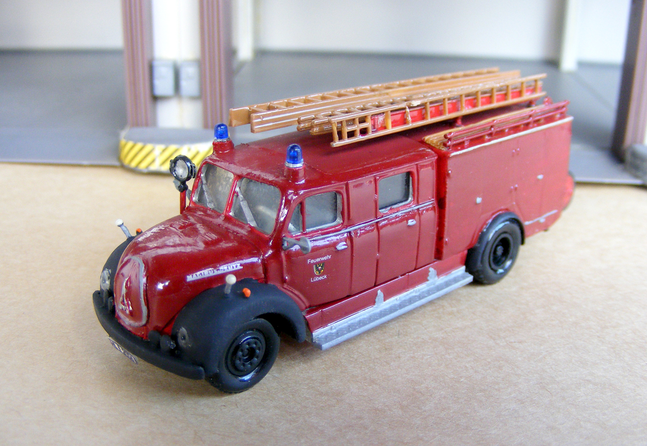 Das Grundmodell lieferte Brekina. Das Rubinrot habe ich mir selber angemischt. Kotflügel und Stoßstange wurden in schwarz abgesetzt. Ich habe die Versíon mit blauen Blinklampen gebaut. Auf dem Dach lagert neben Steck- und Schiebleiter noch zwei Rohre für ein Schaumgießgestänge.