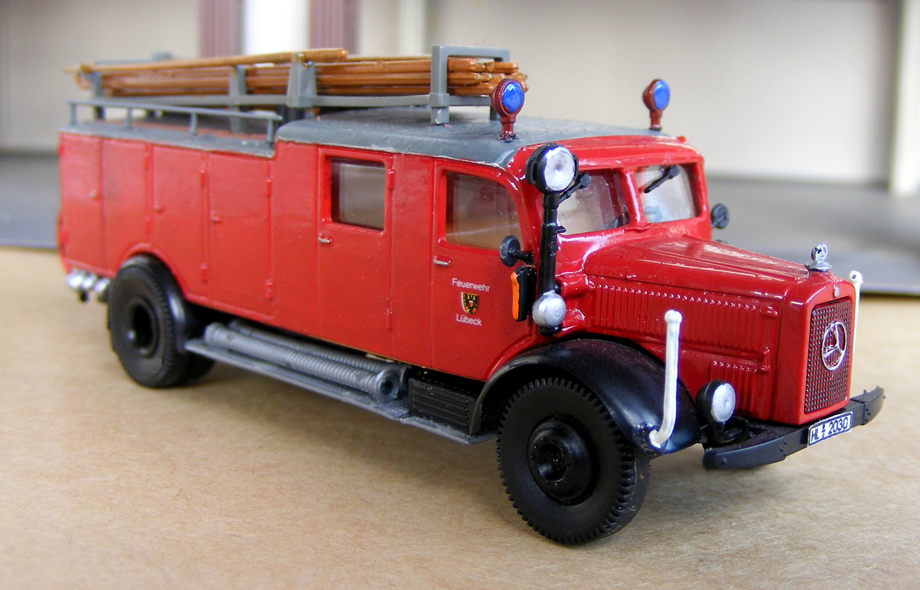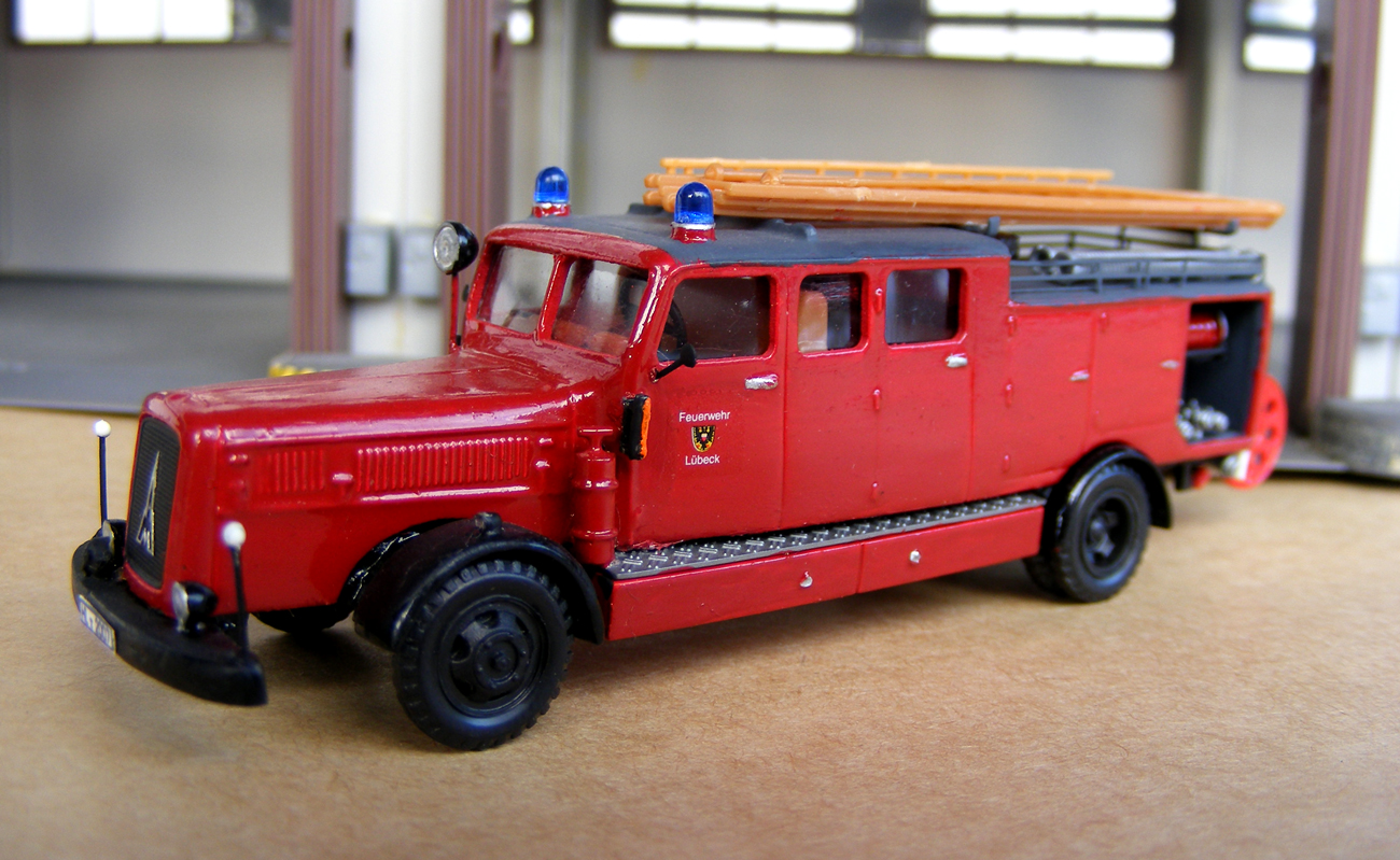 Ein weiteres Fahrzeug aus der Kriegszeit war dieses ehemalige GLG auf Mercedes Benz L 4500. Von diesem Typ hatte die Feuerwehr Lübeck drei im Bestand. Aufgrund des größeren Wassertanks (1500 Liter) fuhr das Fahrzeug im Löschzug als TLF 16 und nicht als LF 25. Das Fahrzeug wurde von Tannengrün in Rubinrot RAL 3003 umlackiert. Das letzte Fahrzeug wurde 1964 außer Dienst gestellt. Ich habe den HL-2030 nachgebaut.