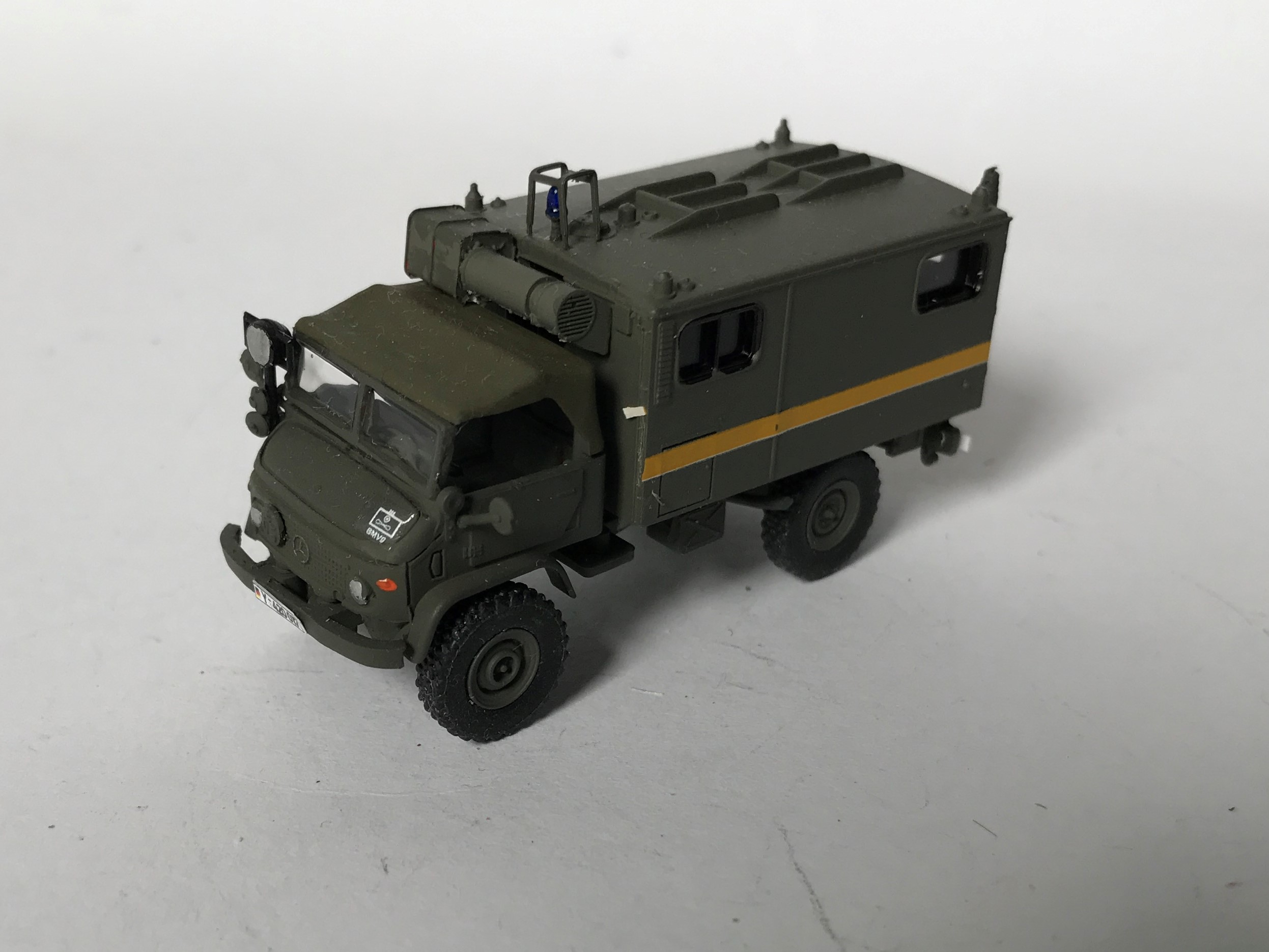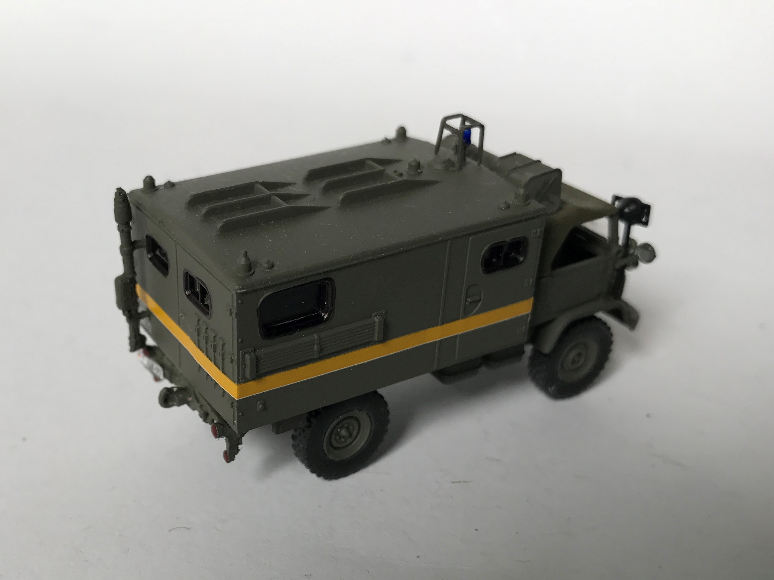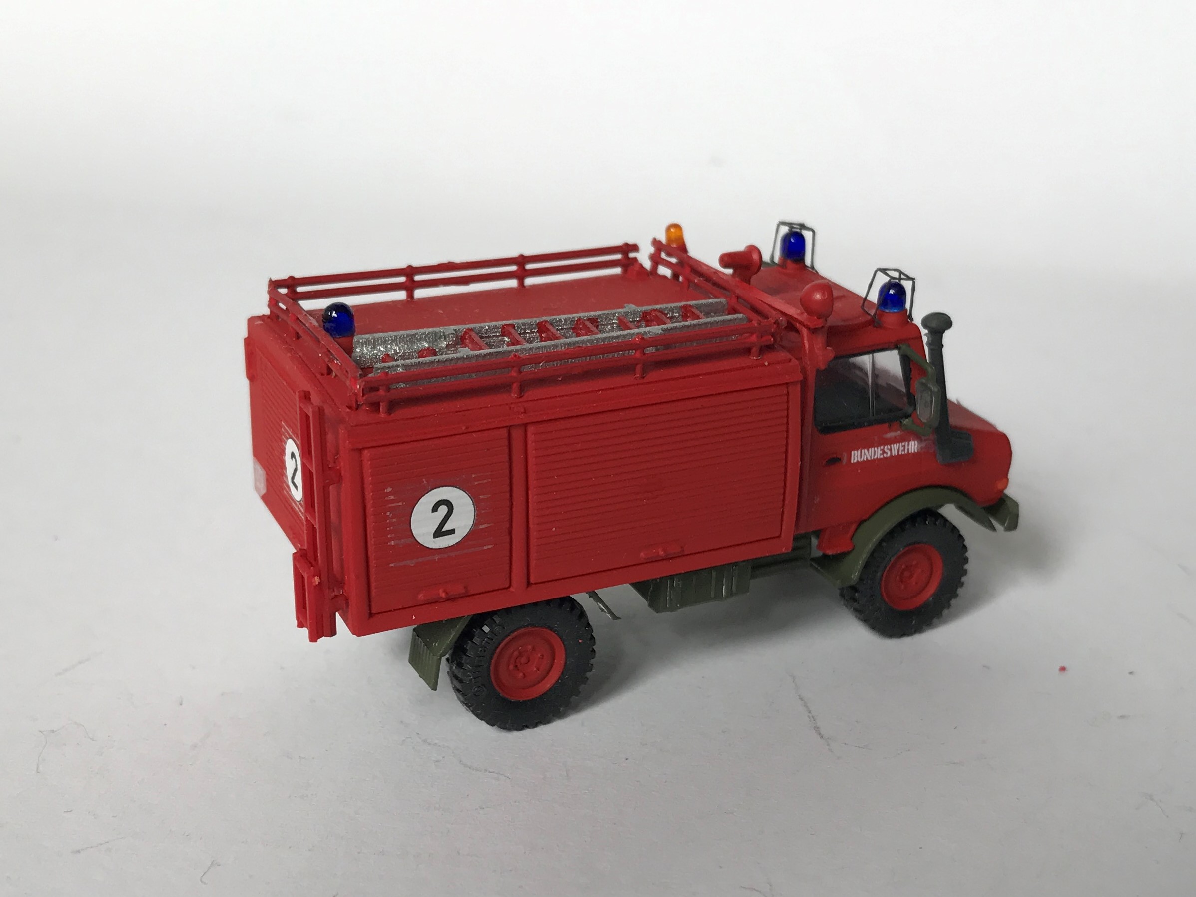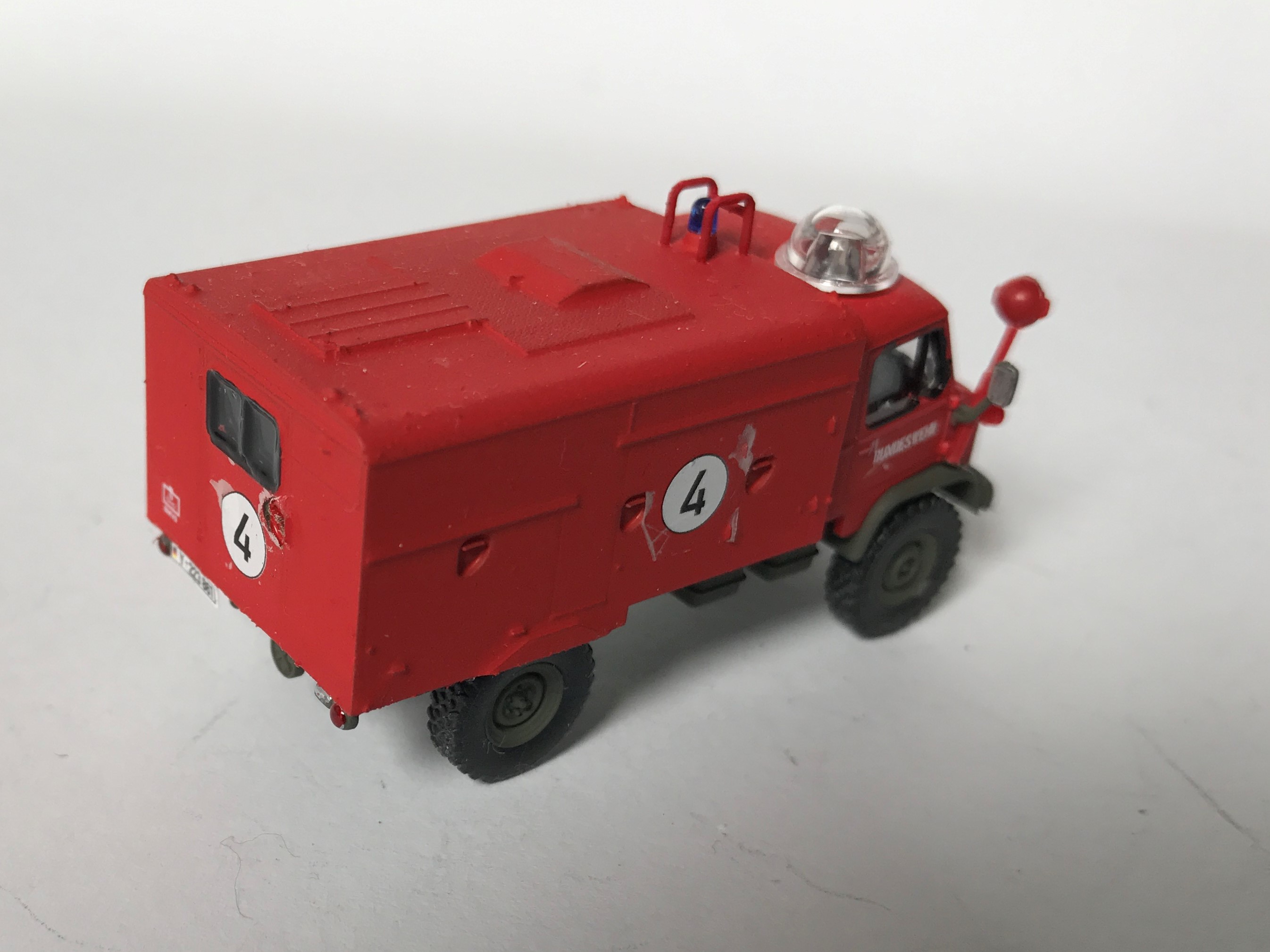 Wie das Vorbild auch wurde das Modell aus einem entsprechend gekürzten Preiser-Modell und einer Pritsche vom 2t-Unimog (Roco) gebaut.
