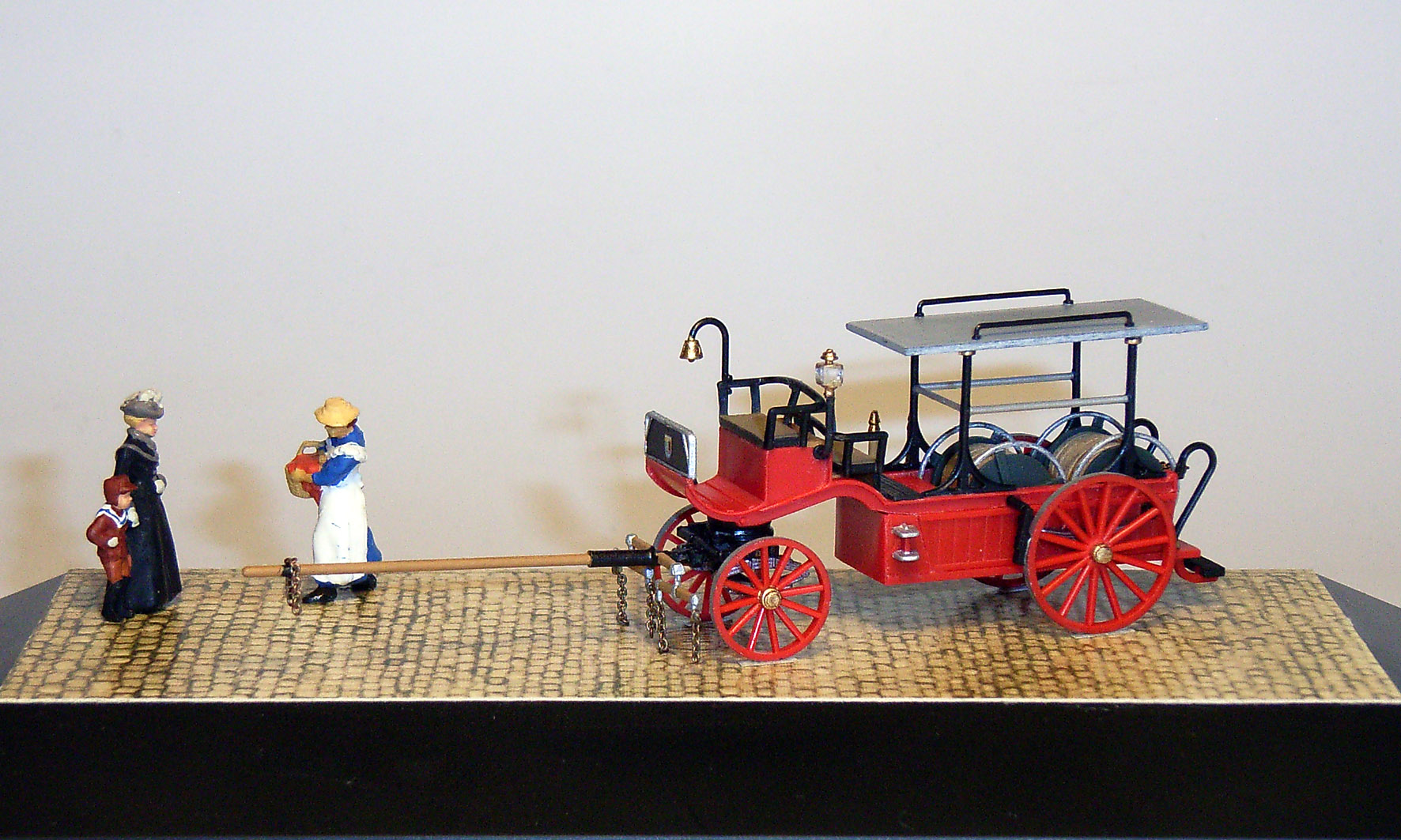 So habe ich mir zu jedem Fahrzeug zeitgenössische Preiser-Figuren gesucht, den Vitrinenboden mit Kopfsteinpflaster beklebt und das Ganze mit ein paar schmückenden Accessoires dekoriert. Wie ich schon beim "Feuertaucher" und dem "Rettungspaddler" zugegeben habe, bin ich aber kein Figurenbauer und erst recht kein Dioramenbauer. Bitte das zu berücksichtigen!