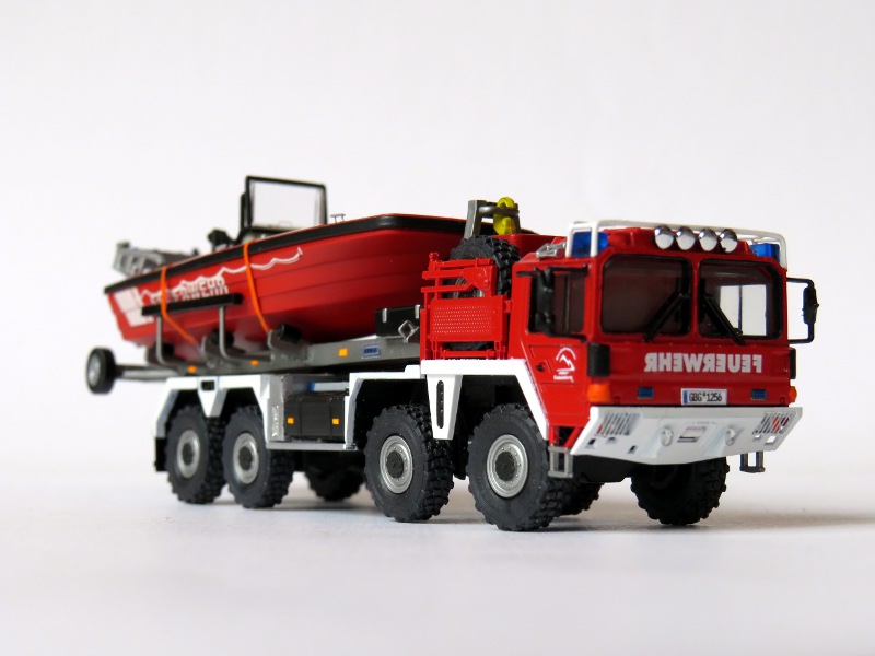 Eigentlich sollte es nur ein kurzes Finish werden, doch letztendlich floss mehr Zeit und Material in dieses Projekt als veranschlagt. Basis war der MAN Multi Abrollkipper von Roco. An dem Fahrzeug selbst wurde kaum etwas verändert. Nur etwas Farbe, Decals von TL und Hawener. Die Blaulichter sind vom Roco Leuchtbalken und wurden angeschrägt und angepasst. Der Schutzbügel entstand aus 0,6 mm Evergreen Rundprofil (nächstes Mal nehm ich 0,5 mm). Scheinwerferschutzgitter und Schäkel sind Ätzteile von msM87.