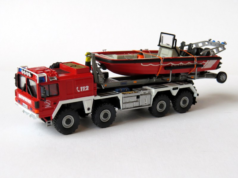 Der MAN Multi wurde neu lackiert und den Bedürfnissen angepasst. Ein Mehrzweckboot von Lehmar sollte auf einer Wechselbrücke verladen werden. So kann das Boot auch an Land gut verstaut und gewartet werden. Mit den PKW Rädern als Rolle, lässt sich die Brücke auch direkt in flaches Ufer ablassen, so dass das Boot aus dem Träger herausgleiten kann.