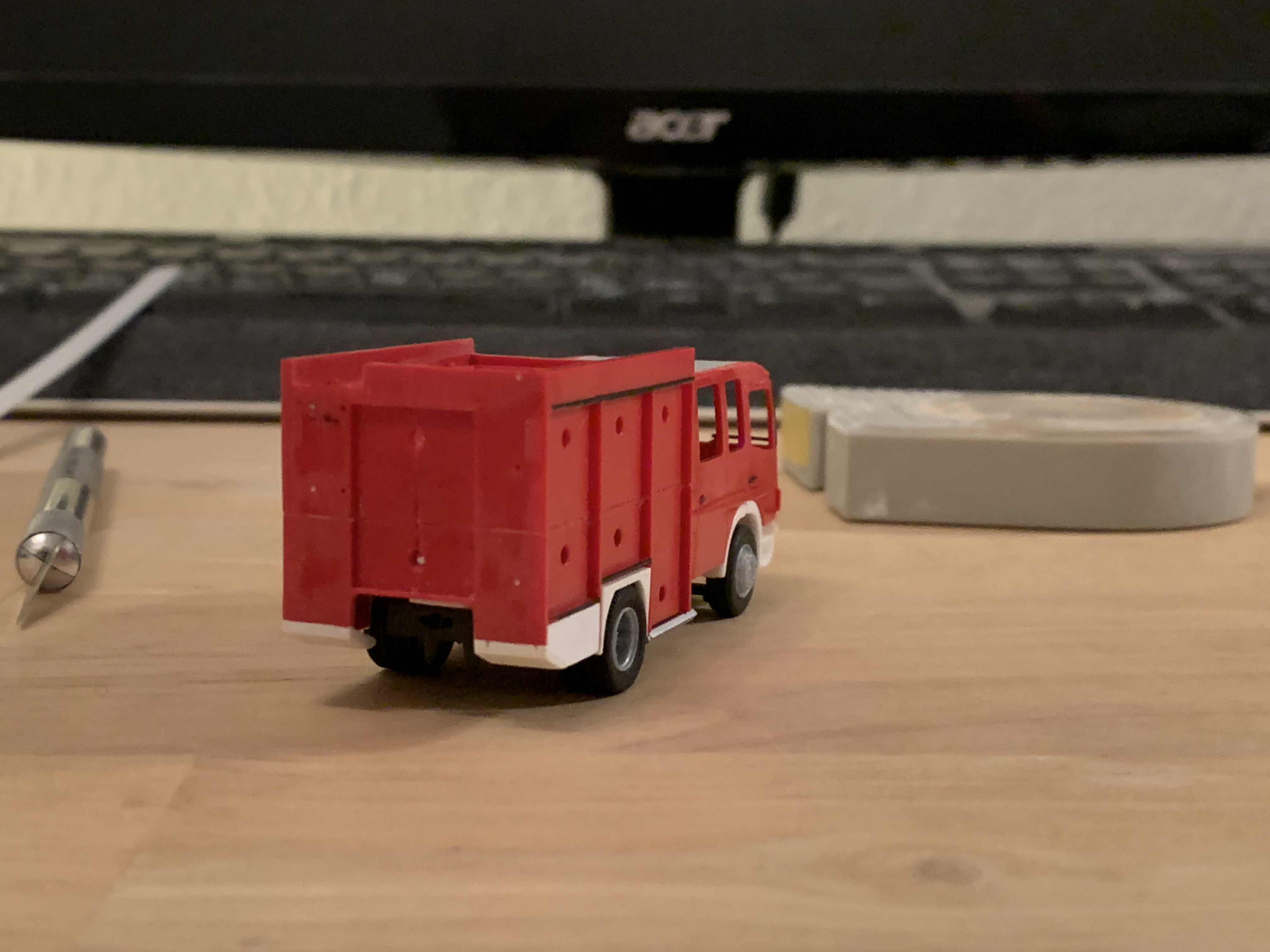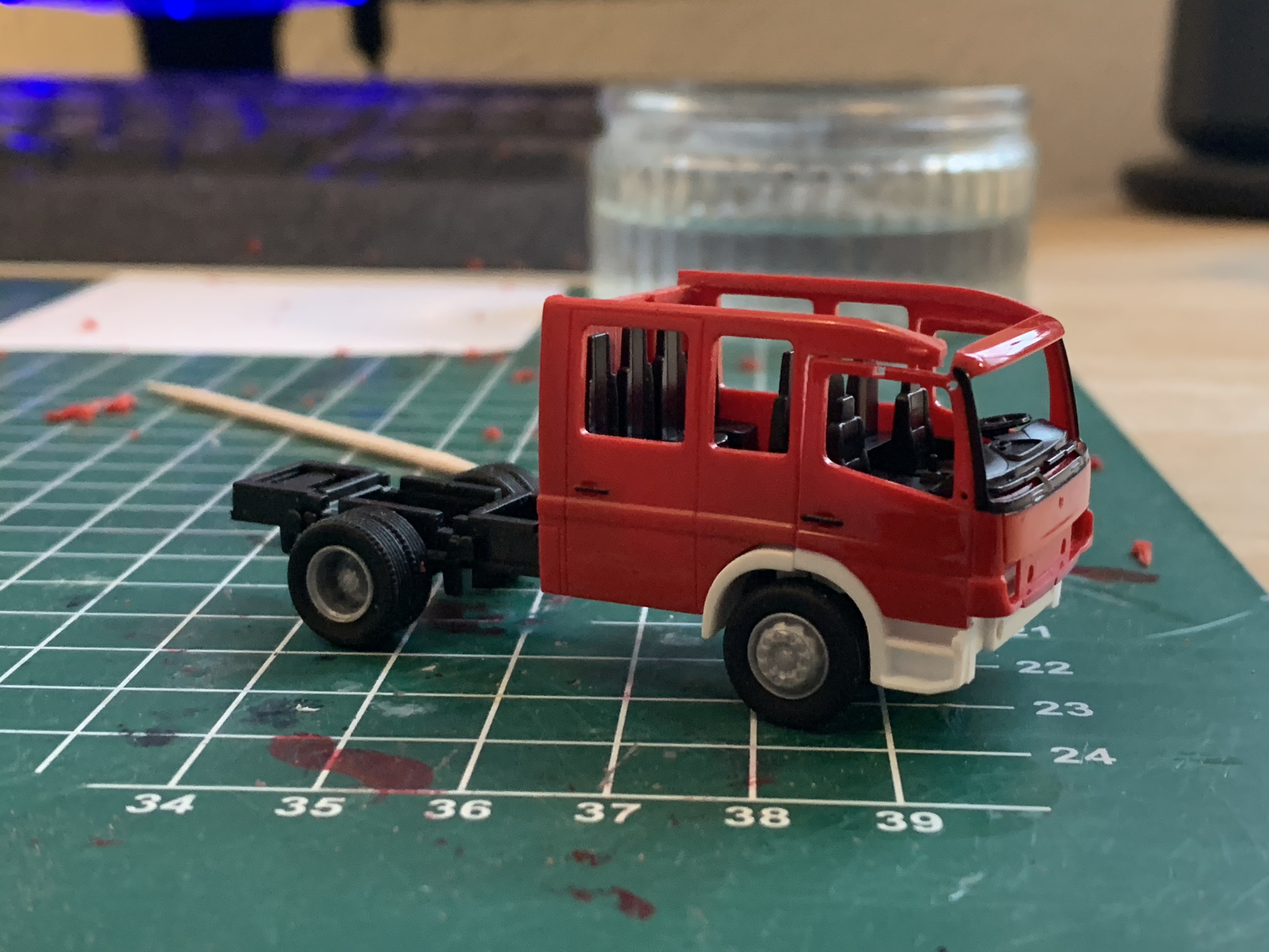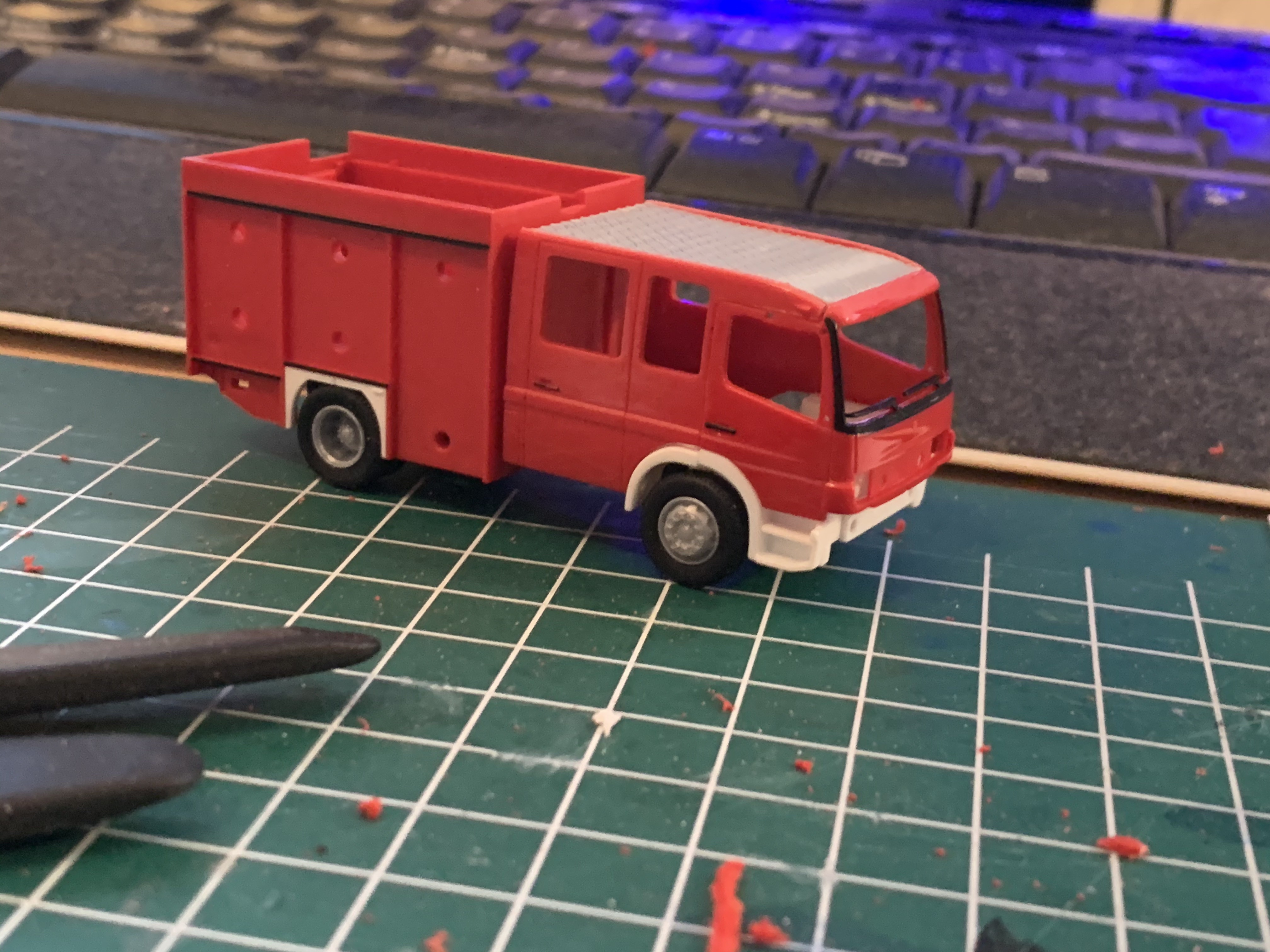 Die Kabine entstand aus einer Atego Front von Herpa. Diese wurde mit Kabinenteile von Rietze verlängert und ein neues Dach wurde eingezogen. Somit gehörte die olle Rietze Front der Vergangenheit an. Die Kotflügel wurden aus Herpa Komponenten zusammen gesetzt, so stammt der Straßeneinstieg zb. vom Herpa Z-Cab. Der Aufbau entstand aus zwei Rietze 10/6 aufbauten die durch versetzte Sägeschnitte zum Highline Aufbau zusammen gesetzt wurde. Der neu entstandene Aufbau wurde dann aber noch einmal längs durchgesägt und neu zusammen gesetzt um die Schweizer Breite darzustellen. Der hintere Traversenkasten wurde komplett neu modelliert mit Evergreen und Spachtelmasse. Die anfängliche Idee dieses Modell als Urmodell zu nutzen hatte sich schnell verworfen da hier mittlerweile in Zusammenarbeit mit TBM Modellbau ein passender Fräsbausatz mit passender Kabine als Abguss produziert werden konnte. Somit bleibt dieses HLF hier als Einzelstück erhalten. Weitere Varianten wie zb. eines der HLF von 2010 werden dann mit dem Bausatz umgesetzt.