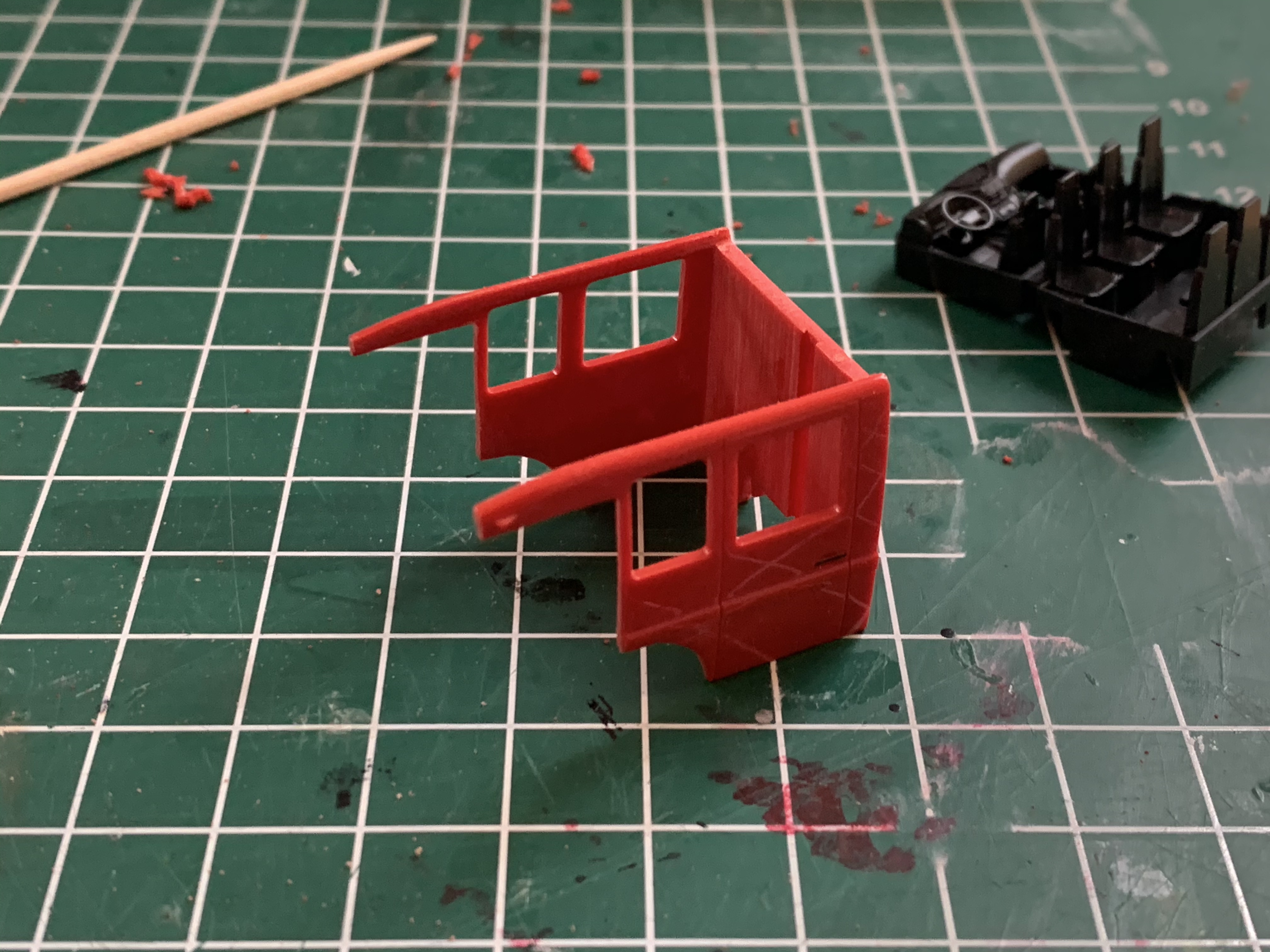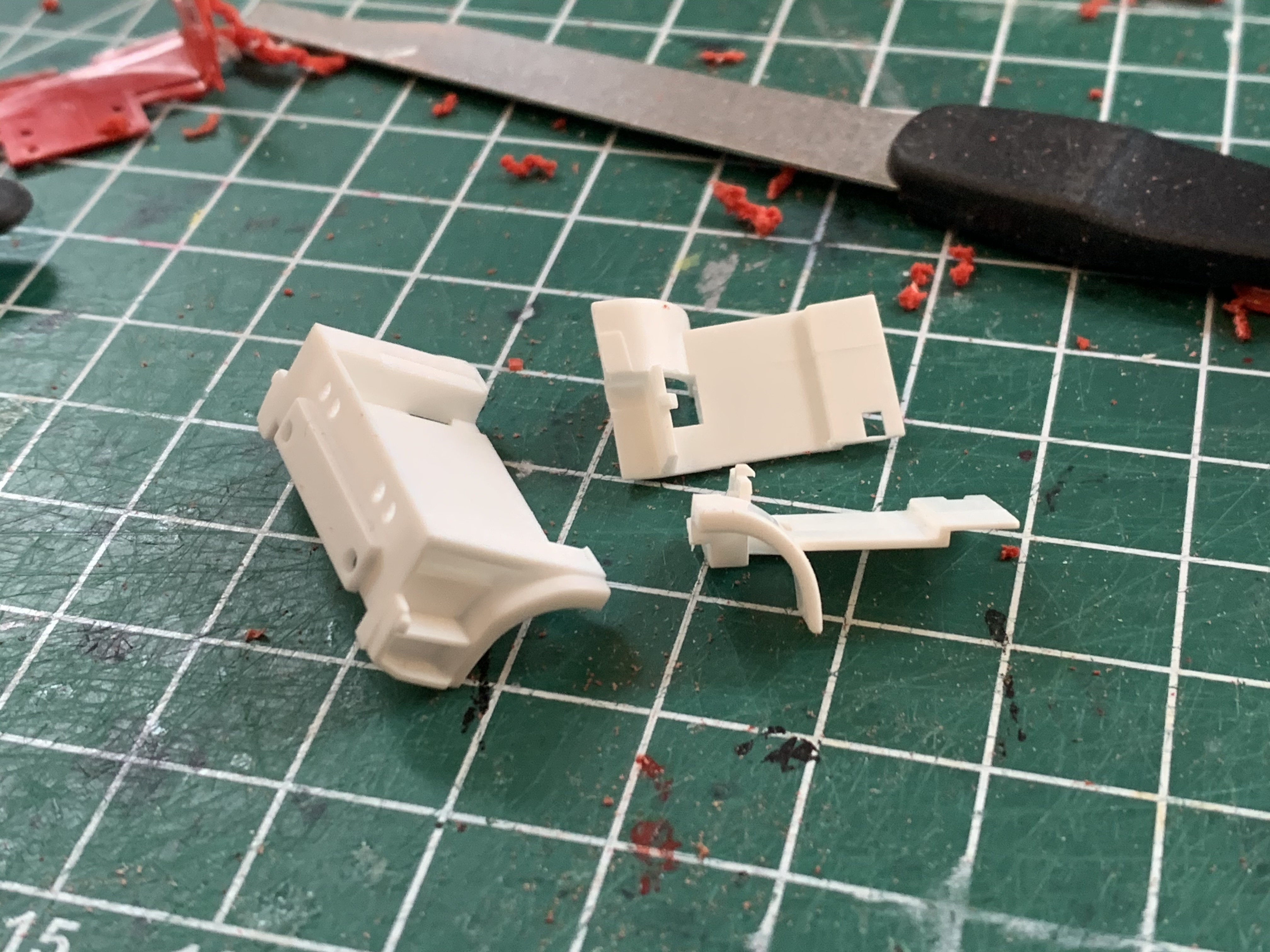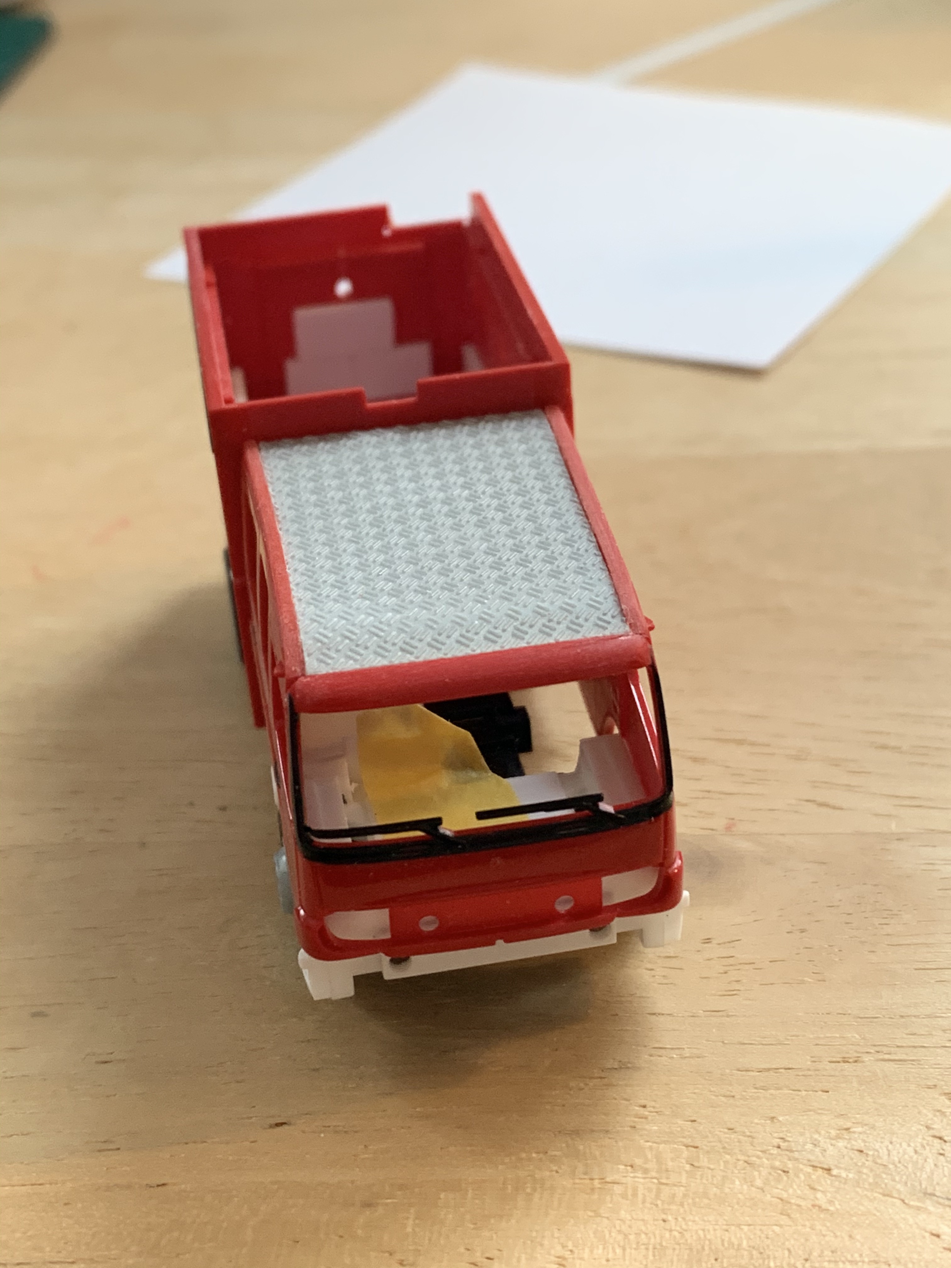 Die Kabine entstand aus einer Atego Front von Herpa. Diese wurde mit Kabinenteile von Rietze verlängert und ein neues Dach wurde eingezogen. Somit gehörte die olle Rietze Front der Vergangenheit an. Die Kotflügel wurden aus Herpa Komponenten zusammen gesetzt, so stammt der Straßeneinstieg zb. vom Herpa Z-Cab. Der Aufbau entstand aus zwei Rietze 10/6 aufbauten die durch versetzte Sägeschnitte zum Highline Aufbau zusammen gesetzt wurde. Der neu entstandene Aufbau wurde dann aber noch einmal längs durchgesägt und neu zusammen gesetzt um die Schweizer Breite darzustellen. Der hintere Traversenkasten wurde komplett neu modelliert mit Evergreen und Spachtelmasse. Die anfängliche Idee dieses Modell als Urmodell zu nutzen hatte sich schnell verworfen da hier mittlerweile in Zusammenarbeit mit TBM Modellbau ein passender Fräsbausatz mit passender Kabine als Abguss produziert werden konnte. Somit bleibt dieses HLF hier als Einzelstück erhalten. Weitere Varianten wie zb. eines der HLF von 2010 werden dann mit dem Bausatz umgesetzt.