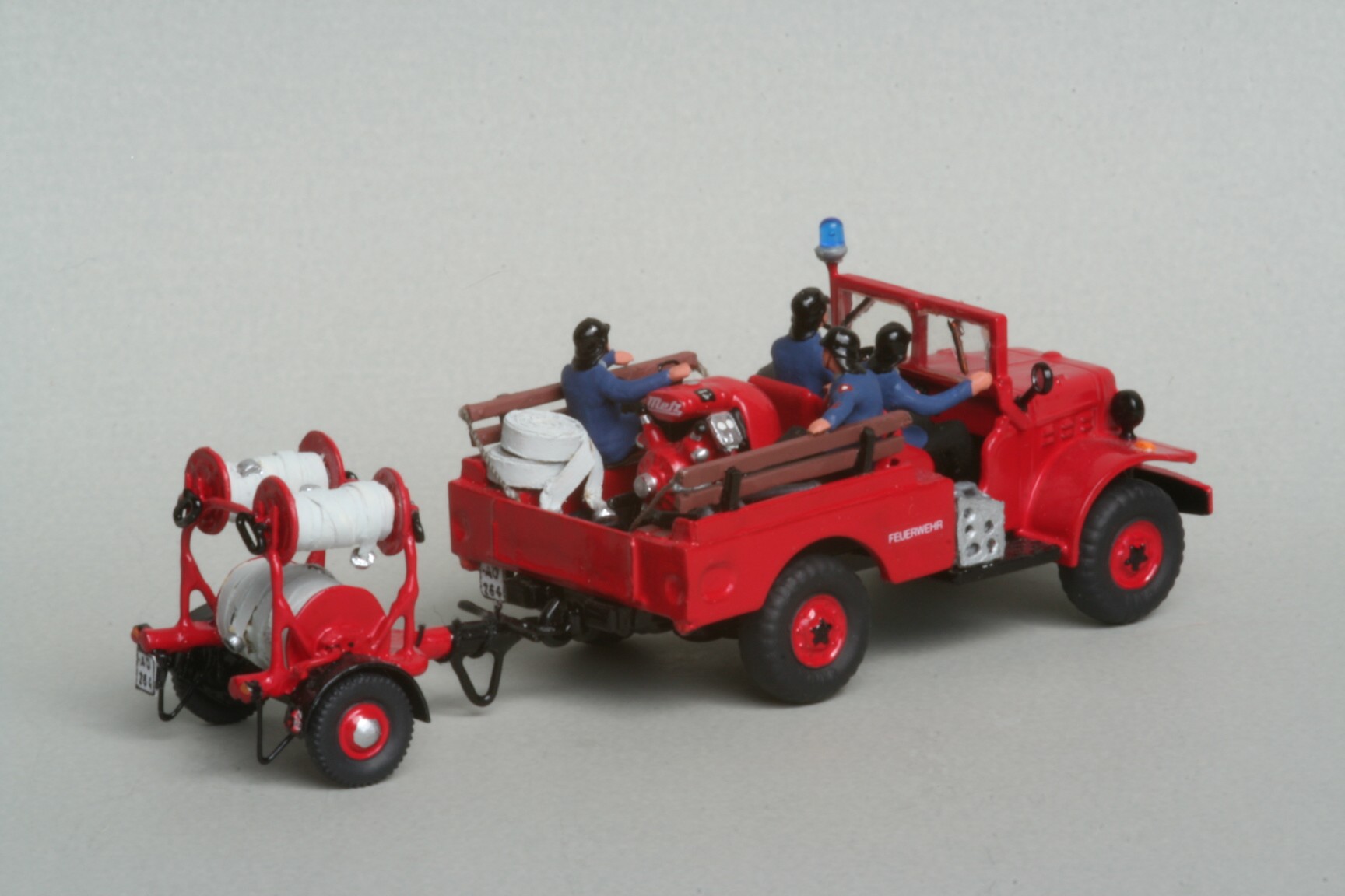 Die Preiserfiguren wurden so abgeändert, dass sie in teilweise legerer Haltung mitfahren können. Der Schlauchanhänger ist fast ein kompletter Eigenbau. Als Material kamen verschiedene Drahtstärken zum Einsatz. Nur die Räder und die C-Haspeln(Preiser) stammen aus vorhandenen Produkten. Die Schläuche auf den Haspeln bestehen aus Papierstreifen, die an einigen Stellen mit Kupplungen aus dem Preiserprogramm verziert wurden.