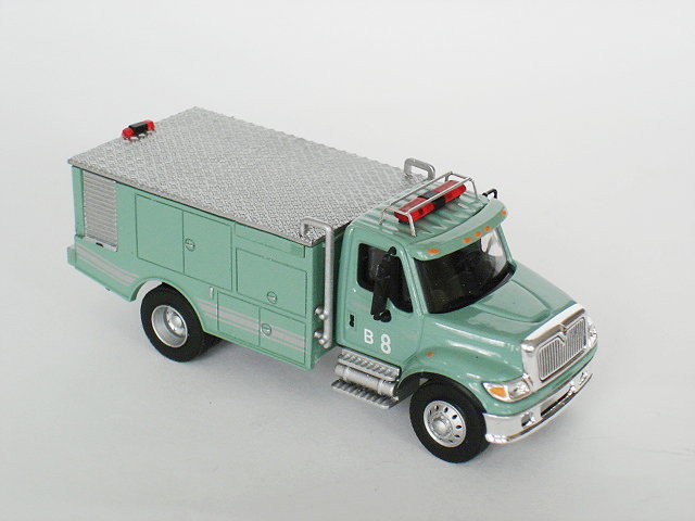 Gesamte Dachaufbauten entfernt und seitlichen Mulden für die Schlauchhaspeln ausgekleidet. Riffelblechplatte als neues Dach angebracht. Hinten eine Stütze eingebaut sowie zwei Gerätefächer mit Rolloplatten von Preiser erstellt. Neuer Warnbalken mit Astabweiser, neue Spiegel, Innenraum schwarz lackiert und Decals.